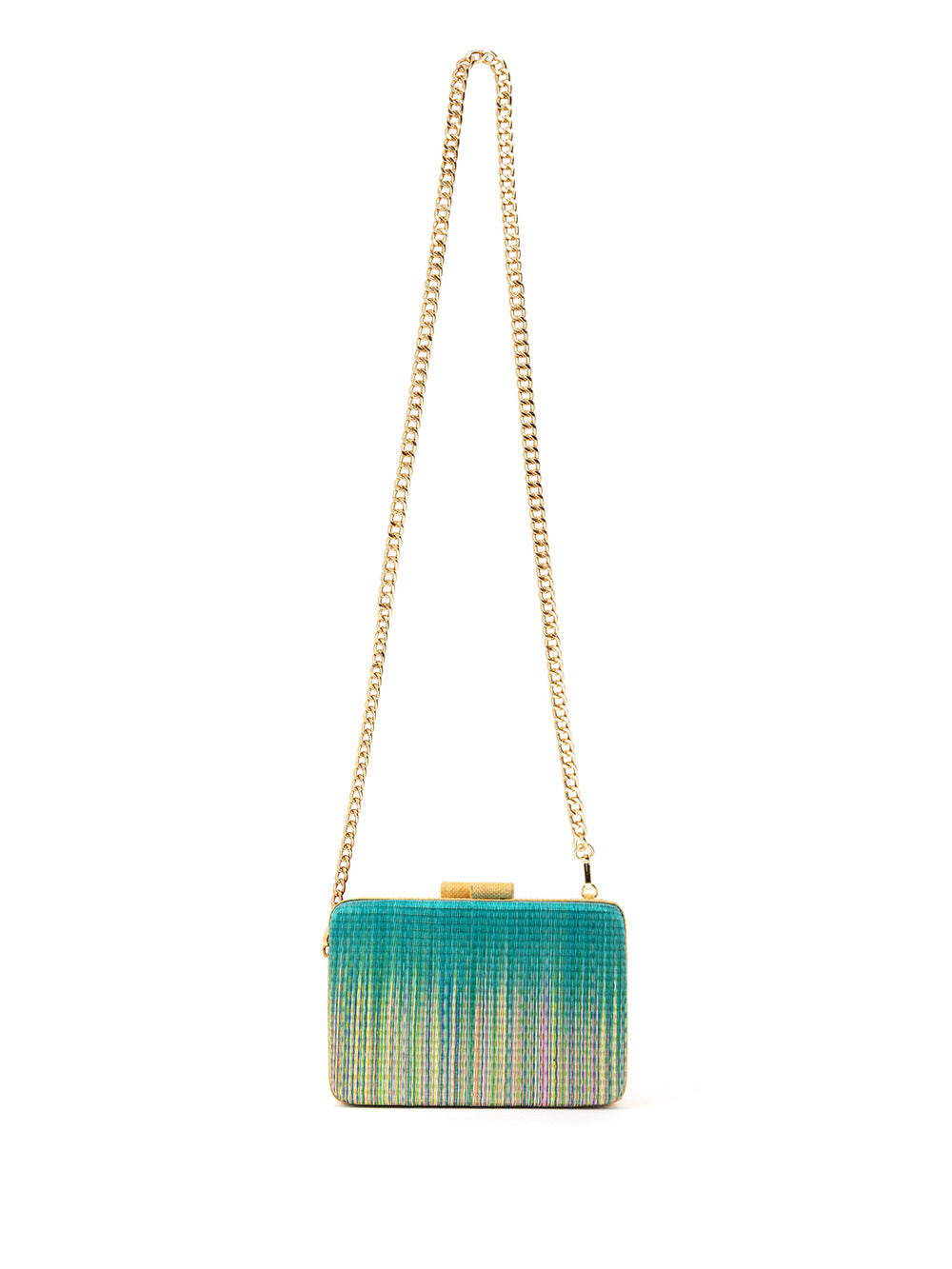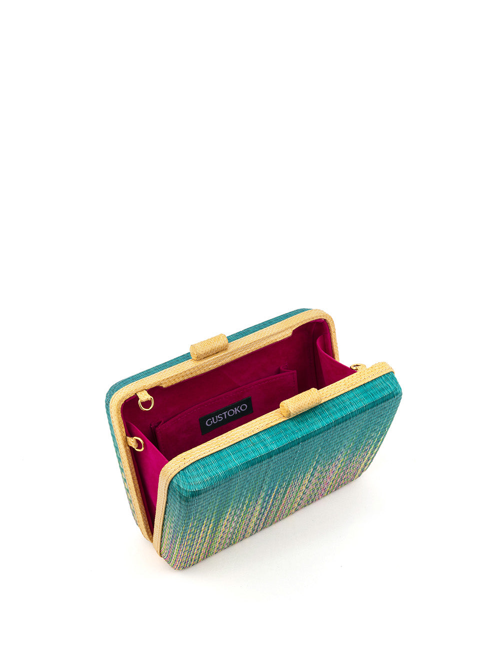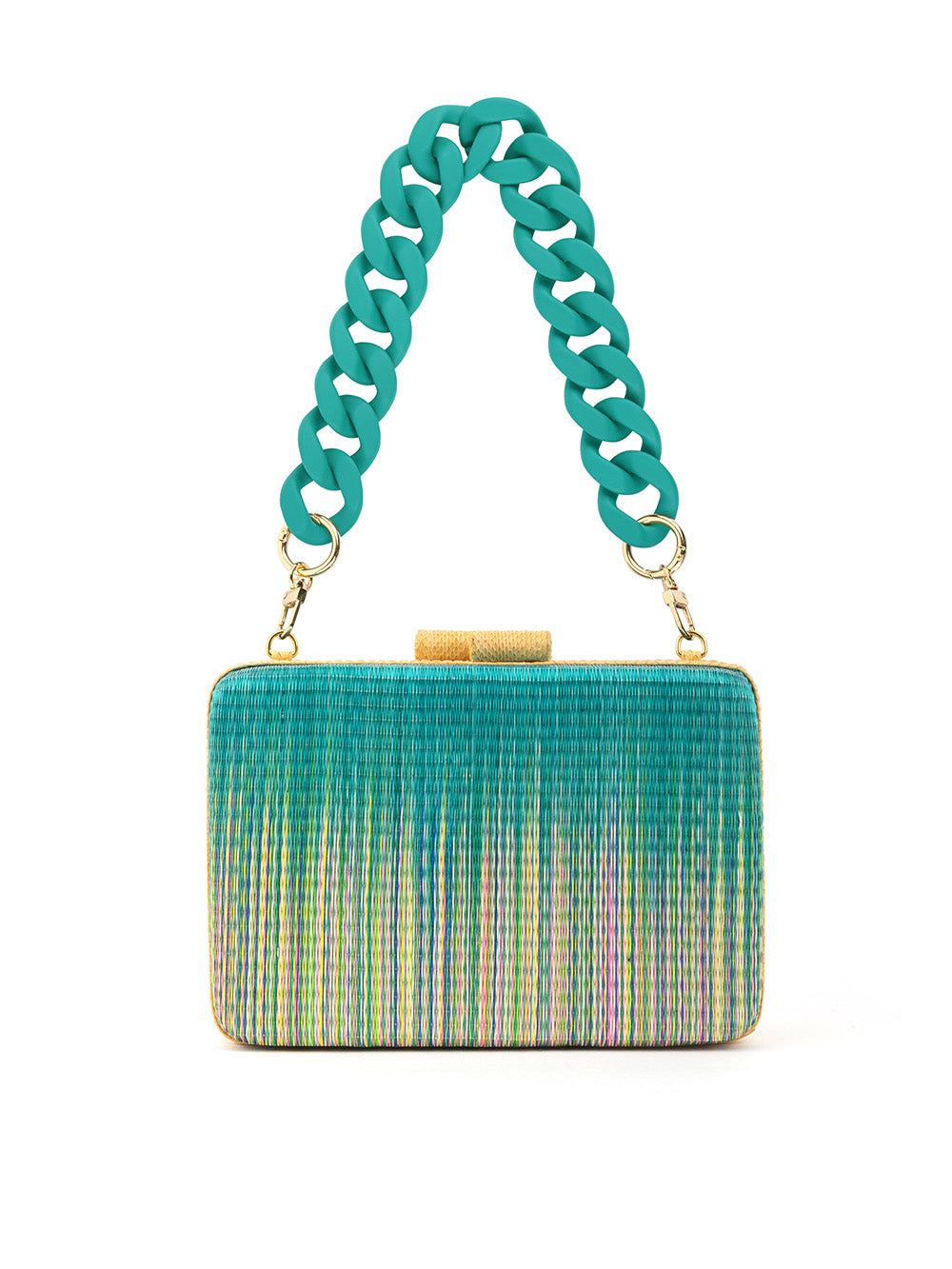 Sac Saint-Tropez signé Gustoko, dessiné au Portugal et fabriqué à la main aux Philippines. Il est réalisé par des communautés au savoir-faire ancestral en fibres naturelles de buntal couleur turquoise avec dégradé multicolore, et garniture en cuir de serpent. Fermeture à bouton pression magnétique. Chaine courte en acrylique et chaine longue en métal doré.