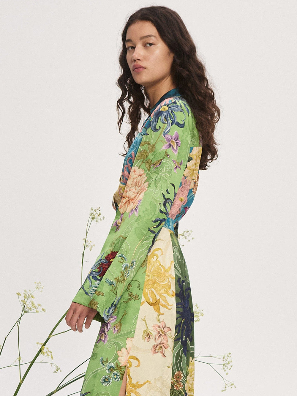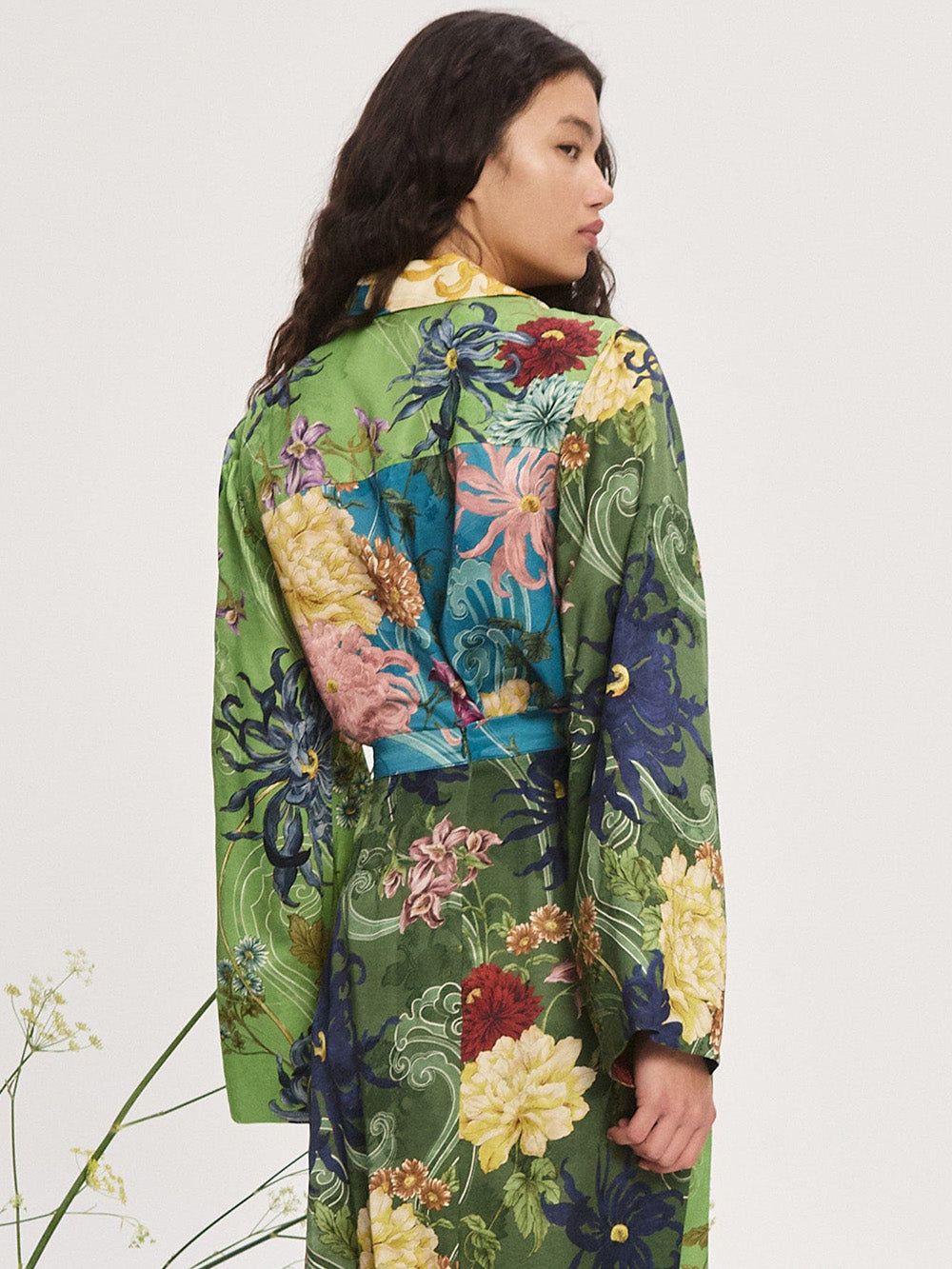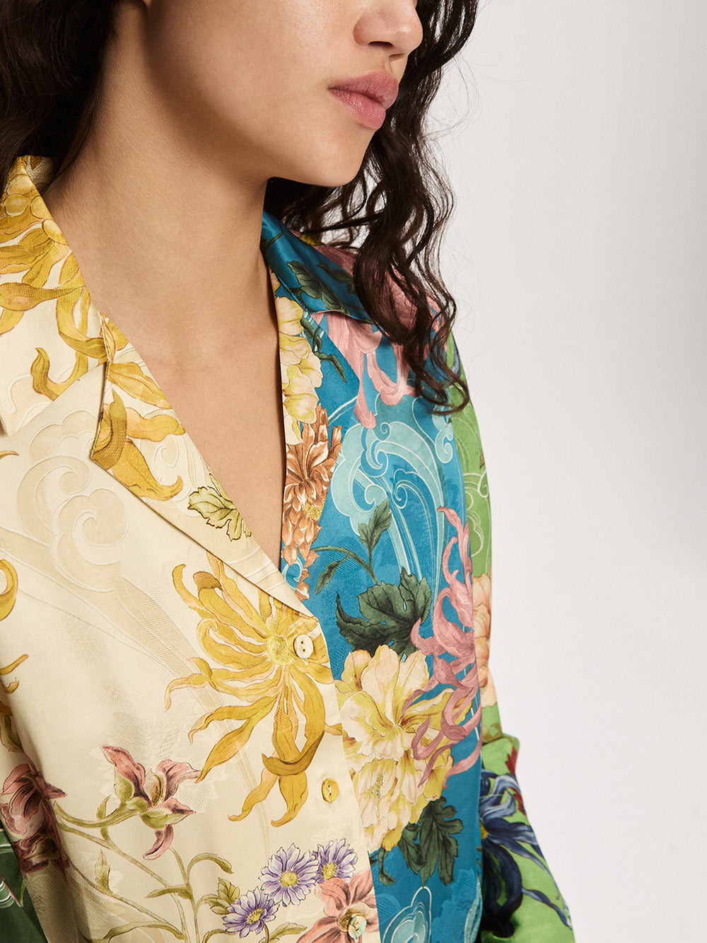 Chemise Avery Spliced signée Alémais confectionnée dans un tissu satiné imprimé de dahlias sur un fond patchwork. Une chemise à la coupe évasée dans les tons vert, bleu, jaune et rose.