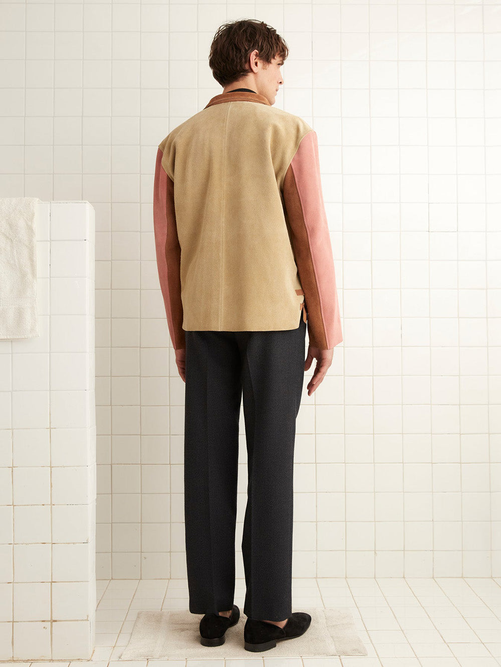 Chemise de Travail signé Bode confectionnée en cuir suede rose poudré et beige. Une coupe inspiré des blouse de travail des années 1960-1970.