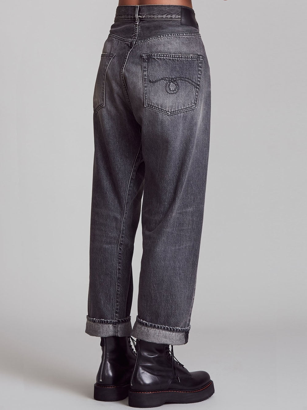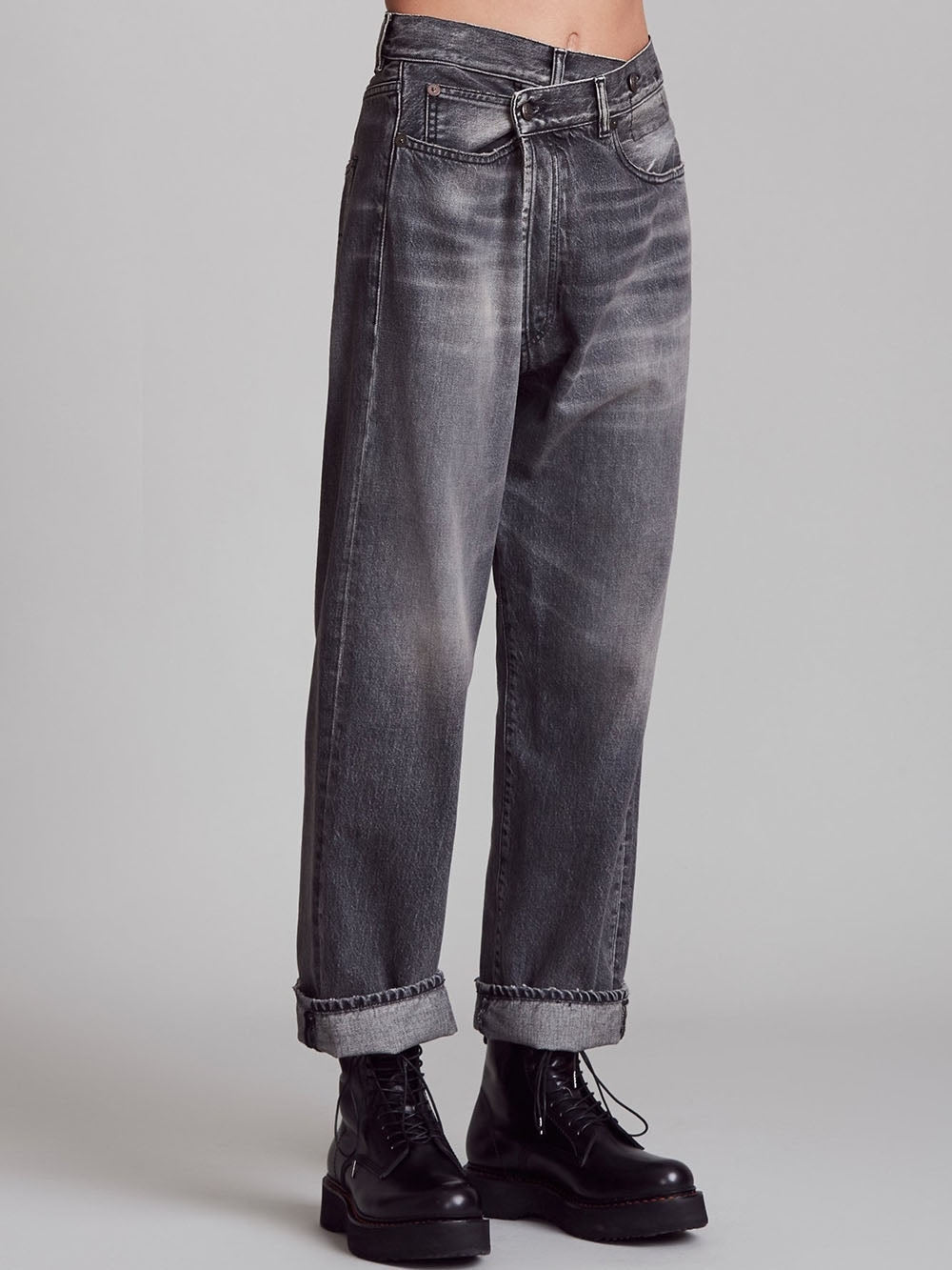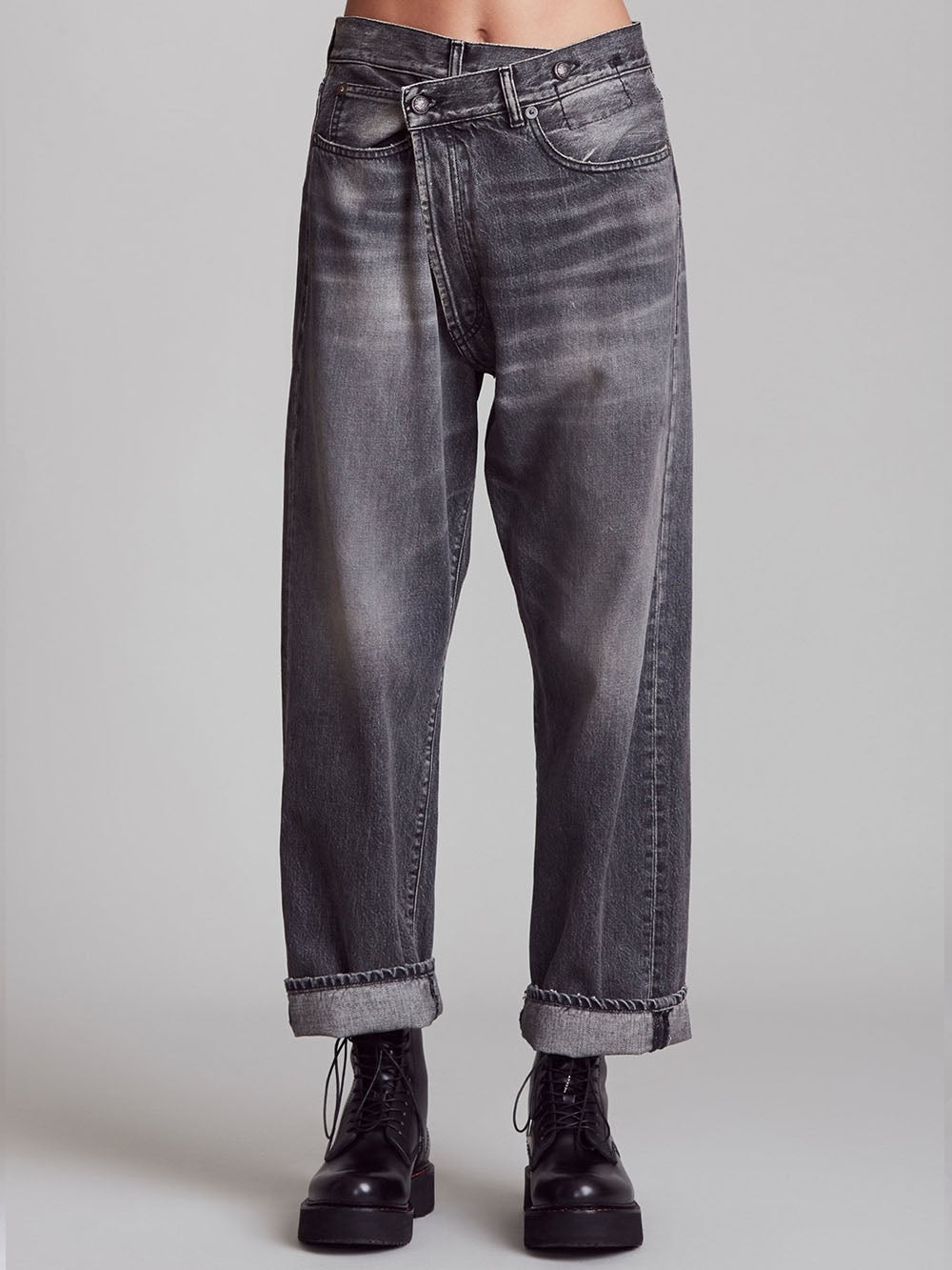 Jean Cross Over R13. Ce jean est doté d'une taille asymétrique et croisée qui forme un V flatteur. Il se ferme à l'aide d'un bouton. La pièce est réalisée en denim italien rigide qui a été délavé et vieilli pour rappeler un modèle vintage. Le jean présente des jambes larges qui se terminent sur des ourlets.