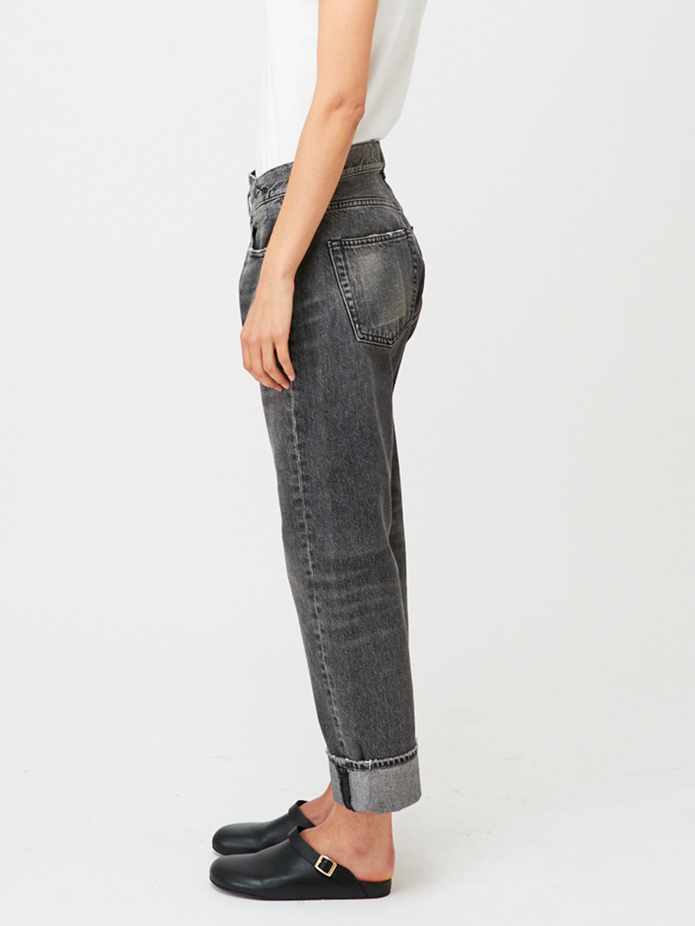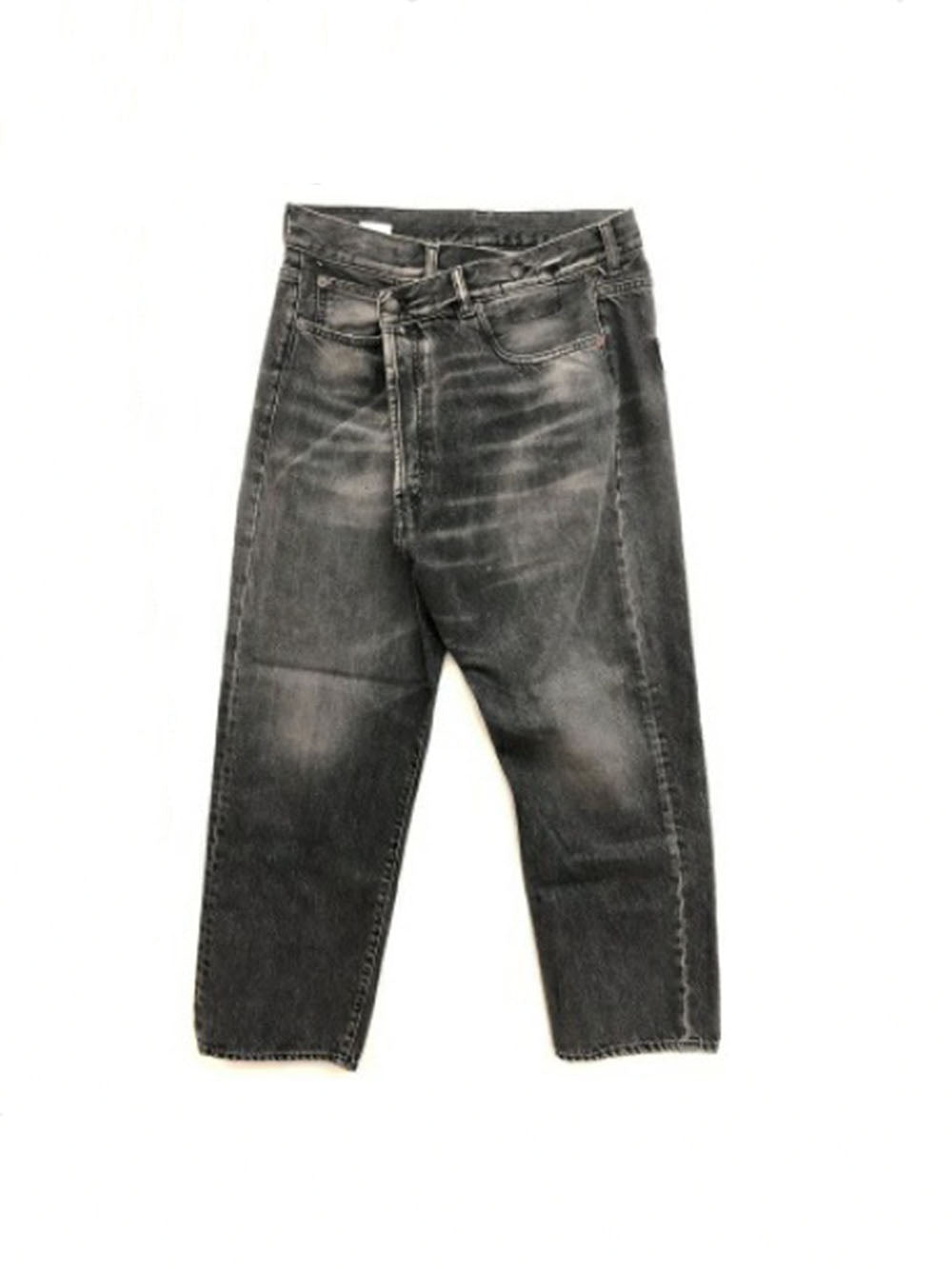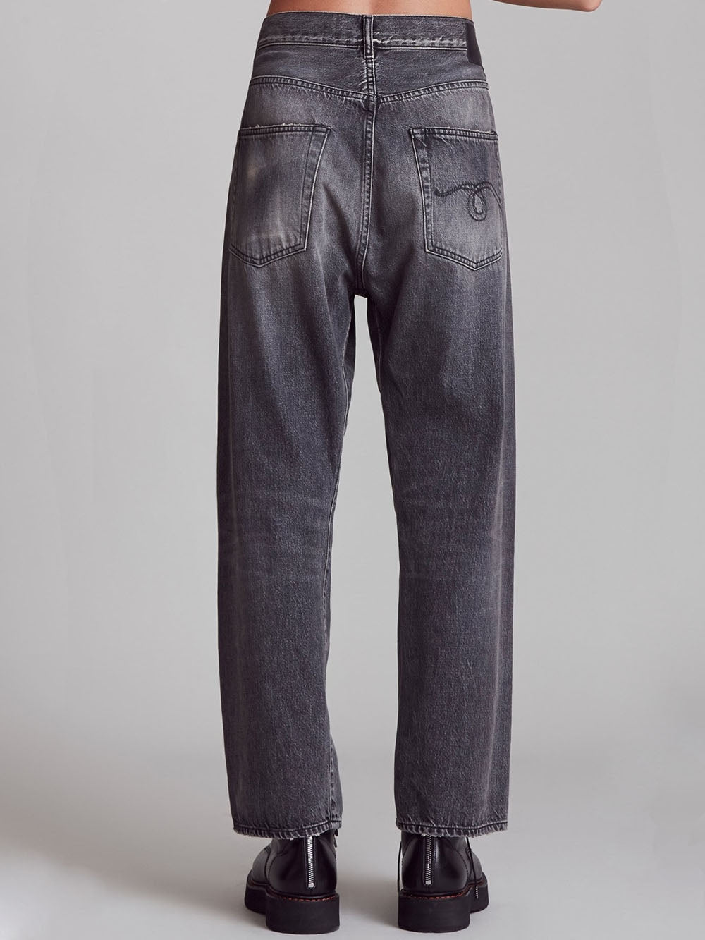 Jean Cross Over R13. Ce jean est doté d'une taille asymétrique et croisée qui forme un V flatteur. Il se ferme à l'aide d'un bouton. La pièce est réalisée en denim italien rigide qui a été délavé et vieilli pour rappeler un modèle vintage. Le jean présente des jambes larges qui se terminent sur des ourlets.