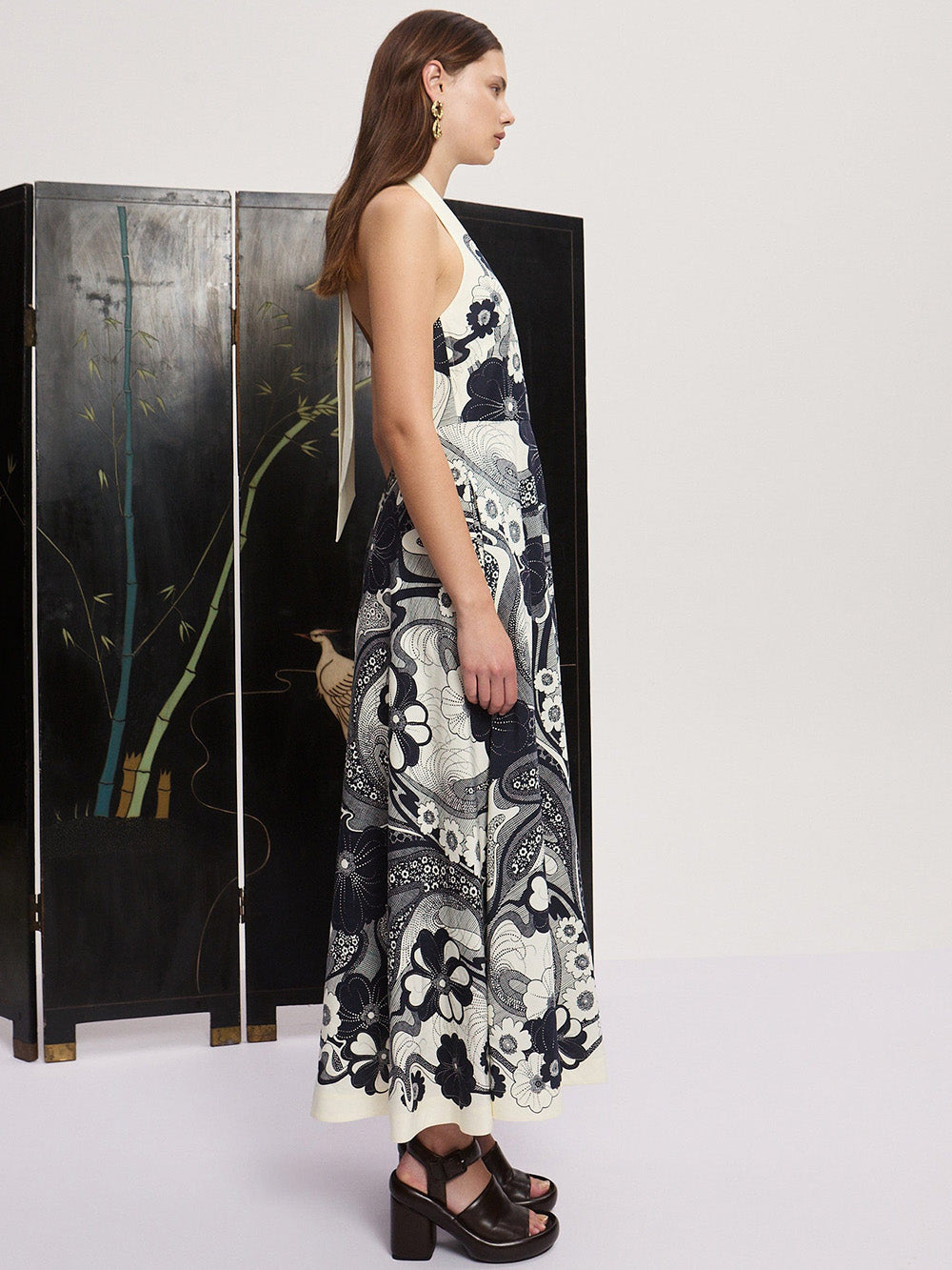 Robe Midi Mickey signée Alémais confectionnée en lin de couleur crème imprimé de motifs floraux abstraits bleu marine. Une robe longueur midi au col licou se nouant dans le dos.