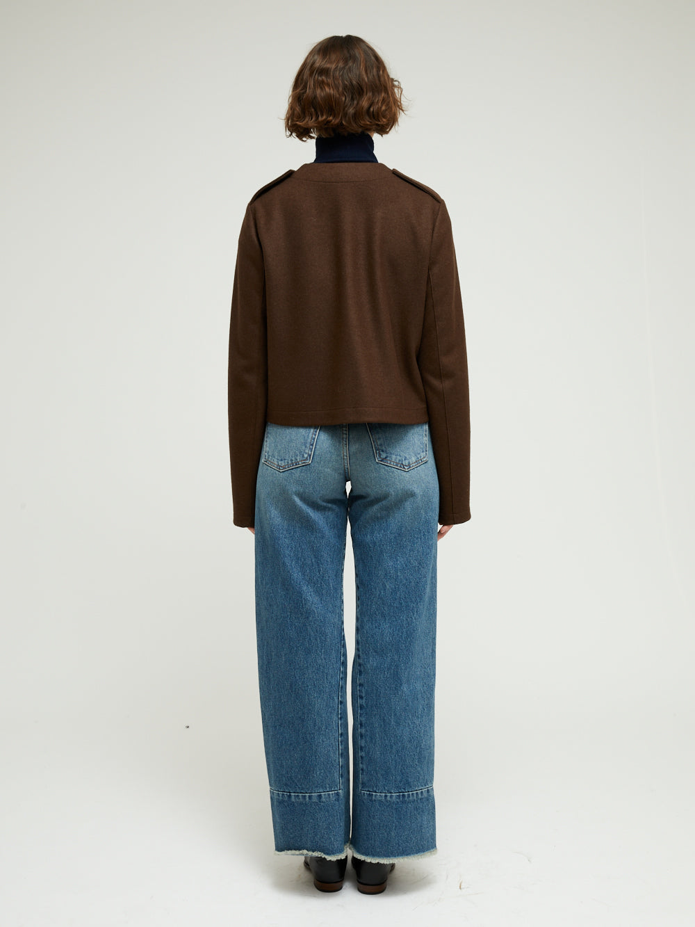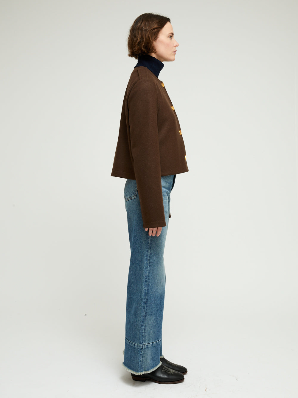 Veste courte signée Harris Wharf London confectionnée en un mélange de laine et de cachemire marron. Une veste à la coupe droite classique se fermant par boutons sur le devant.