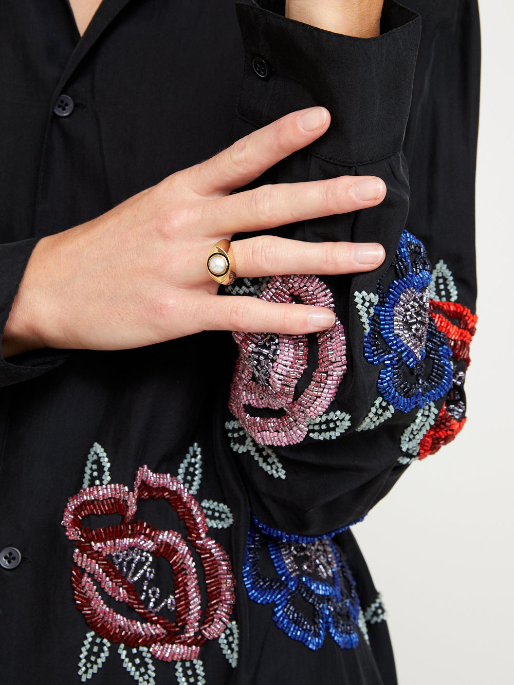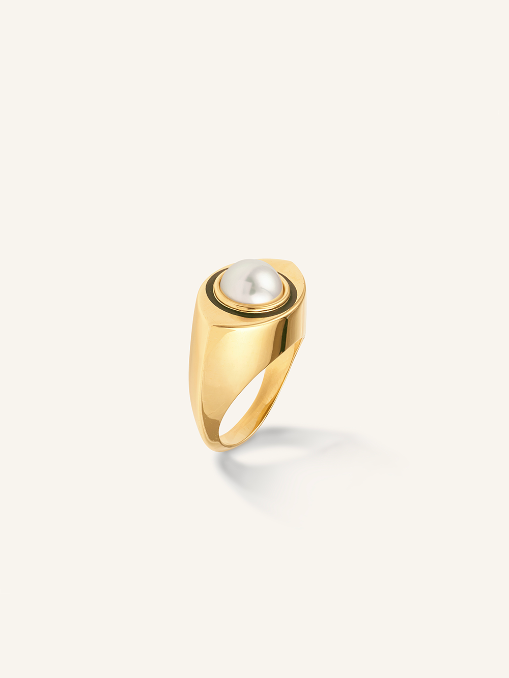 La bague Oudjat Uma signée Salomé Rico est un véritable talisman. L'oeil de protection inspiré de l'Égypte antique se dessine au centre de cette bague Tank grâce à une perle Akoya entourée de laque noire. La base de la bague est en or jaune 18 carats.