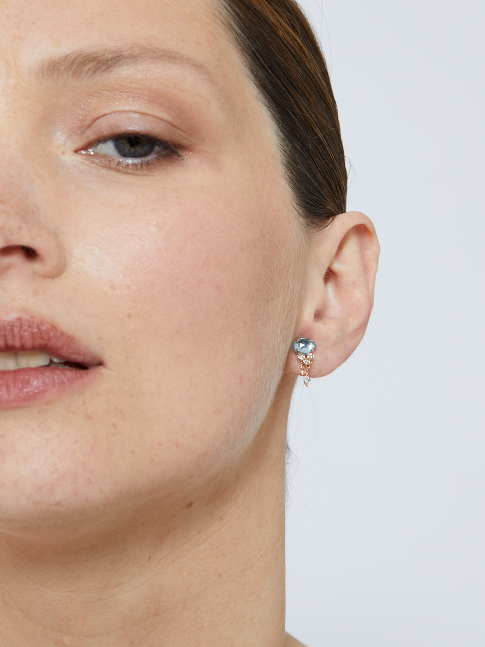 Boucle d'oreille Jellyfish signée Céline Daoust confectionnée en aigue-marine montée sur de l'or jaune 14 carats. Chaque pierre précieuse a été sélectionnée à la main par Céline Daoust lors de ses voyages à l'étranger.