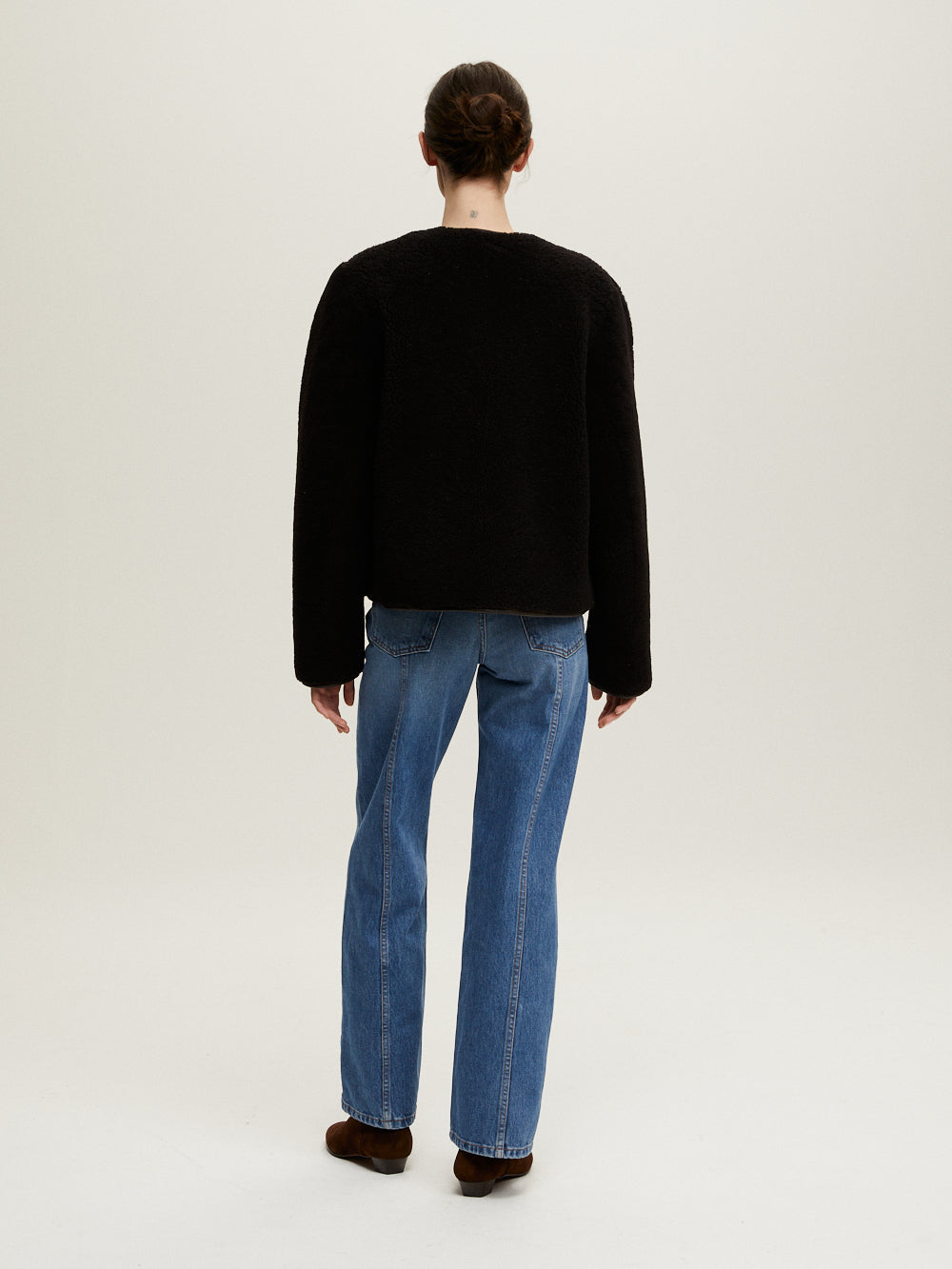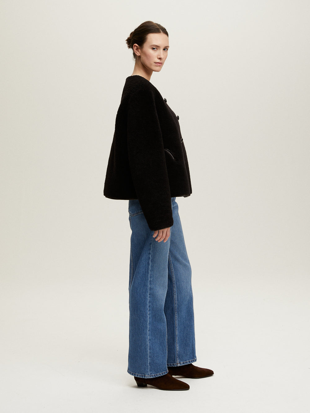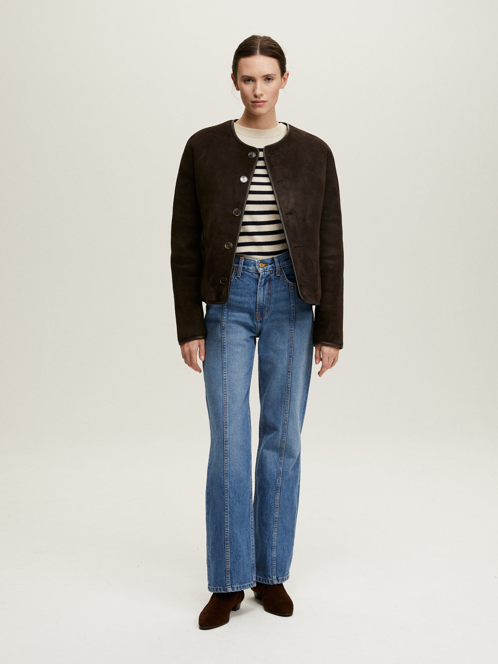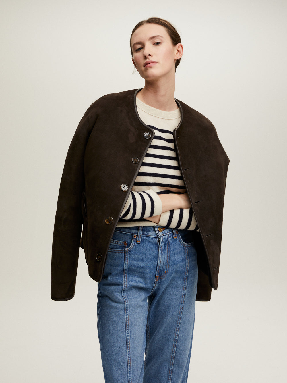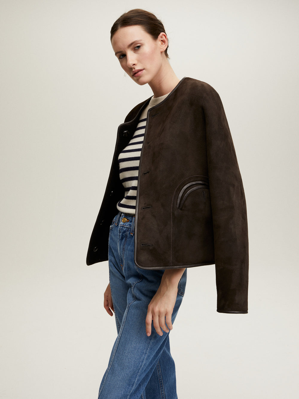 Bolero Gliss Tatoosh Dark Chocolate signé Blazé Milano confectionné en peau retournée avec un côté en suède marron foncé et un côté en peau de mouton noire. Une veste courte réversible décoré de bordures contrastantes en cuir noir.