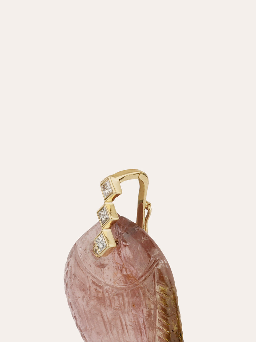 Pendentif Poisson signé Violette Joaillerie confectionné en tourmaline rose aux reflets vert sur le côté. Une bélière en diamants losanges et saphirs pendant de couleur verte au niveau de la queue.