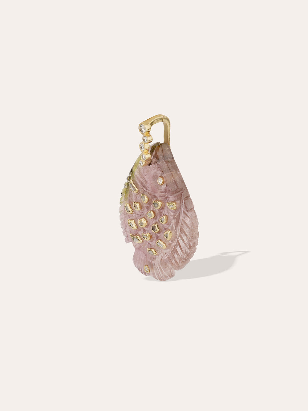 Pendentif Poisson signé Violette Joaillerie confectionné en tourmaline rose avec un reflet vert sur le côté, le tout serti de diamants polki aux formes aléatoires. Une pièce unique.