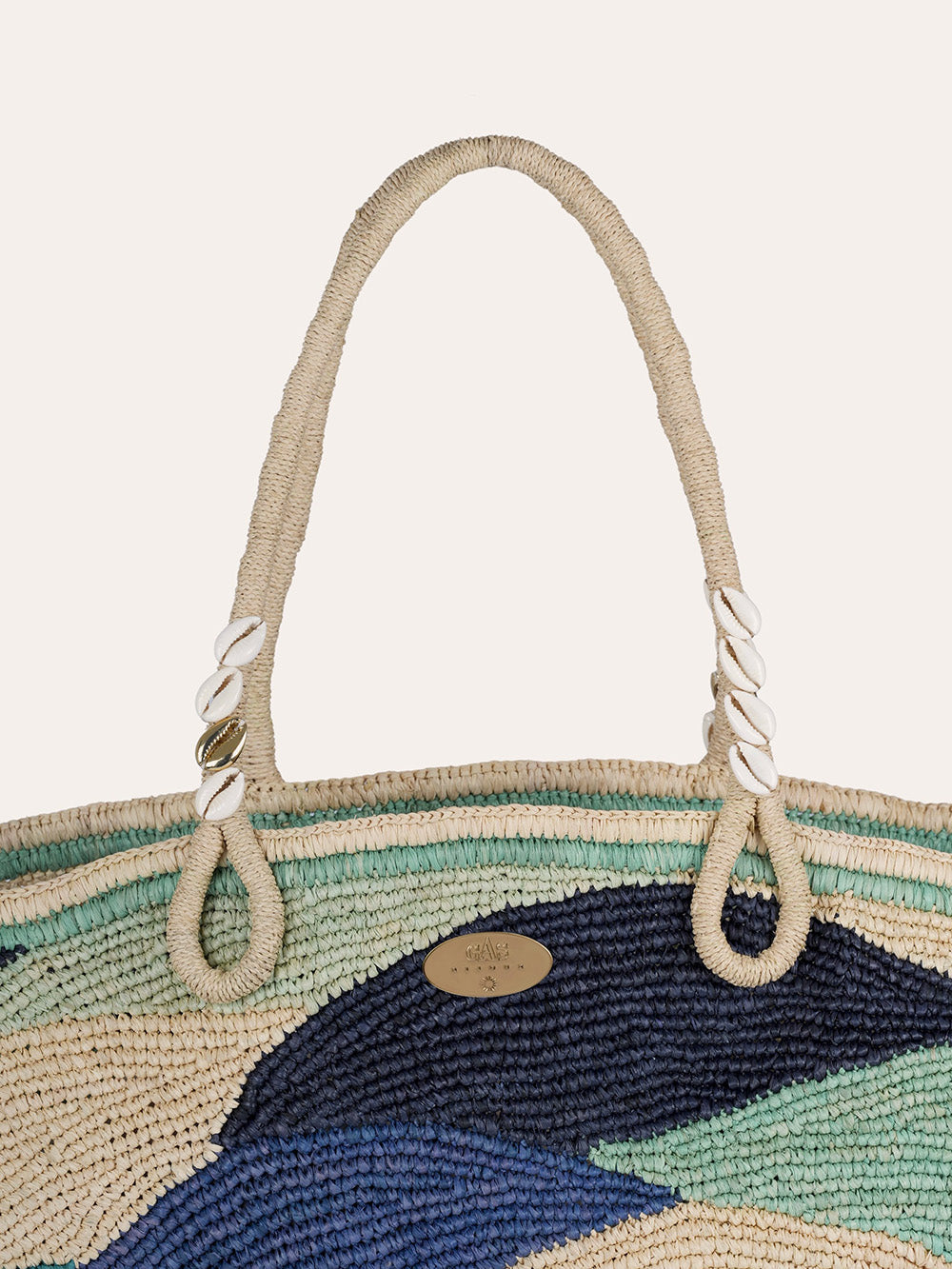 Panier Les Salins signé Gas Bijoux tressé à la main à Madagascar en raphia de couleur naturelle et de différentes teintes de bleu. Un sac cabas décoré de coquillages au niveau des hanses, idéal pour compléter vos looks de l'été.