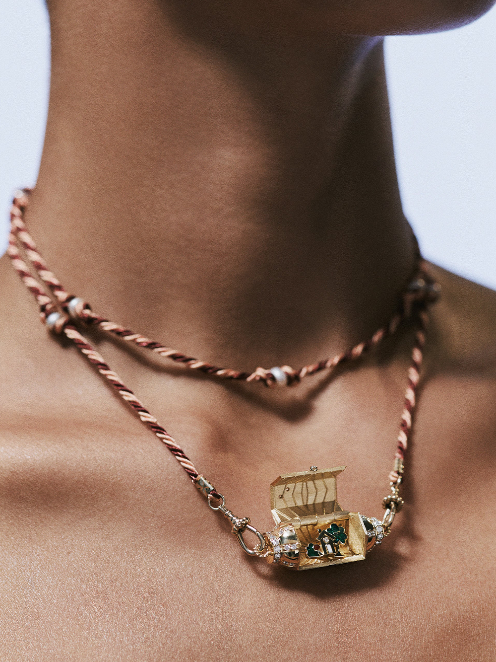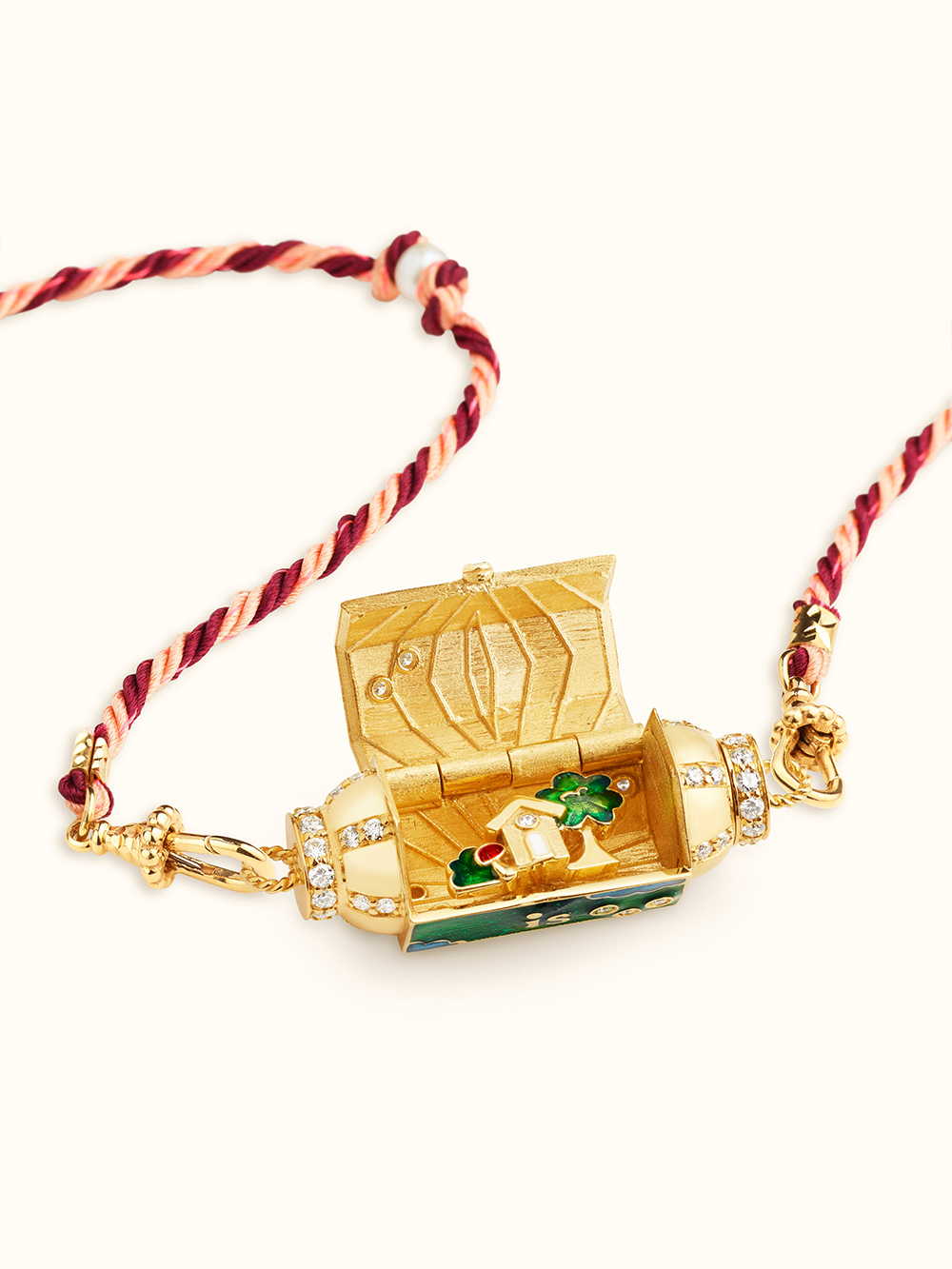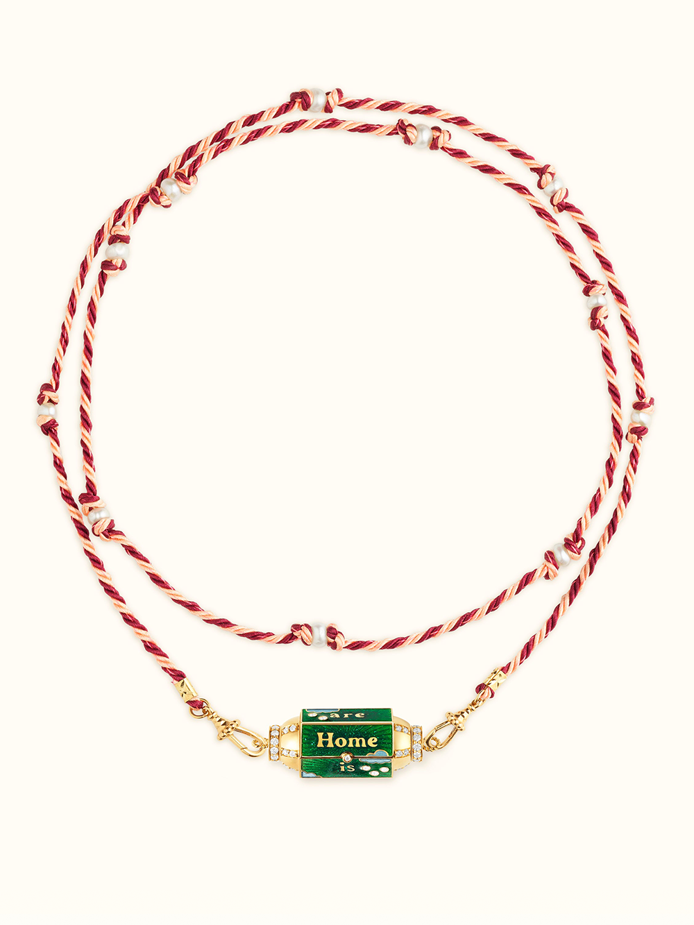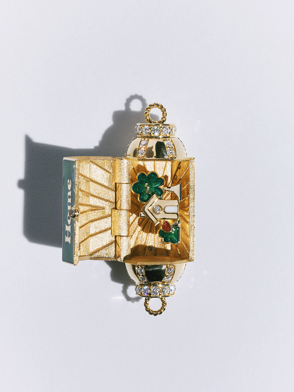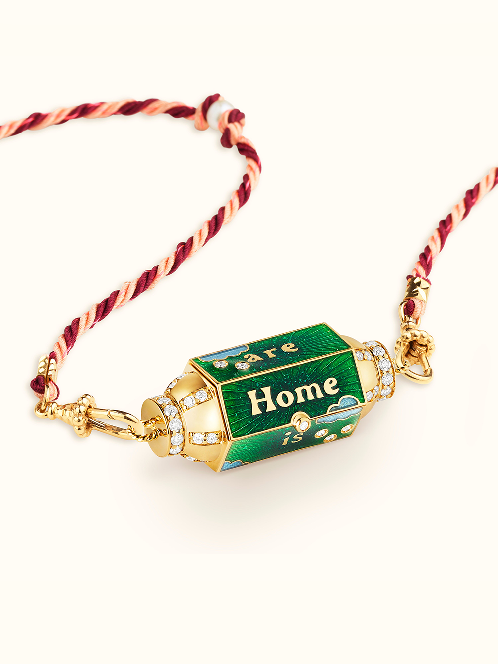 Le collier Home is Everywhere est réalisé par Marie Lichtenberg en or jaune 18 carats. Serti de diamants, le locket porte l'inscription "Home is Everywhere you are" et renferme une maison placée sur trembleuse avec un diamant au centre.