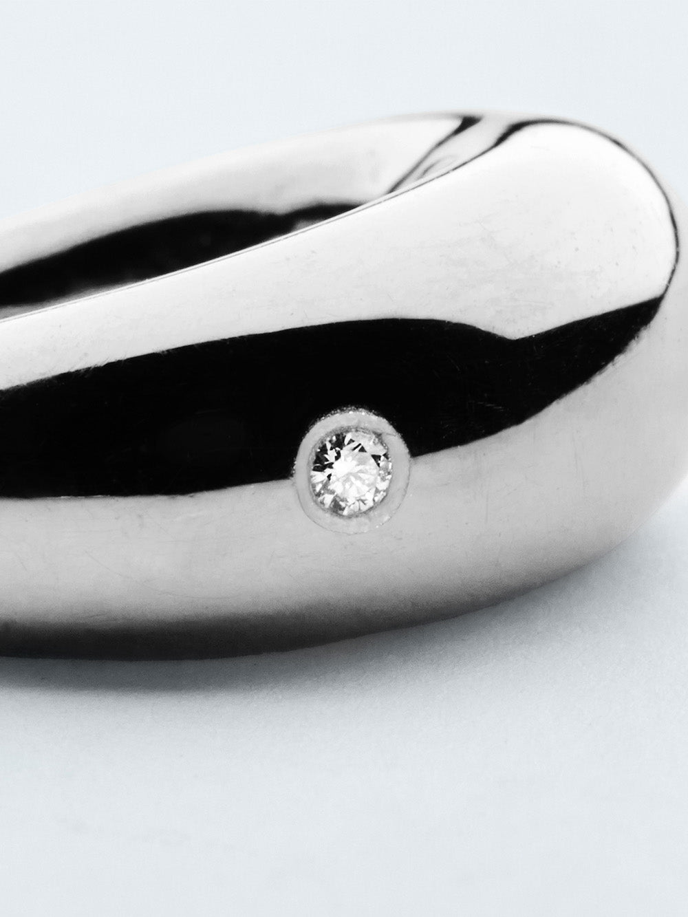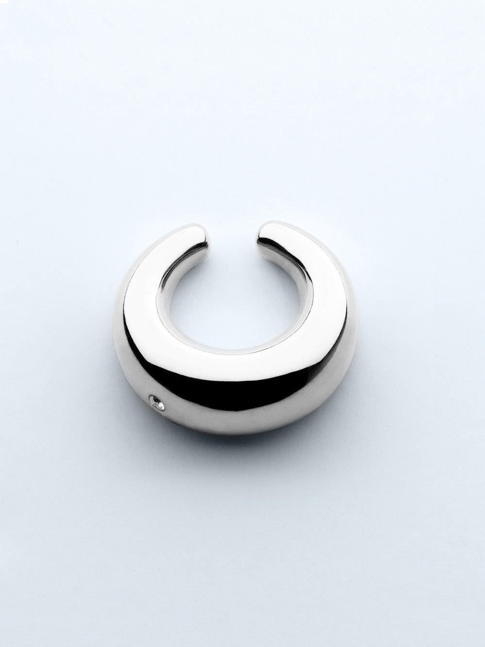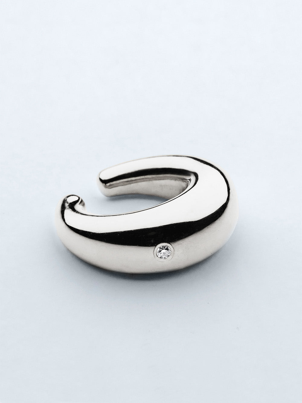 Manchette d'Oreille Criolla Grande signée Luminous 27 confectionnée en argent 925 plaqué de rhodium décoré d'un diamant taille brillant sur le côté. Une ear cuff au design bombé qui se pose délicatement sur le côté de l'oreille.