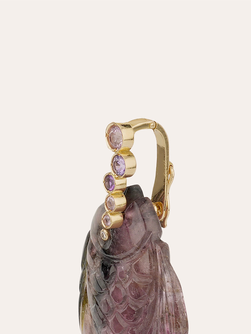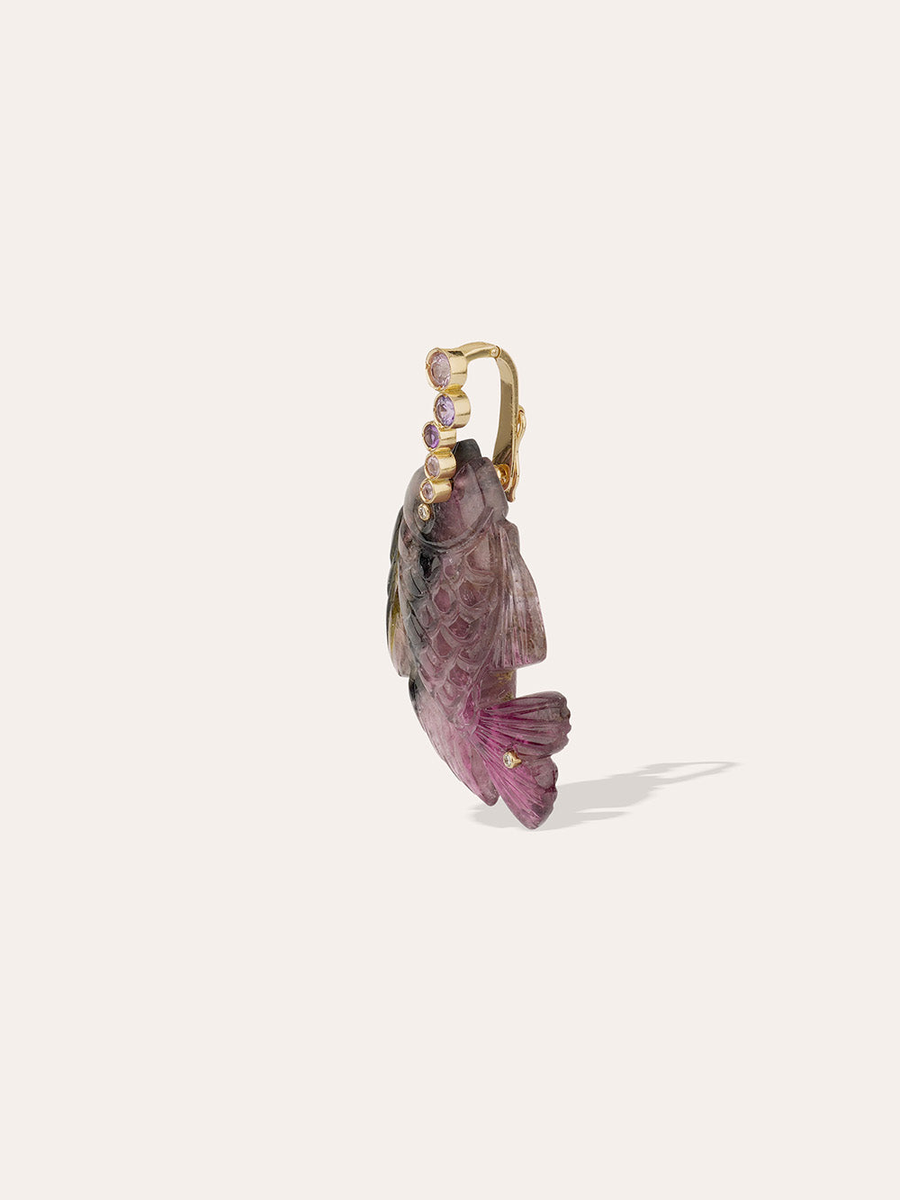 Pendentif Poisson Grand Modèle signé Violette Joaillerie confectionné en tourmaline aux reflets violet, rose et noir à la bélière en saphirs violet et rose imitant la forme de bulles. Une pièce unique.