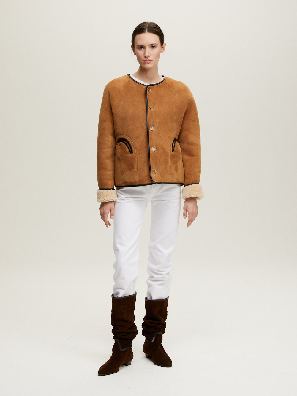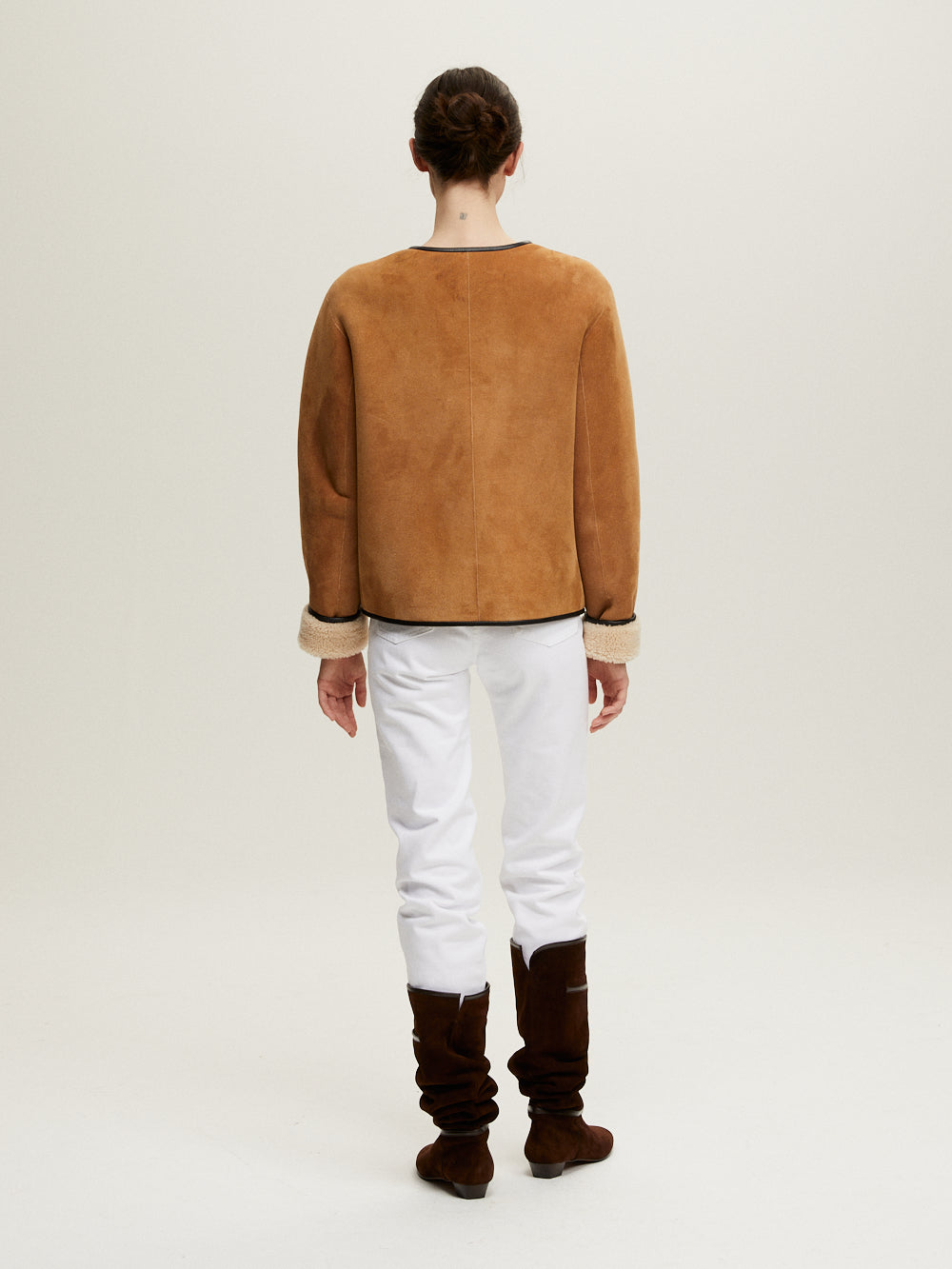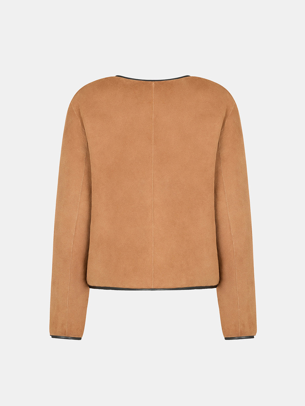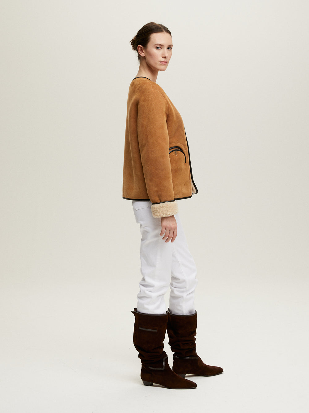 Bolero Gliss Tatoosh Camel signé Blazé Milano confectionné en peau retournée avec un côté en suède camel et un côté en peau de mouton crème. Une veste courte réversible décoré de bordures contrastantes en cuir noir.