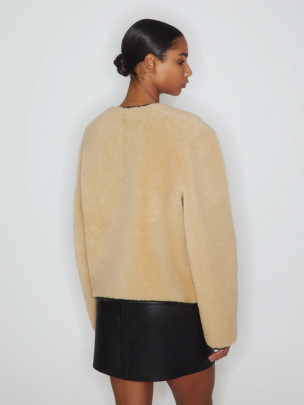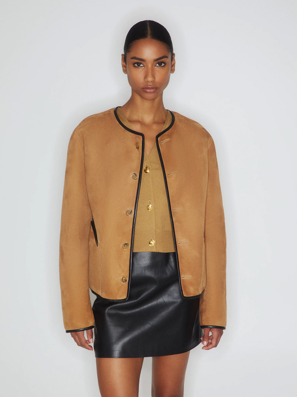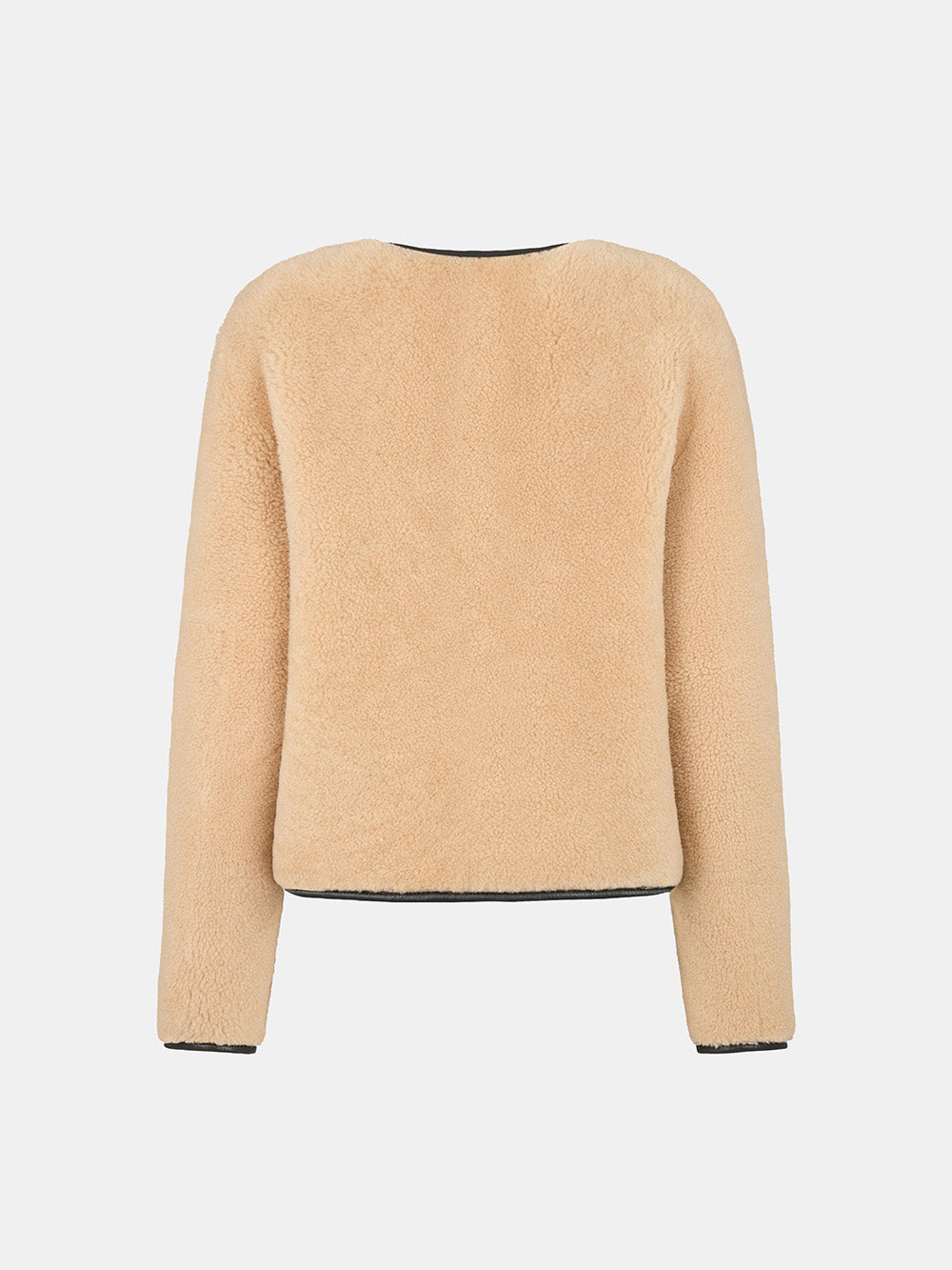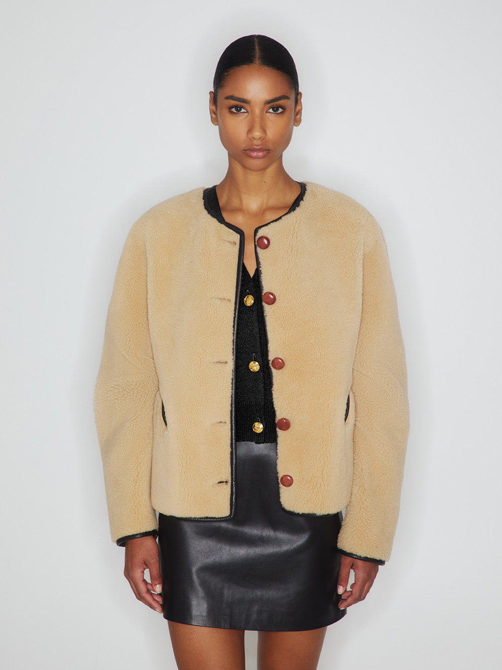 Bolero Gliss Tatoosh Camel signé Blazé Milano confectionné en peau retournée avec un côté en suède camel et un côté en peau de mouton crème. Une veste courte réversible décoré de bordures contrastantes en cuir noir.