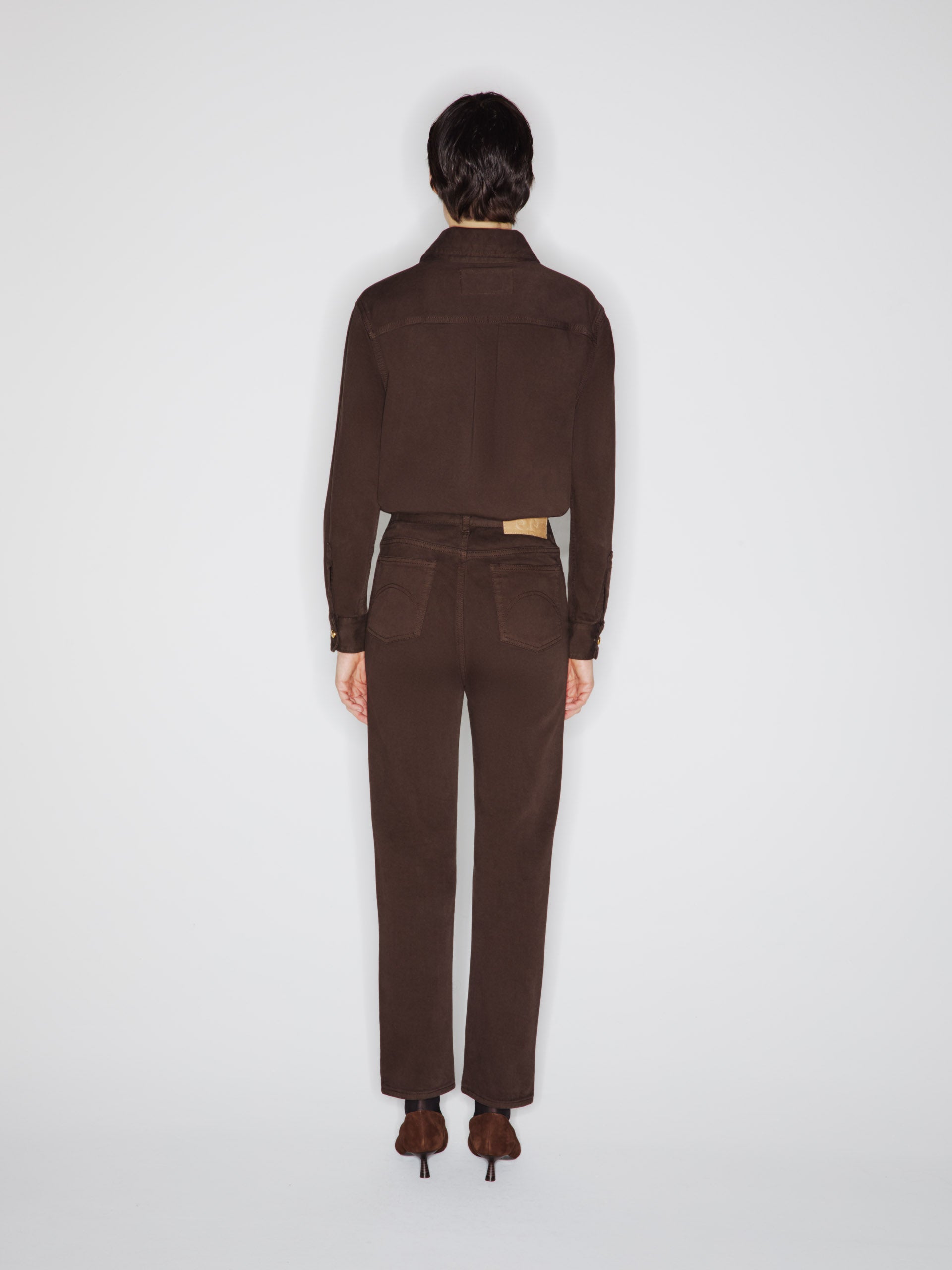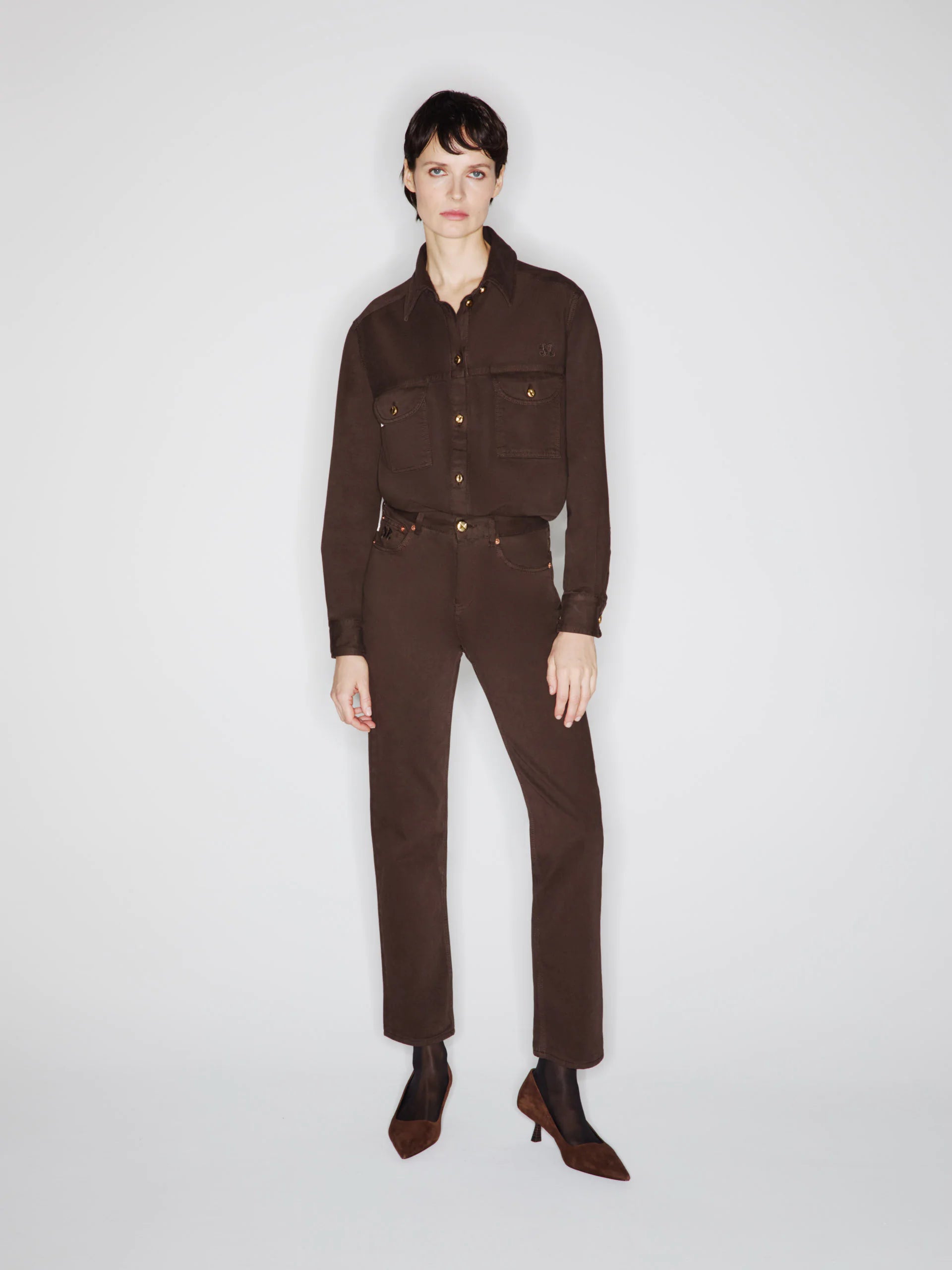 Chemise Clapotis Berber signée Blazé Milano confectionné en denim marron foncé. Une chemise classique à la coupe droite et col pointu.