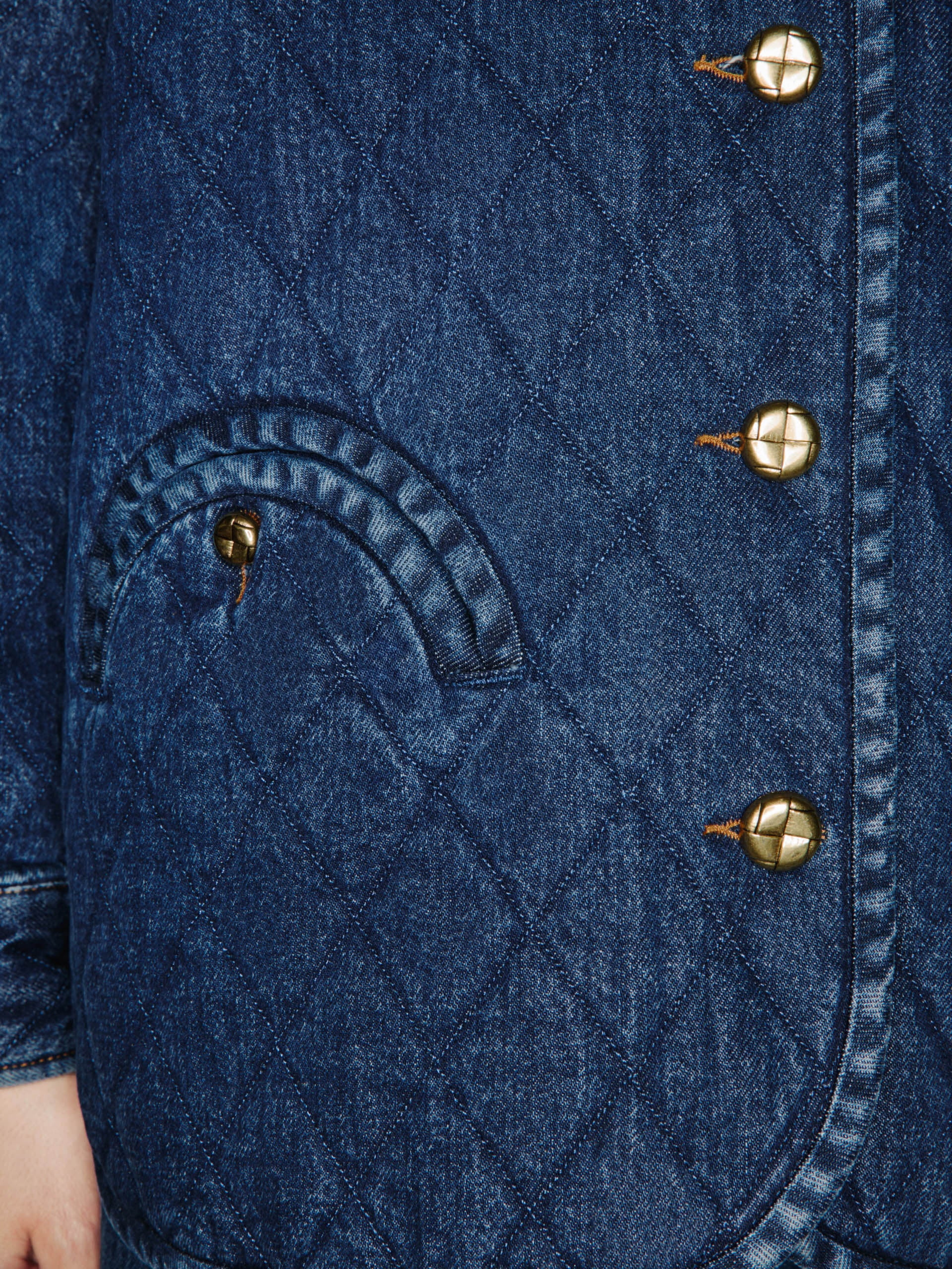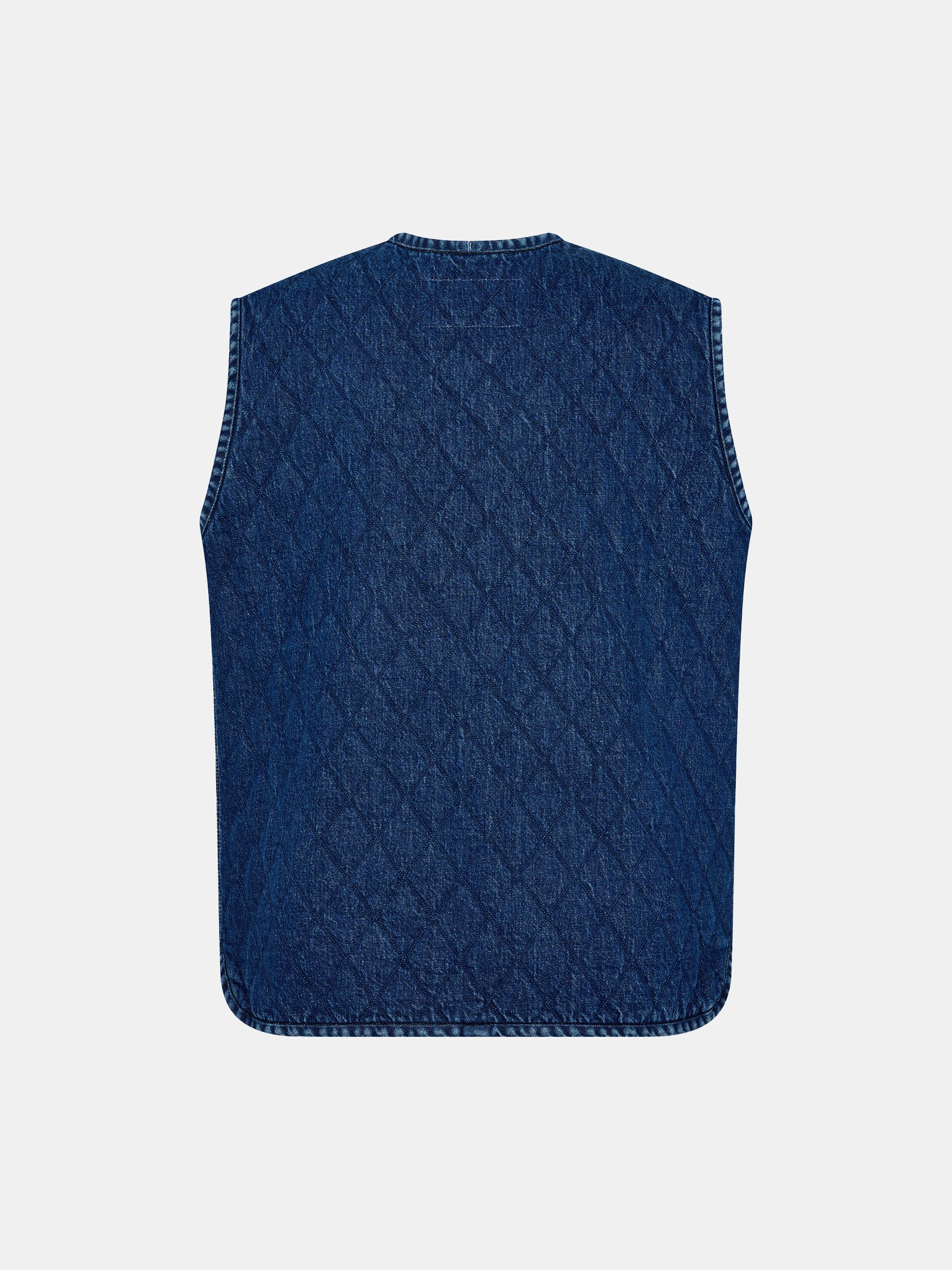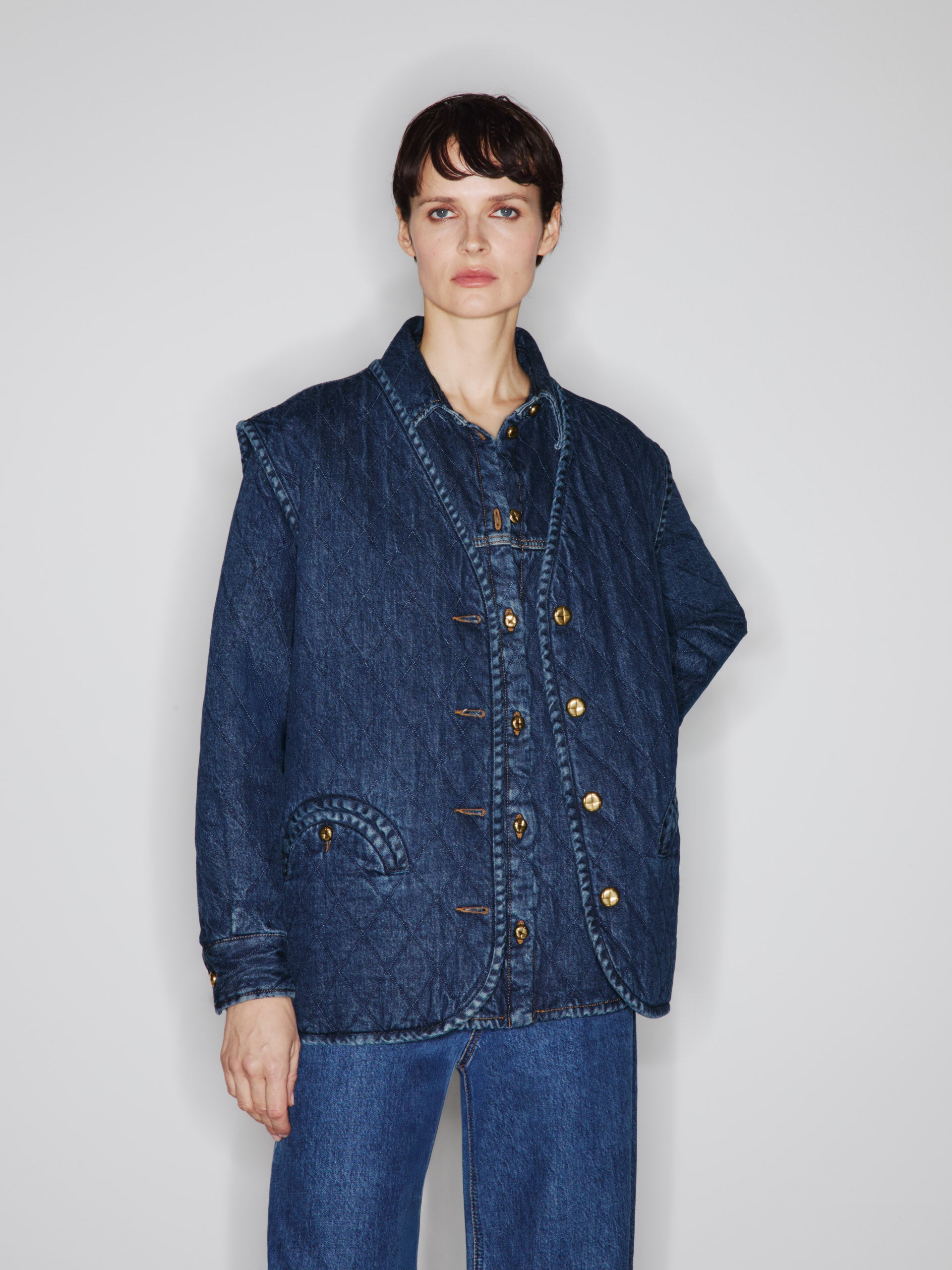 Gilet Sufflock Nariida Sapphire signé Blazé Milano confectionné dans un tissu en denim bleu foncé matelassé. Un gilet sans manches aux poches arquées, signatures de la marque.