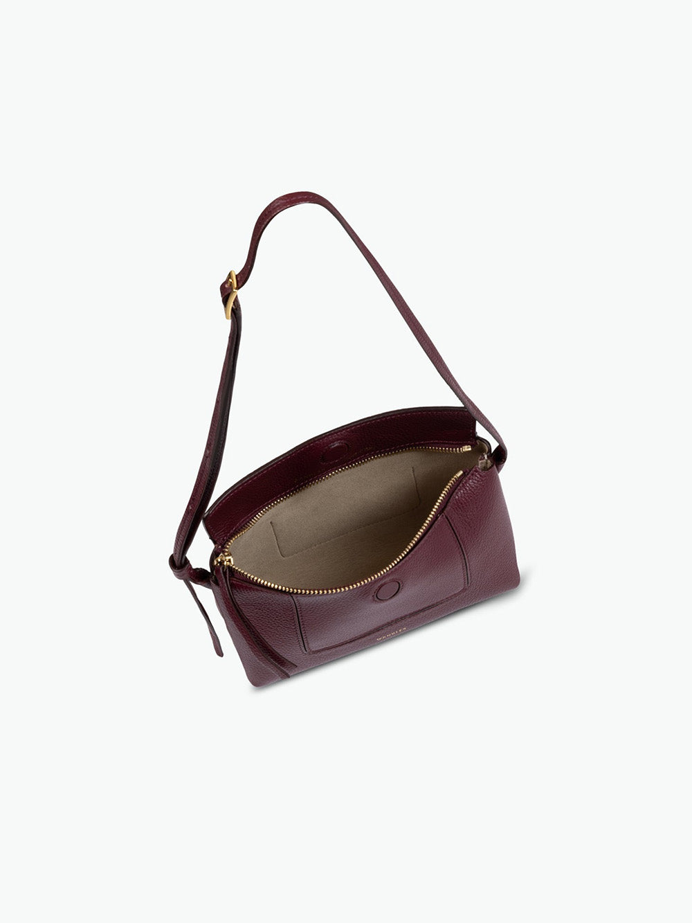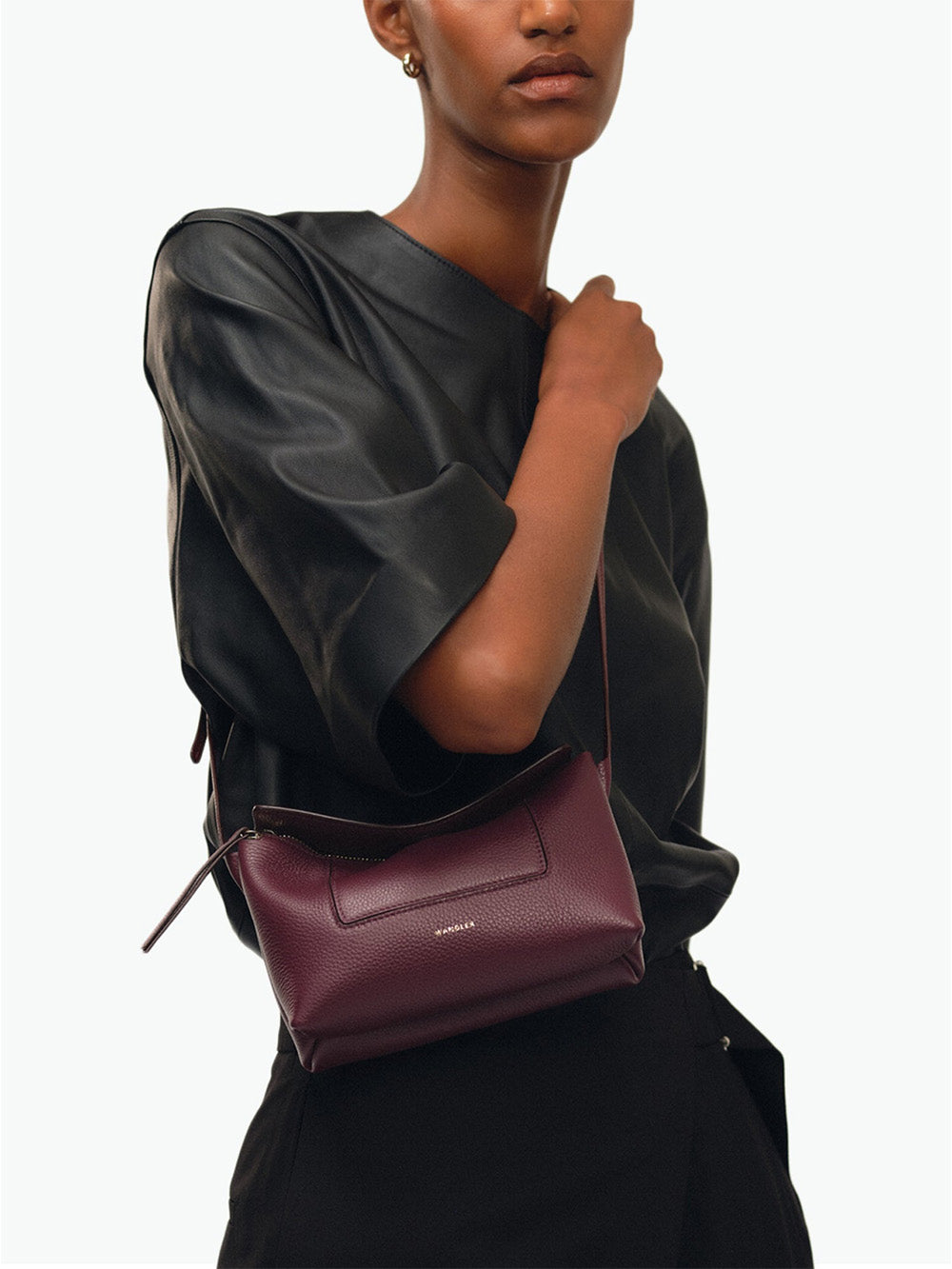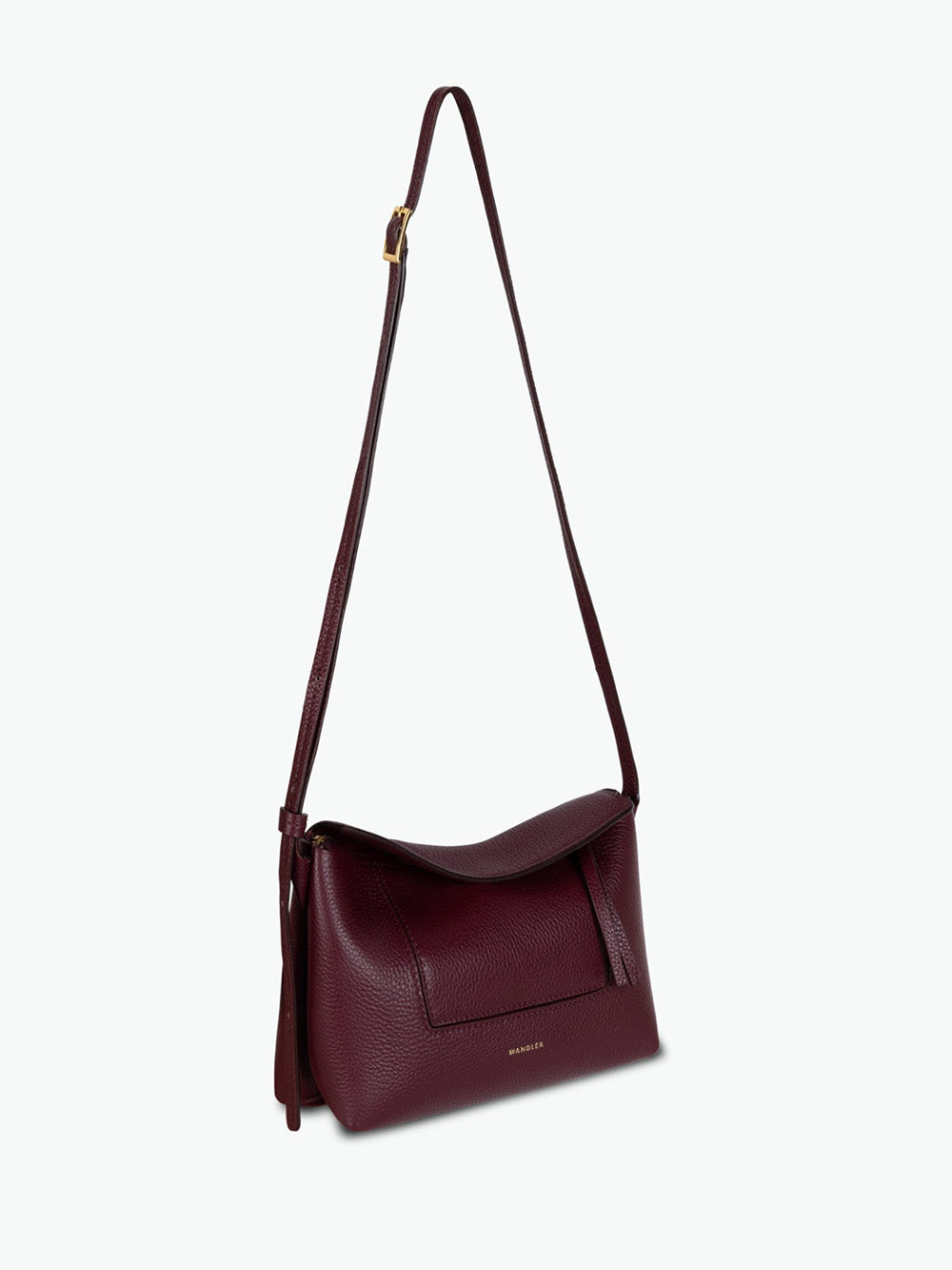 Sac Penelope Slouch Mini signé Wandler confectionné dans un cuir de veau grainé de couleur bordeaux. Un sac pouvant se porter en bandoulière, à l'épaule ou à la main grâce à une sangle ajustable.