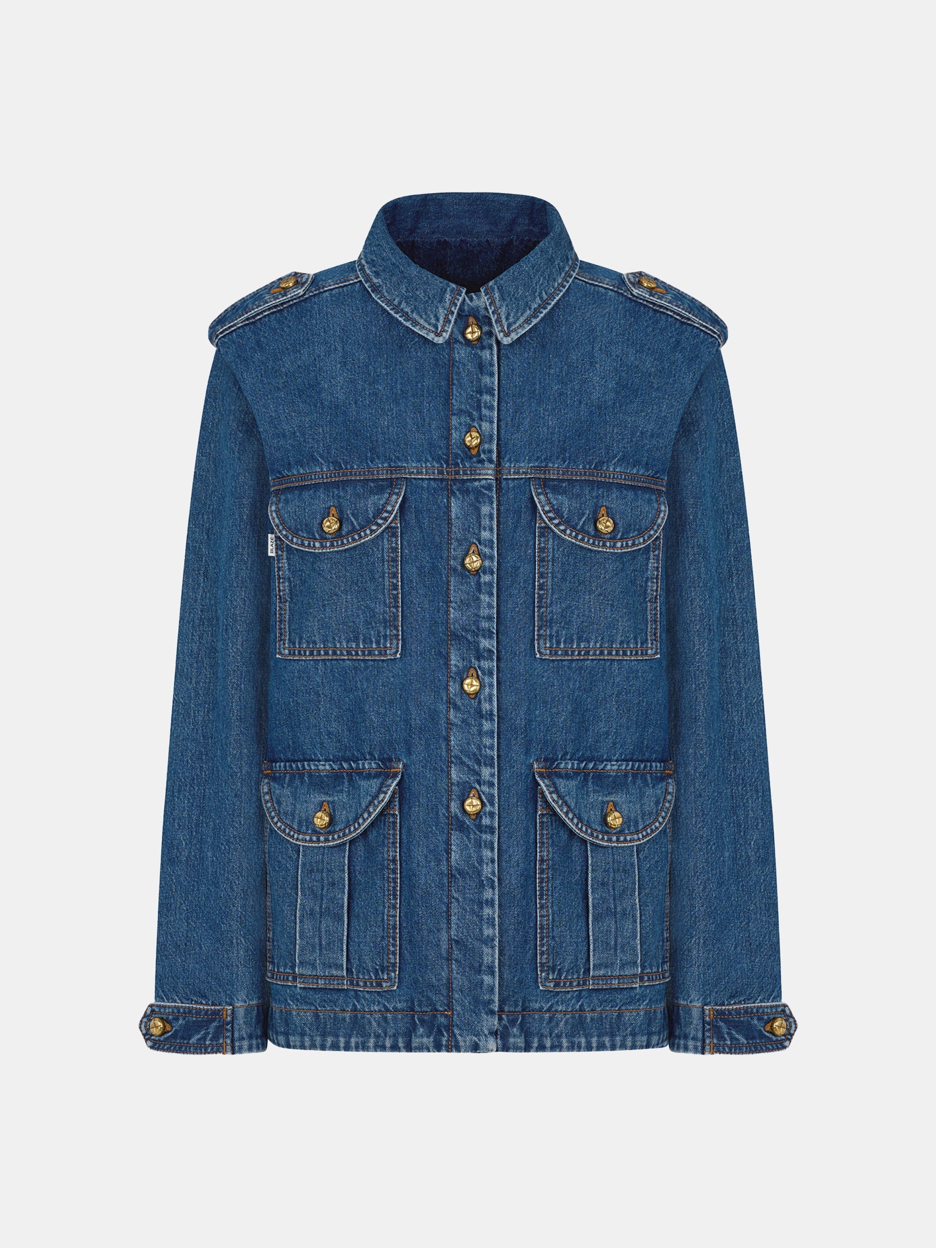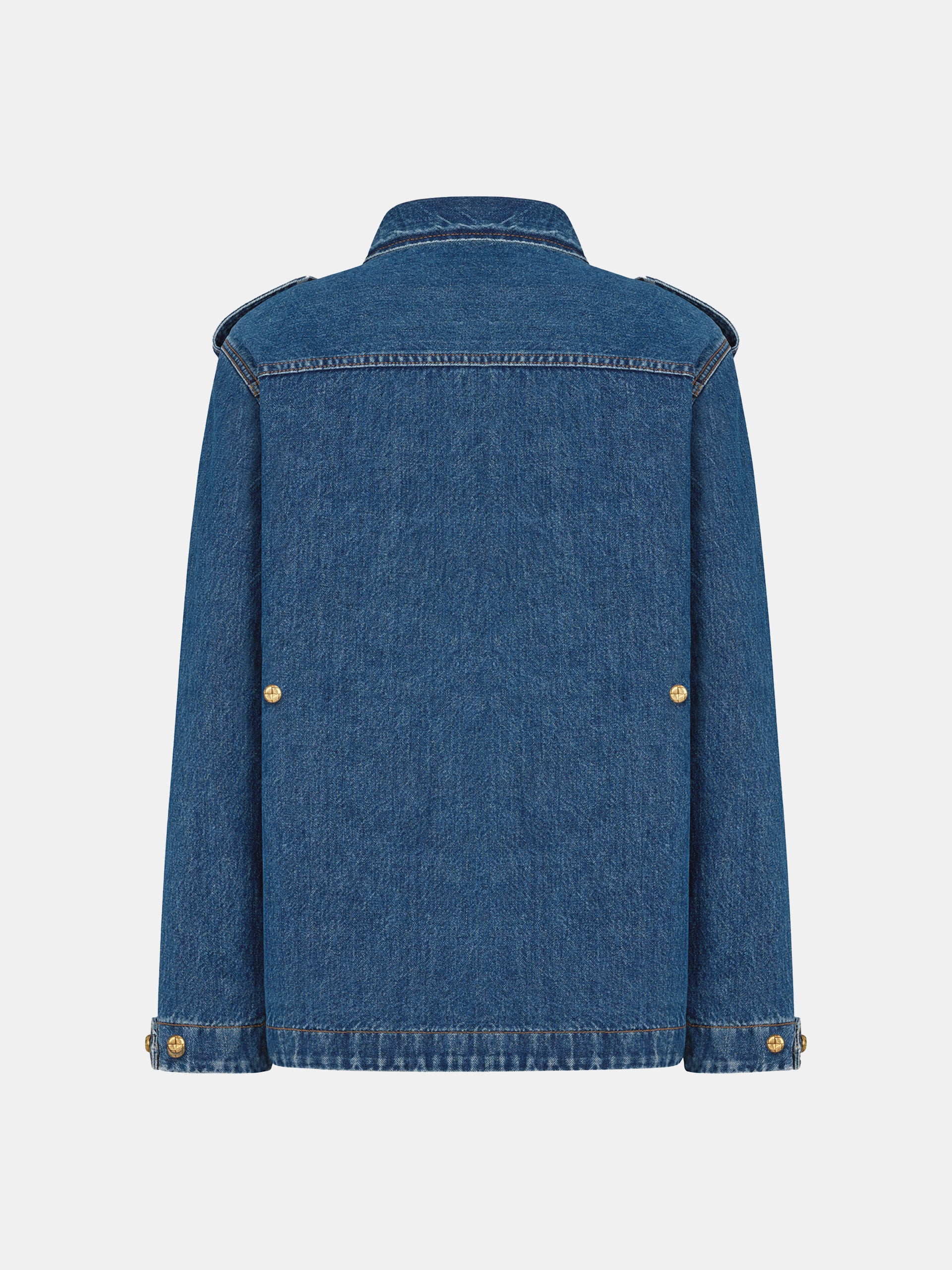 Veste Sahariana Nariida Sapphire signée Blazé Milano confectionnée en denim bleu foncé. Une veste saharienne aux poches plaquées sur le devant.