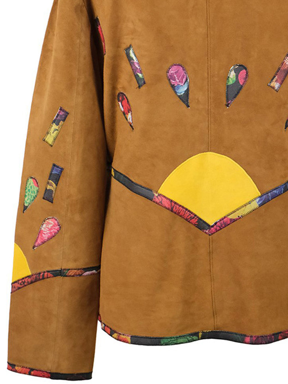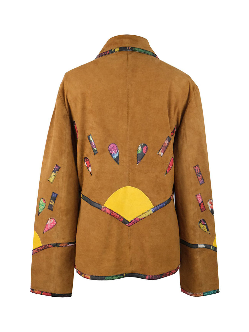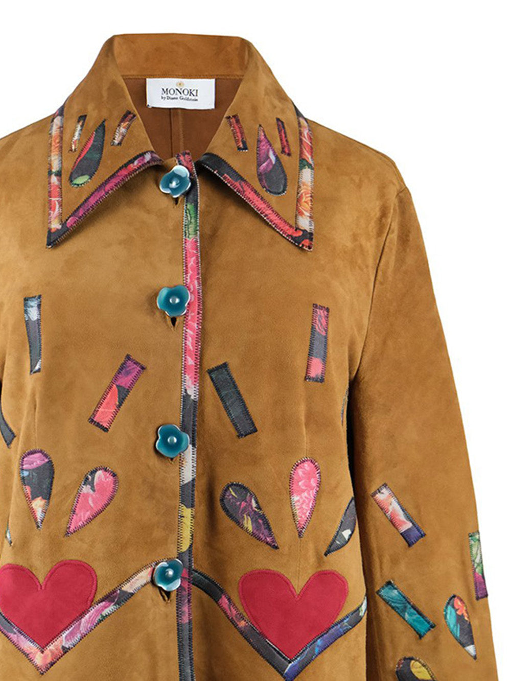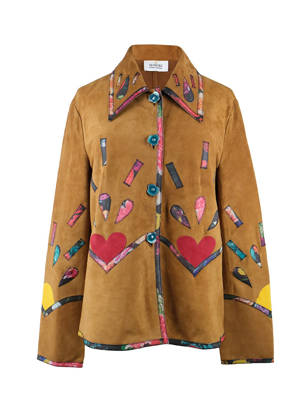 La veste Dylan signée Monoki est réalisée à la main en veau velours couleur cognac. Les broderies colorées emblématiques de la marque ornent l'avant et l'arrière de la veste. Elle possède une coupe ajustée, un col chemise ainsi que des boutons en forme de fleurs.