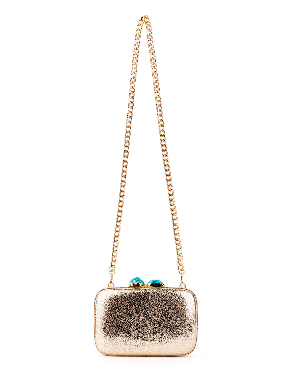 Pochette Ouro Turquoise signée Gustoko confectionnée en cuir de veau lamé or. Une pochette rectangulaire à la fermeture aimanté ornée de deux turquoises.