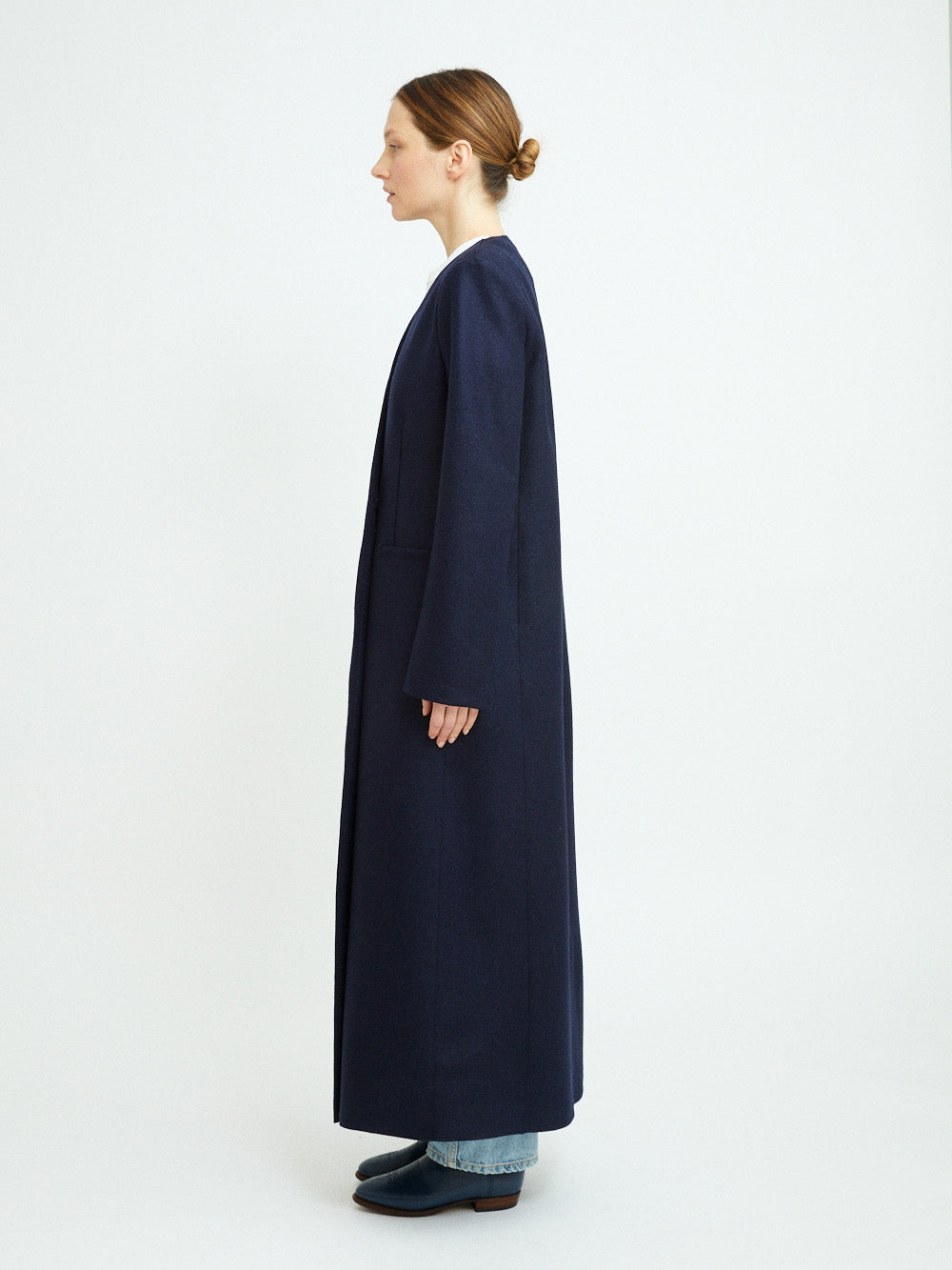 Ce manteau bleu marine signé Harris Wharf London est réalisé en Italie. Confectionné en laine, il possède une coupe longue et droite, un décolleté en v, deux poches et se ferme à l'aide de boutons.