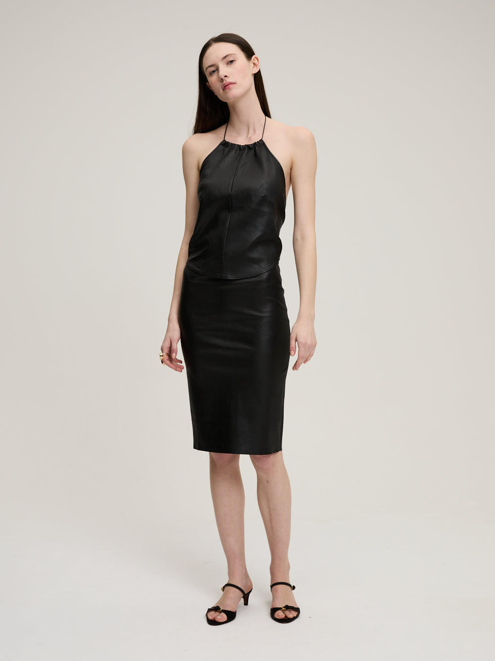 Jupe Gilda signée Stouls confectionné en cuir d'agneau plongé. Une jupe longueur genoux accompagnée d'une fente à l'arrière.
