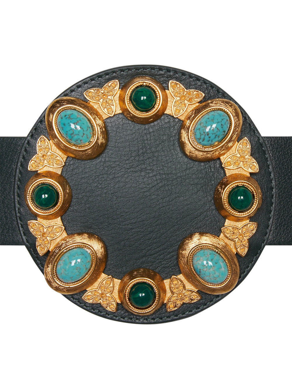 Ceinture Heart signée Sonia Petroff confectionnée en cuir vert forêt dont le cercle de pierres interconnectées en son centre puise son inspiration dans la beauté de la nature et le cycle de la vie terrestre.