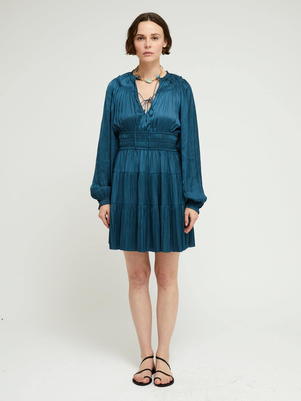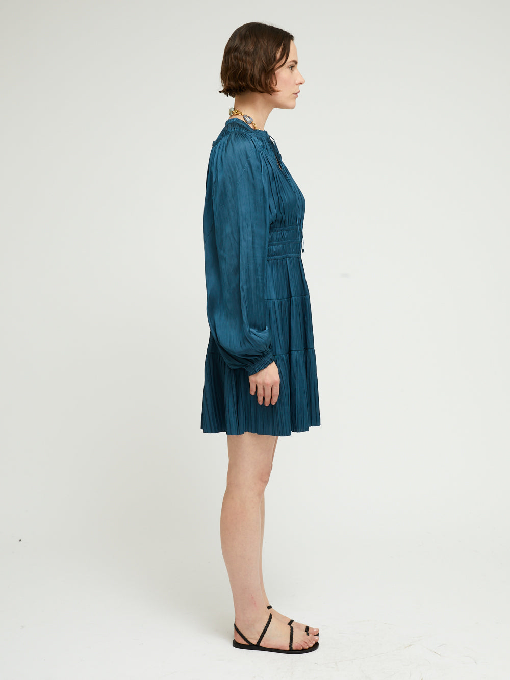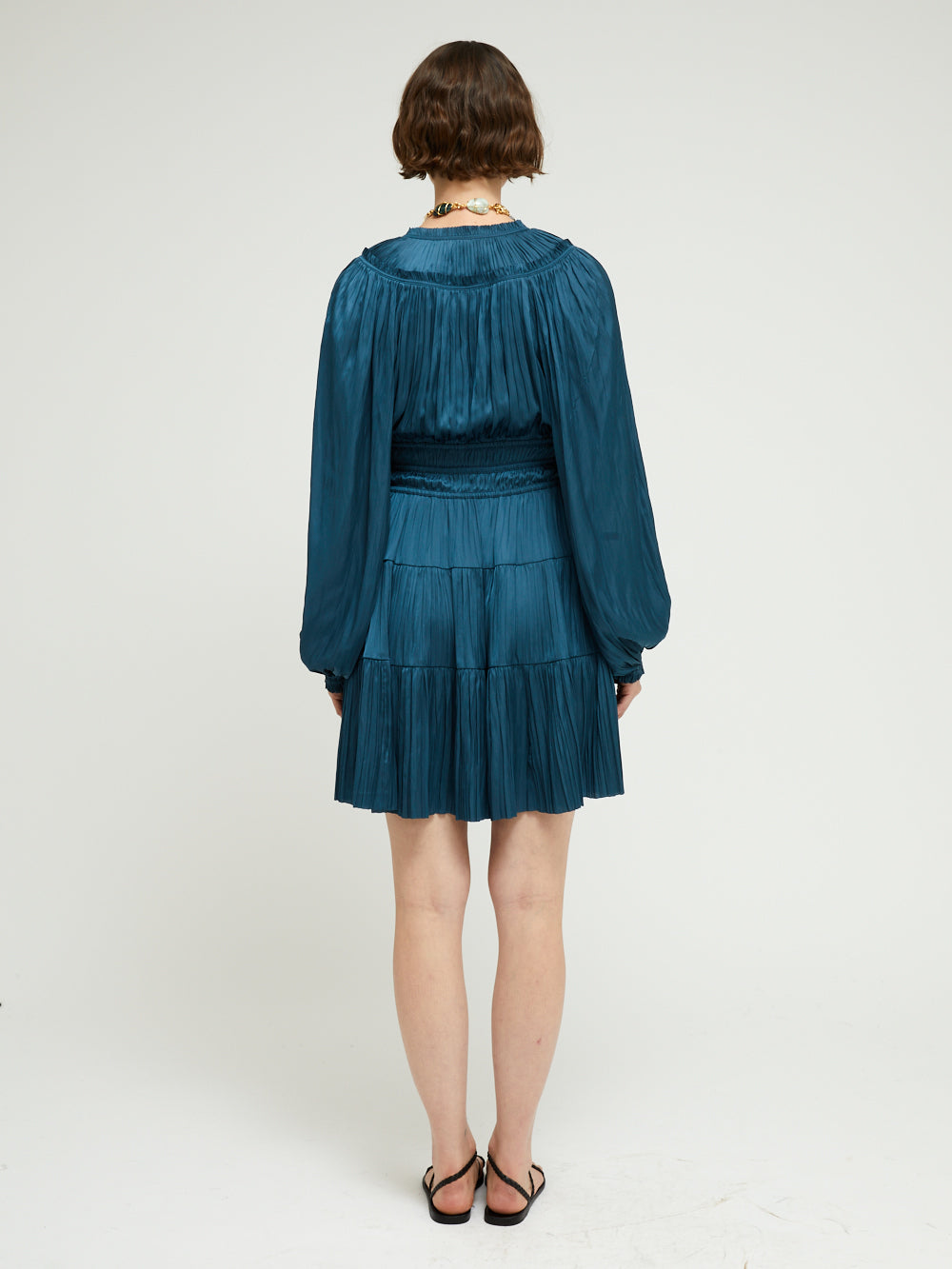 Robe Kori Neptune signée Ulla Johnson confectionné dans un tissu plissé bleu pétrole à l'effet satiné. Une robe courte à manches longues bouffantes et à la jupe évasée.
