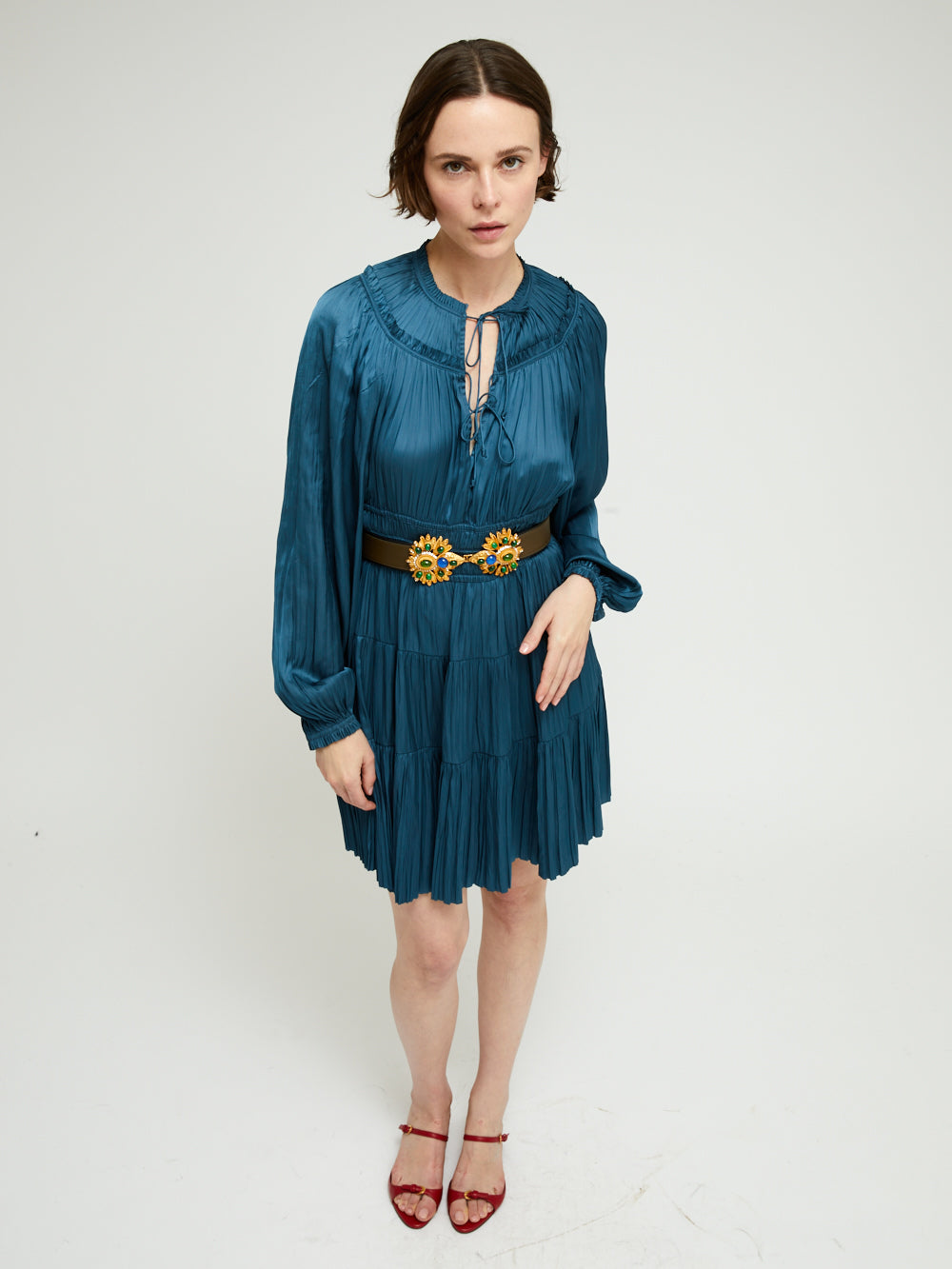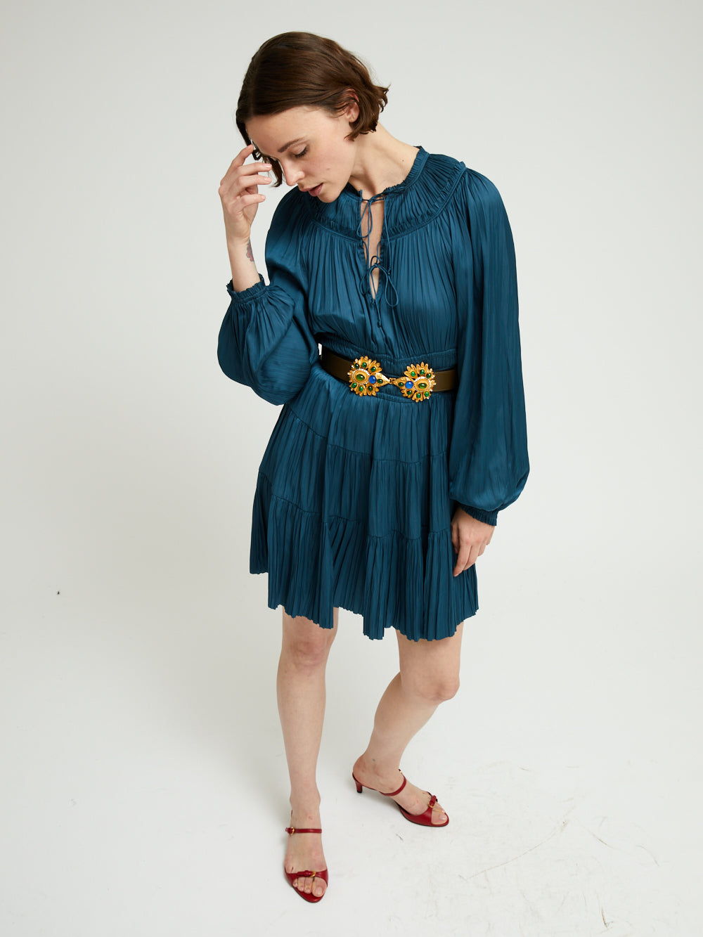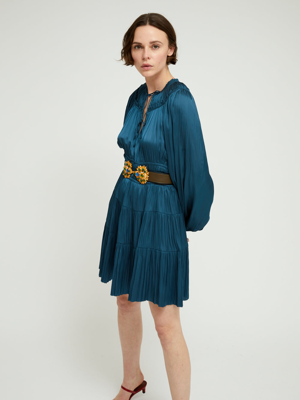 Robe Kori Neptune signée Ulla Johnson confectionné dans un tissu plissé bleu pétrole à l'effet satiné. Une robe courte à manches longues bouffantes et à la jupe évasée.