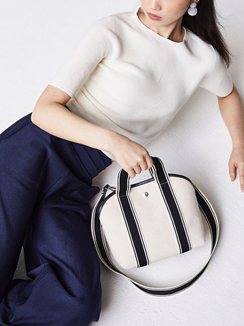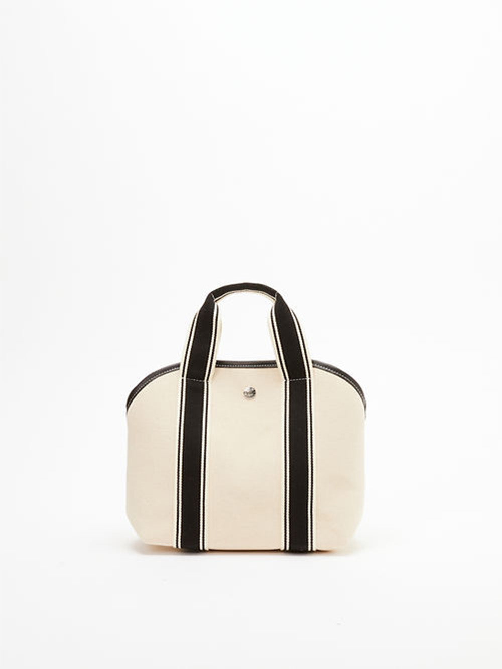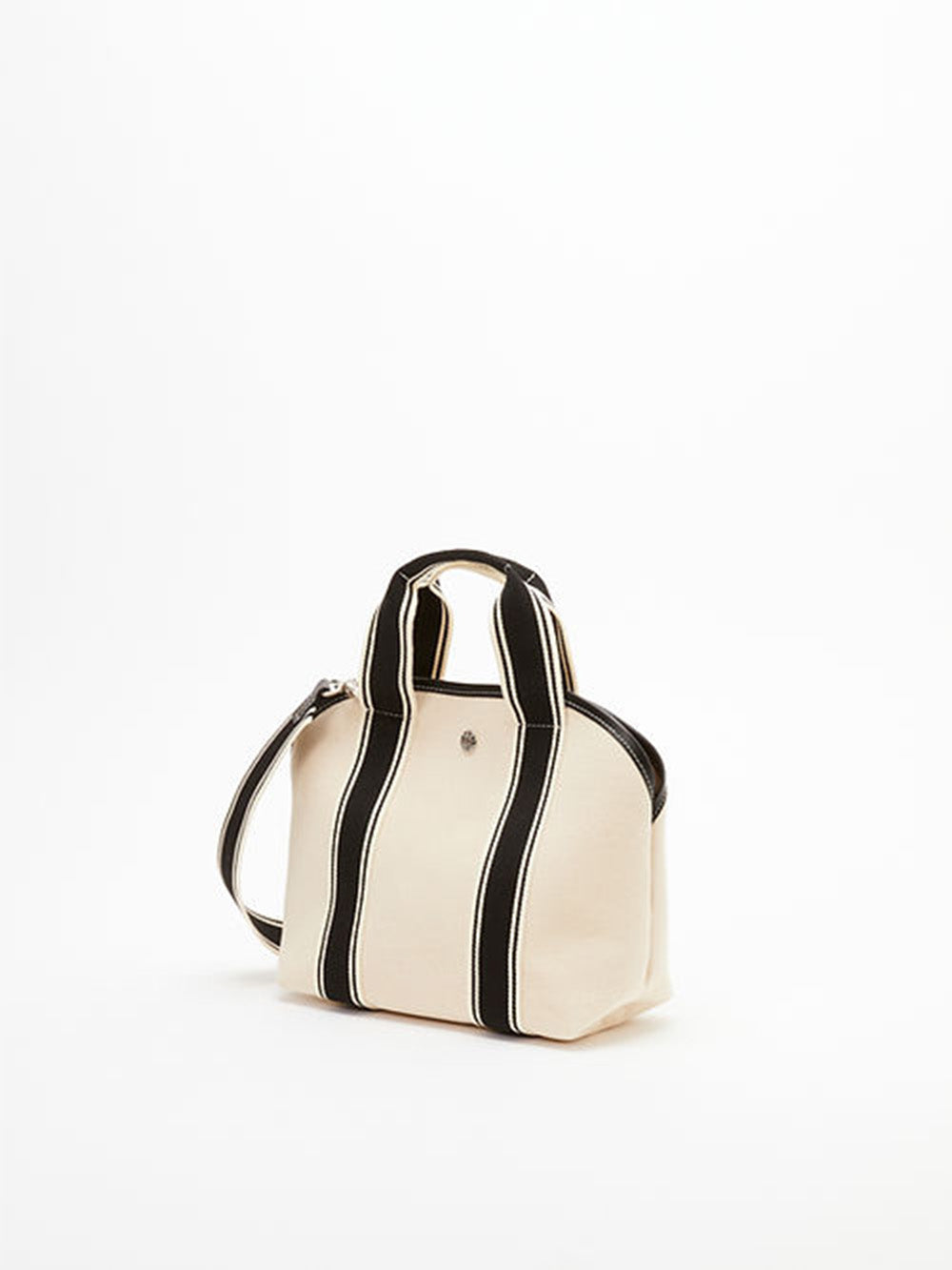 Sac Upper East S Cruise Line signé Rue de Verneuil confectionné en coton blanc avec des hanses contrastées en canva noir et blanc.