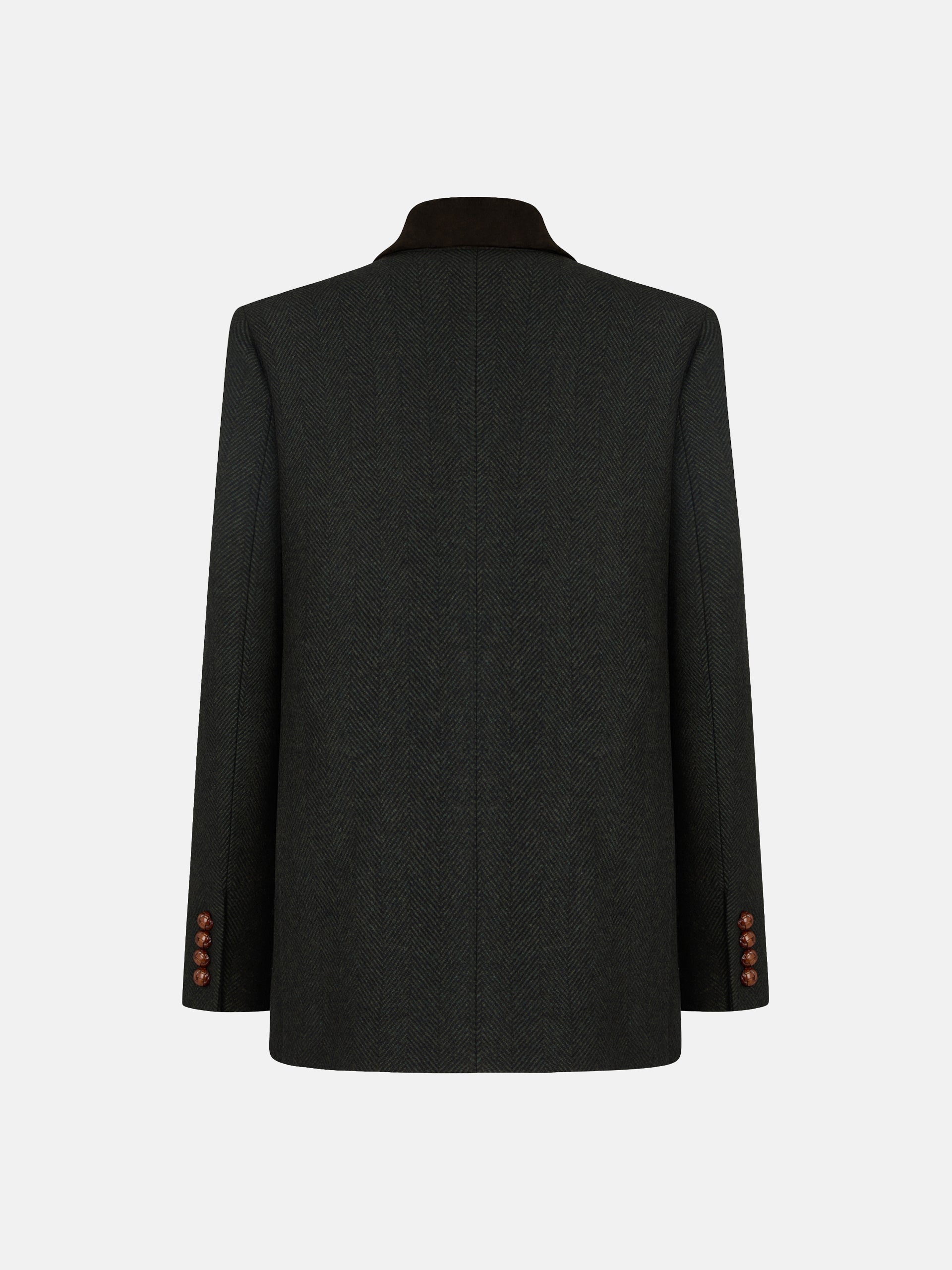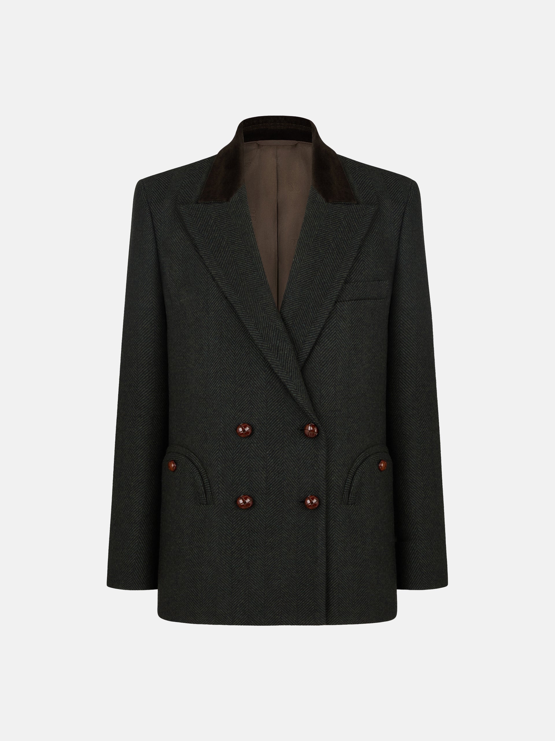 Blazer Everynight Cheveyo Dark Green signée Blazé Milano confectionné en laine à chevron vert forêt. Une coupe droite aux épaules structurées et aux poches arquées, détail signature de la marque. Une pièce sophistiquée et versatile.