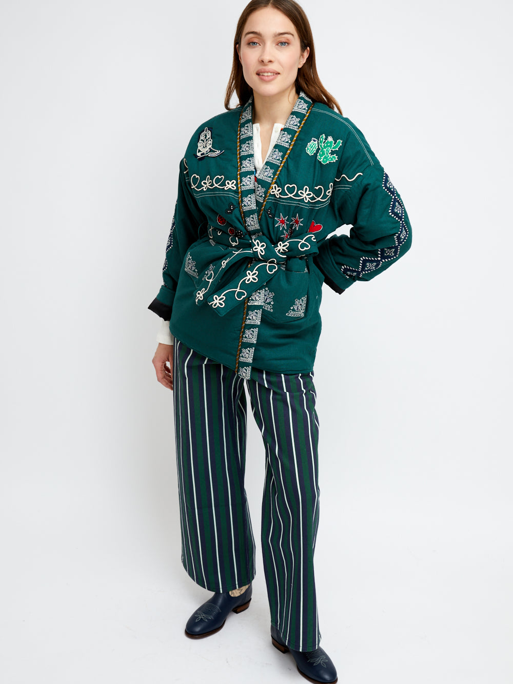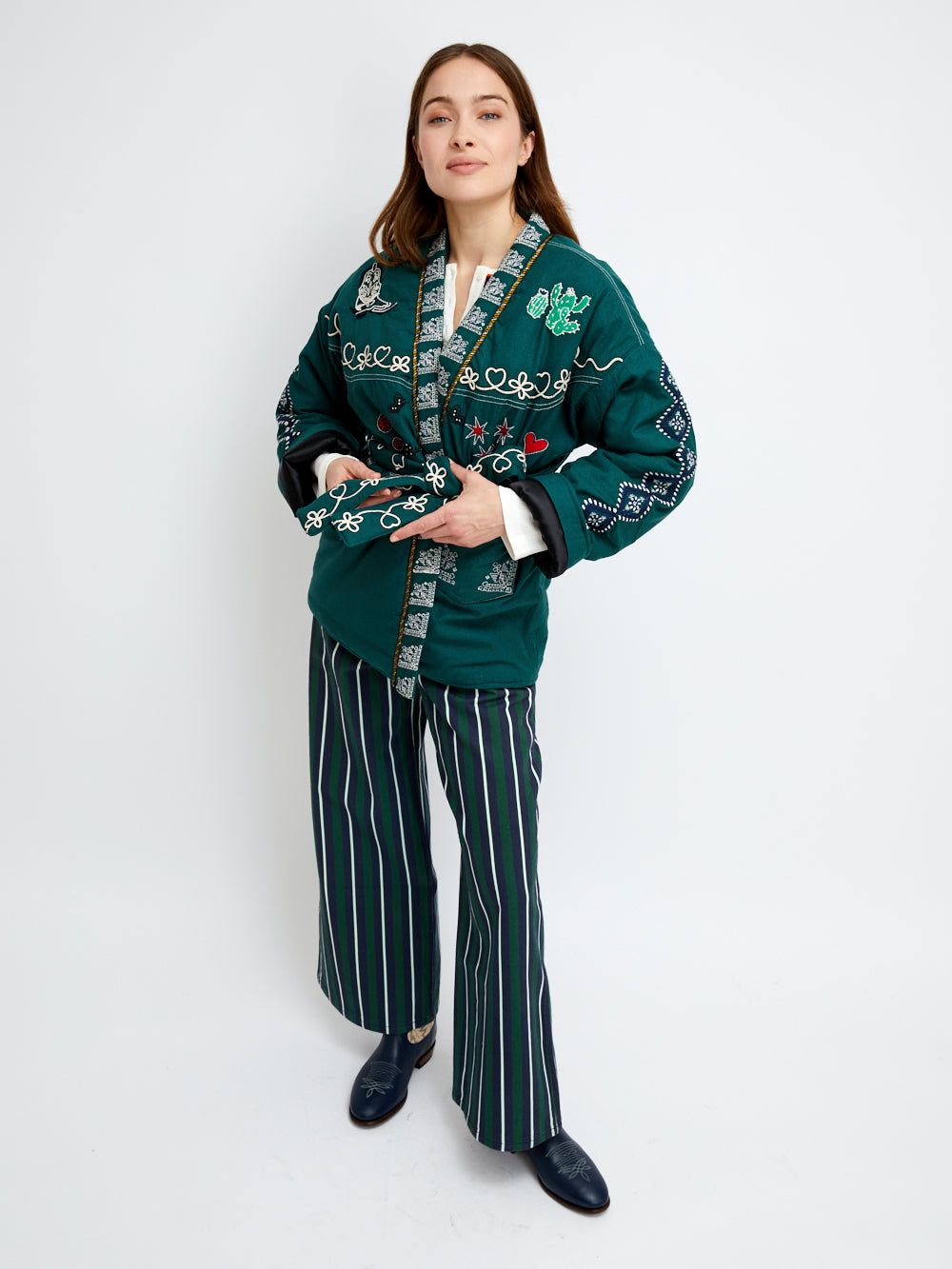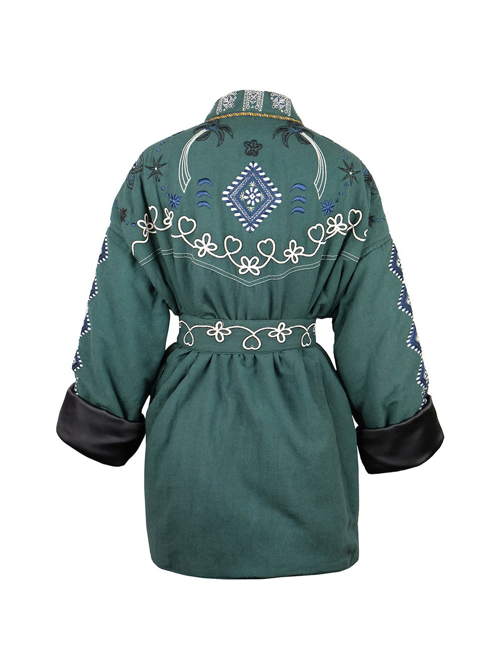 Kimono Yellowstone signé Monoki confectionné en soie vert forêt brodée dans les tons blanc, rouge et bleu marine. Broderies sur le thème du désert américain avec bottes de cowboy et cactus.