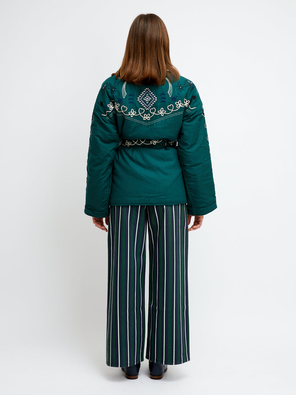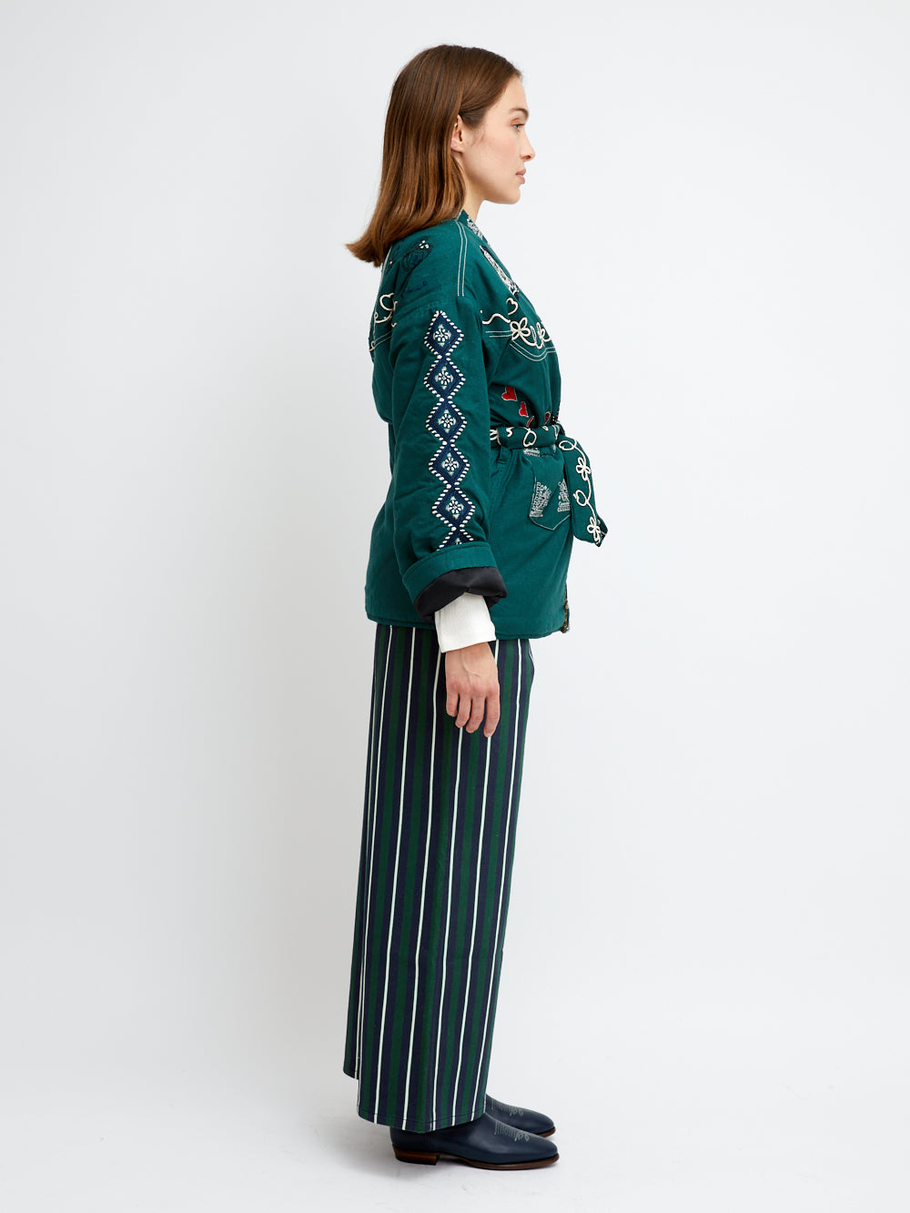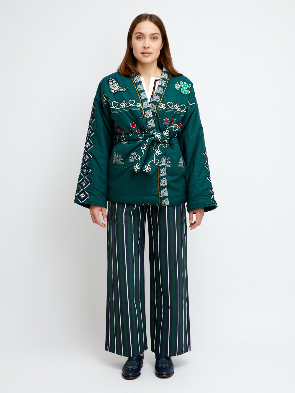 Kimono Yellowstone signé Monoki confectionné en soie vert forêt brodée dans les tons blanc, rouge et bleu marine. Broderies sur le thème du désert américain avec bottes de cowboy et cactus.