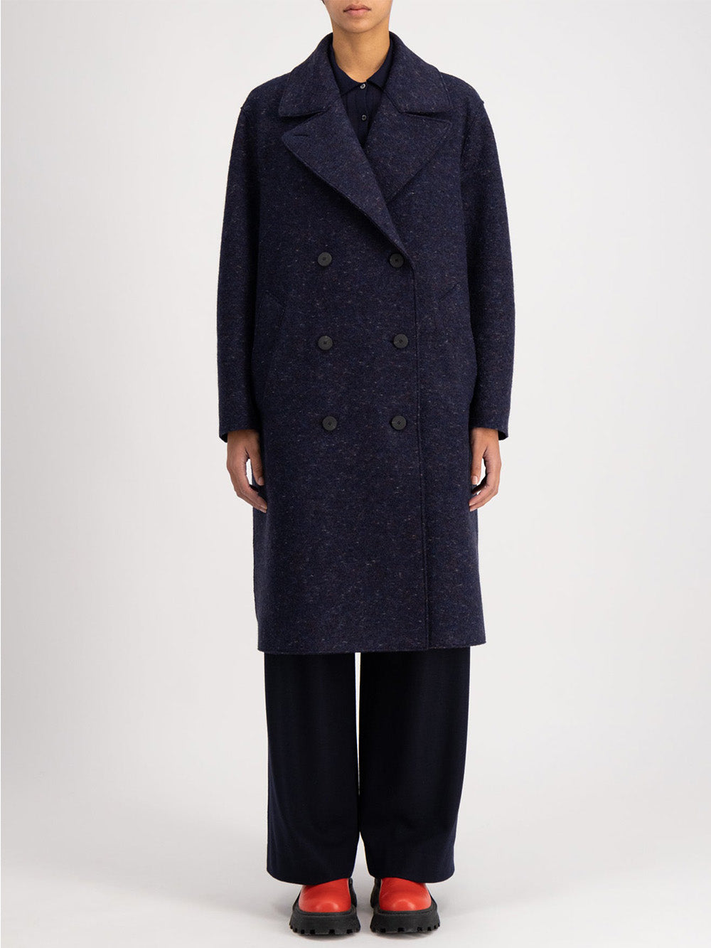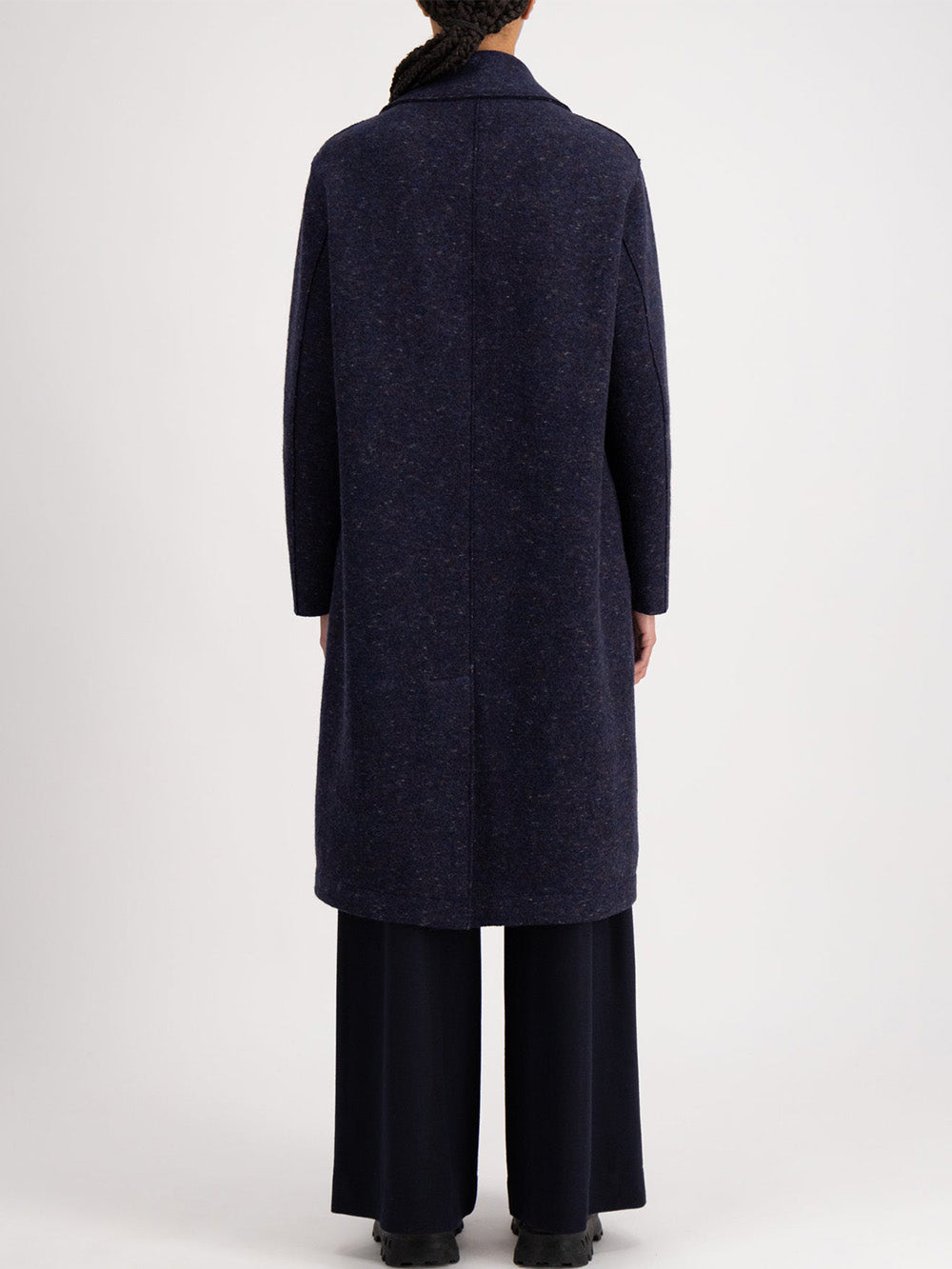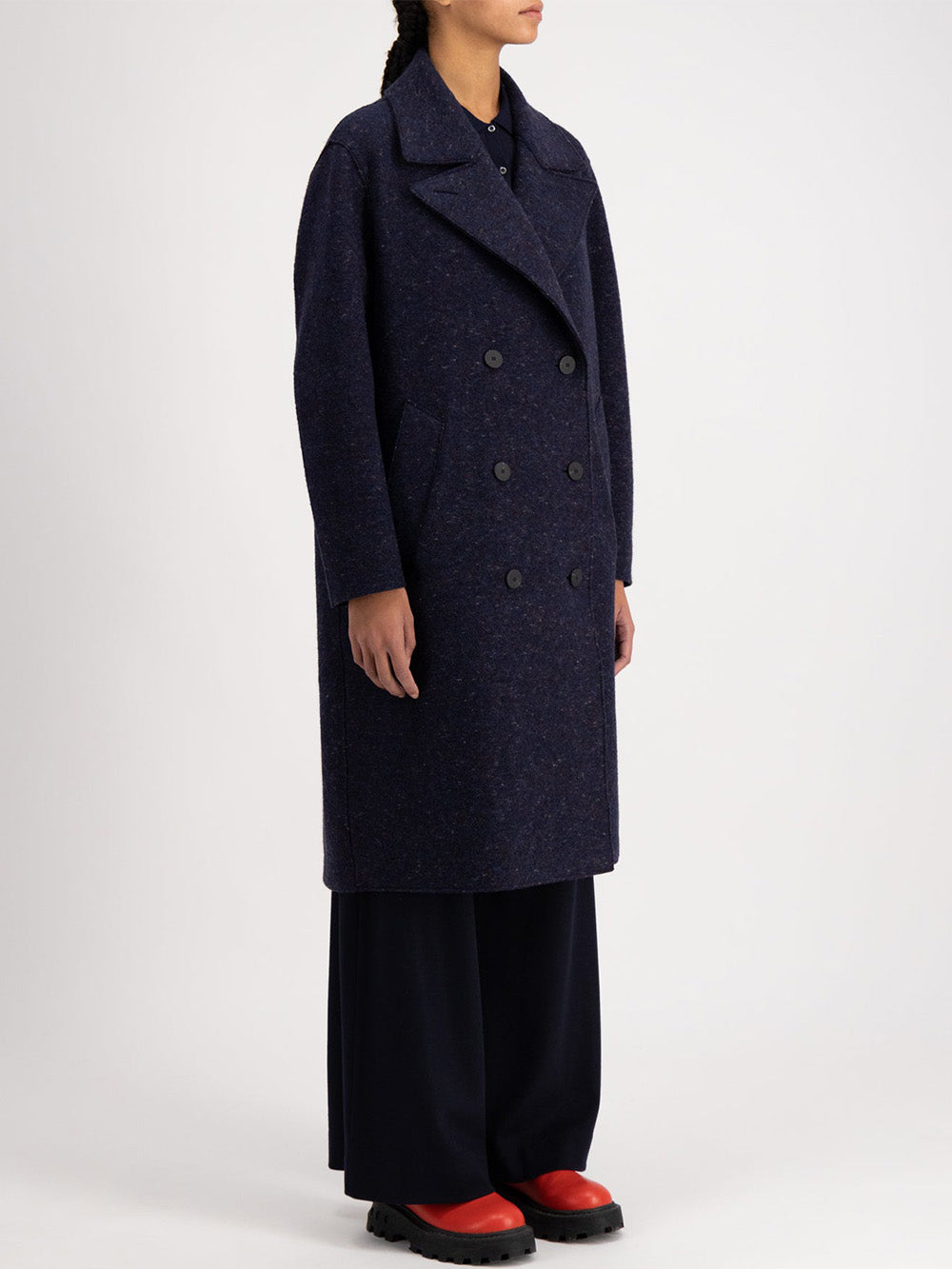 Manteau Sailor Midnight Melange signé Harris Wharf London confectionné en laine bleu marine chiné. Une manteau droit légèrement oversized à double boutonnage.