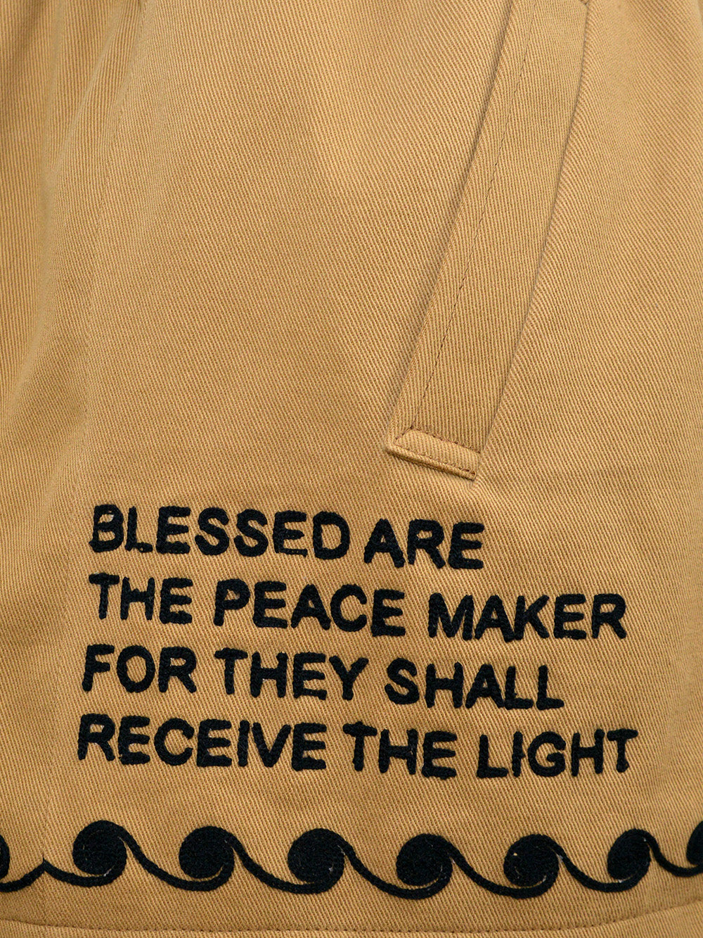 Veste Dutton signée Monoki confectionnée en coton de couleur camel aux broderies noires contrastantes. Une parka ajustée au niveau de la taille et fermée par zip et boutons pressions sur le devant.