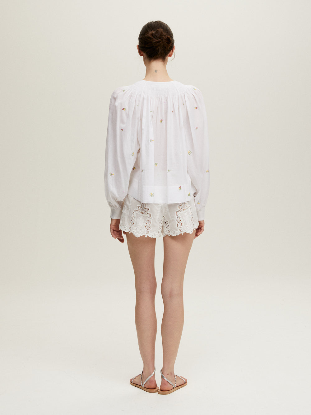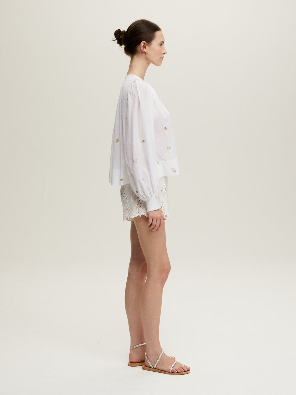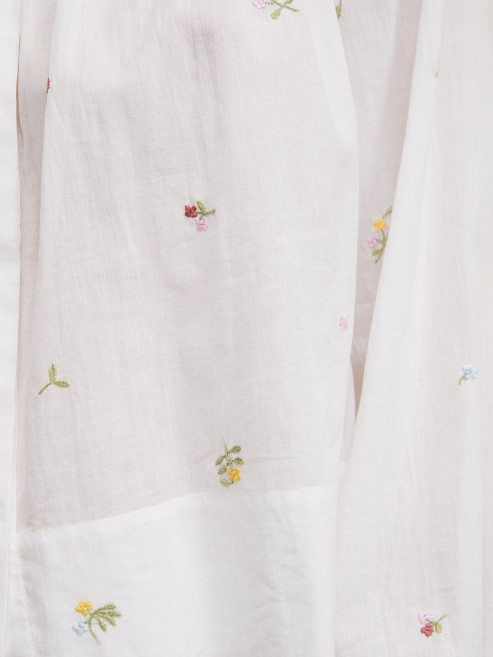 Blouse Margot signée Jane Gustavsson confectionnée en coton organique blanc tissé à la main brodées de fleurs mutlicolores. Une blouse à la couple ample et aux manches bouffantes aux broderies Chikankaari.