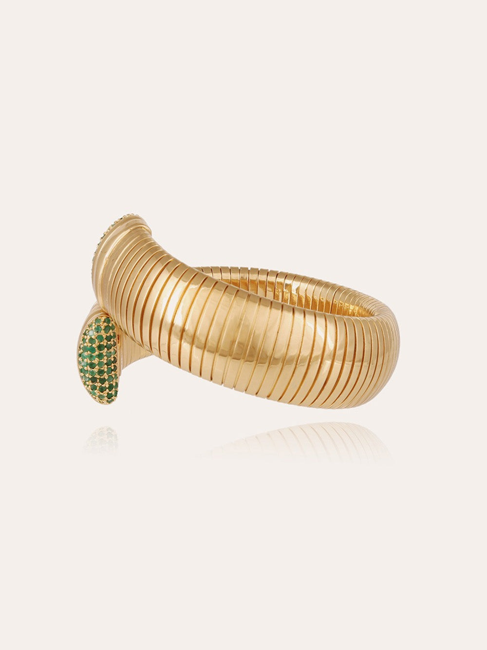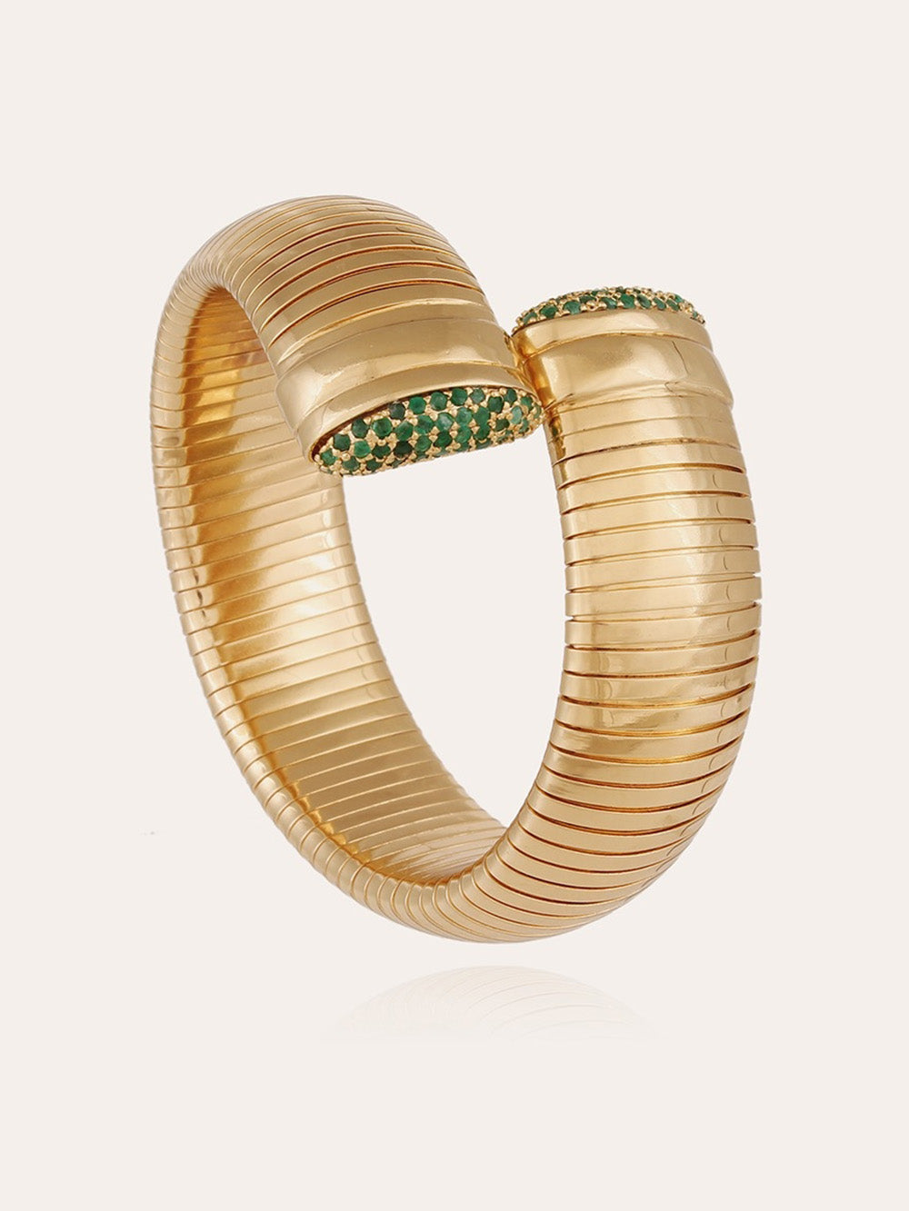 Bracelet doré à l'or fin, composé d'une maille tubogas légèrement flexible, serti d'émeraude aux extrémités.