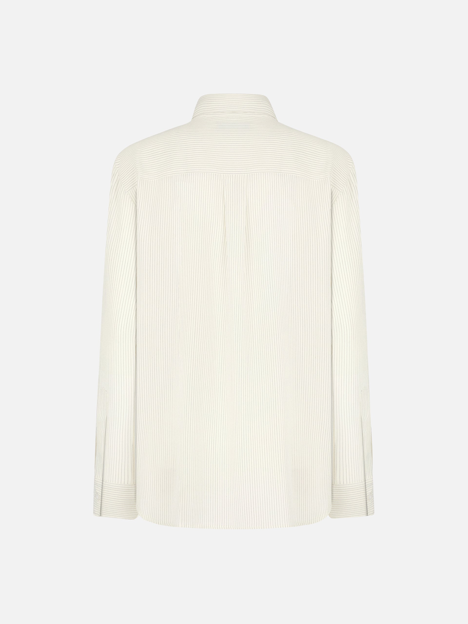 Chemise Anabas Kris signée Blazé Milano confectionnée en soie blanc cassé aux rayures bleu marine. Une chemise à la coupe droite accompagné d'une poche plaquée sur la poitrine.