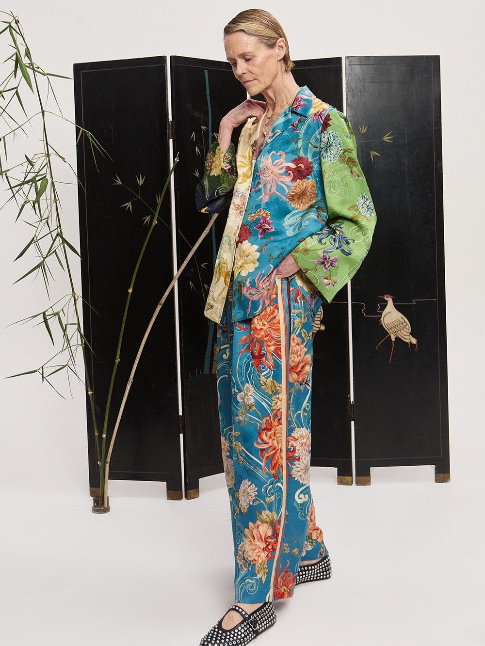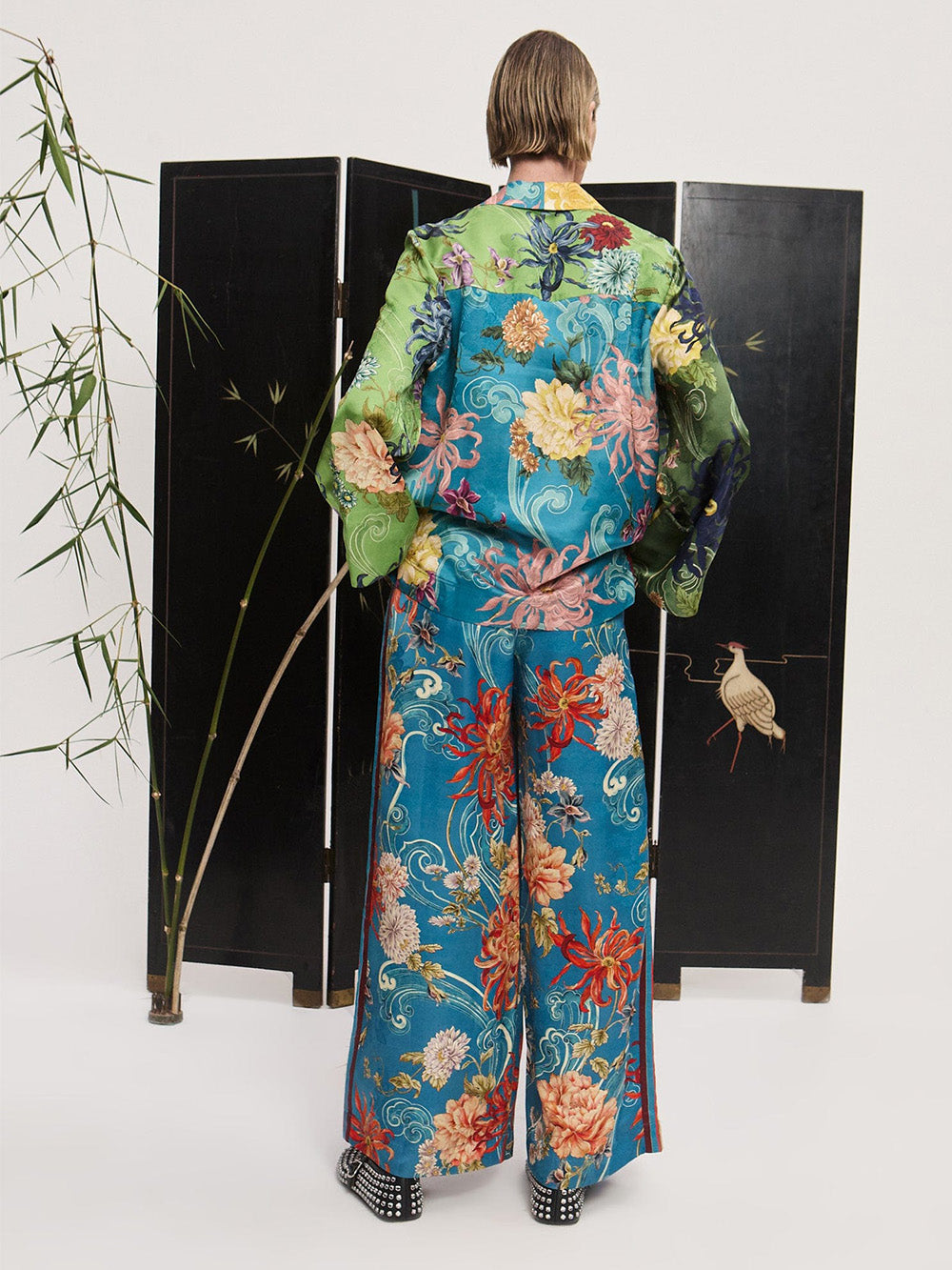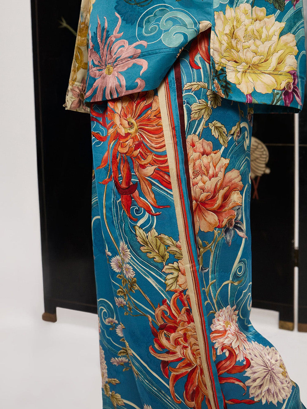Pantalon Fletcher signé Alémais confectionné dans un tissu satiné bleu canard imprimé de dahlias dans les tons rouge et rose. Un pantalon large, taille haute, à pinces.