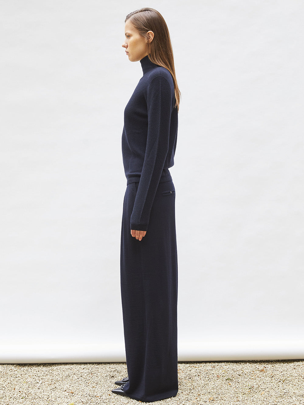 Pantalon Lauren signé Molli tricotée en Italie dans une maille de laine en jersey fine de couleur bleu nuit. Un pantalon pincé à la coupe droite et large.
