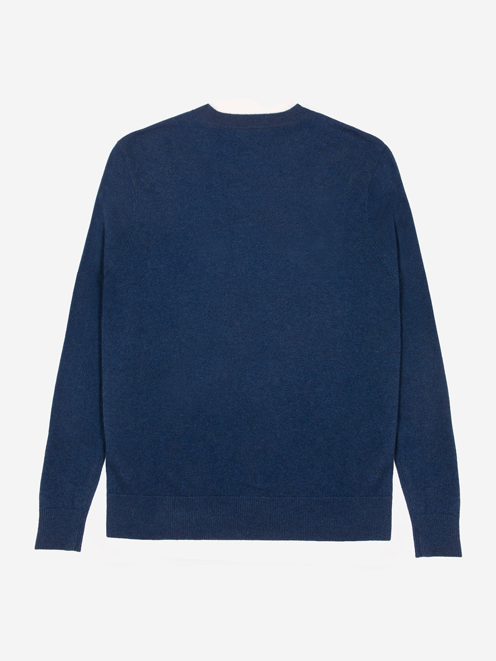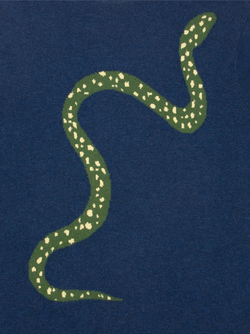 Pull N°30 Serpent signé Leret Leret confectionné en cachemire de couleur bleu marine, décoré d'un serpent vert à pois blancs. Une pull à col rond et manches longues.