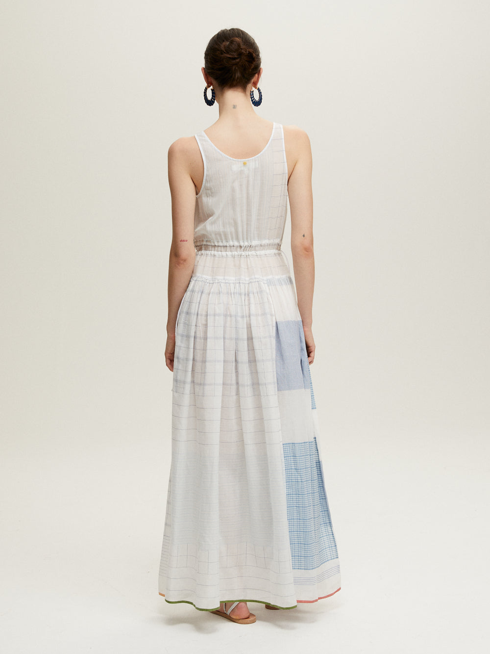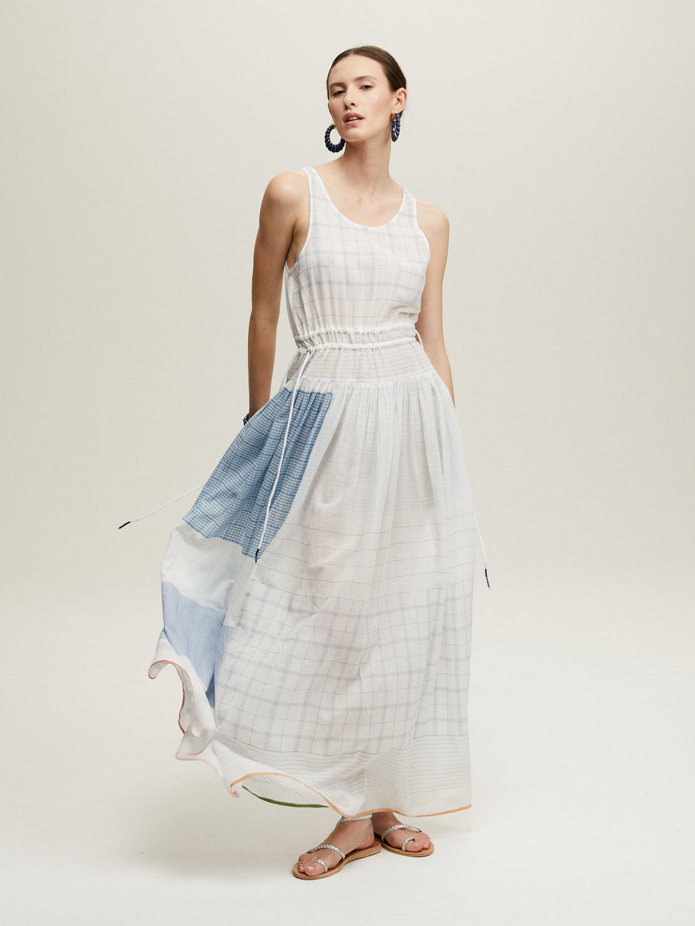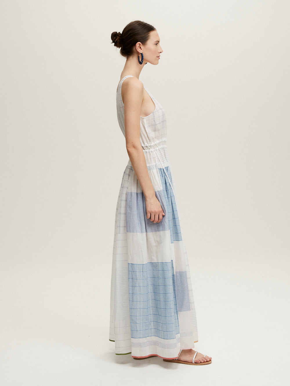 Robe Malin Bleue signée Jane Gustavsson confectionnée en coton tissé à la main "Jamdani". Une robe longue ajustable à la taille pour un effet froncé.
