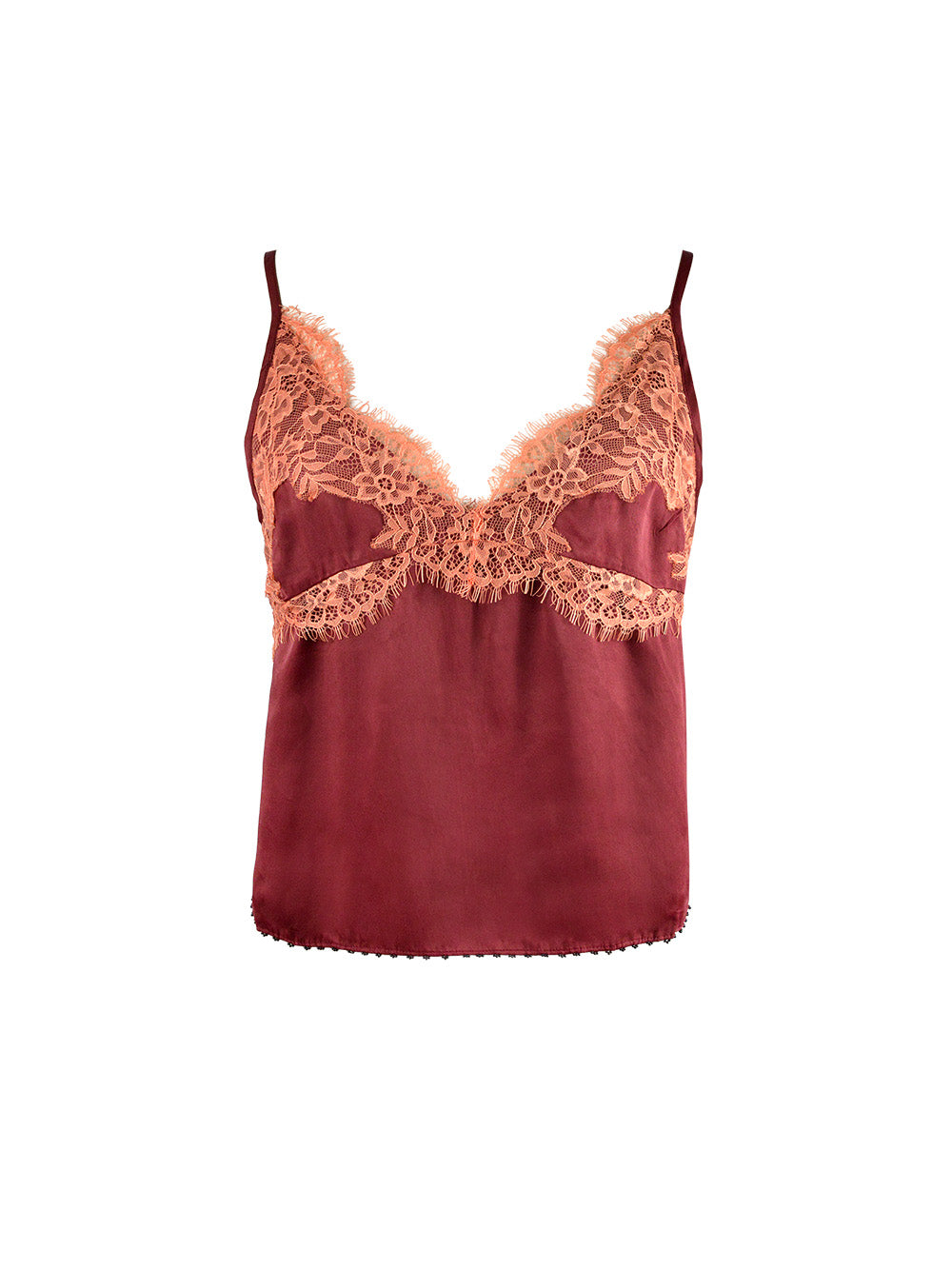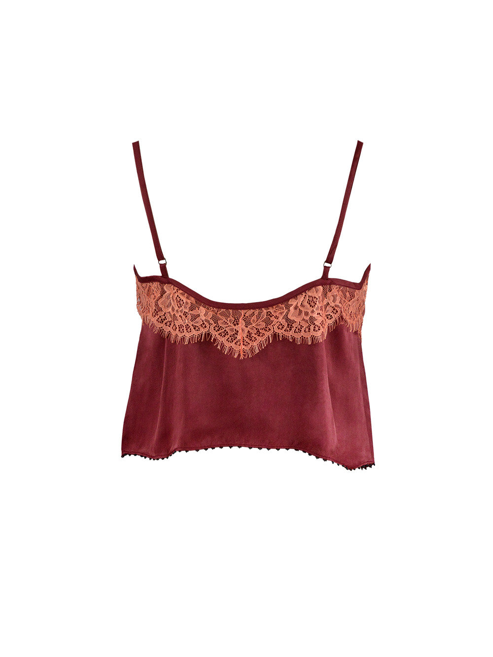Top Snow signé Monoki confectionné en coton bordeaux satiné décoré d'une dentelle corail contrastante. Un caraco élégant de style lingerie, indispensable pour l'été.