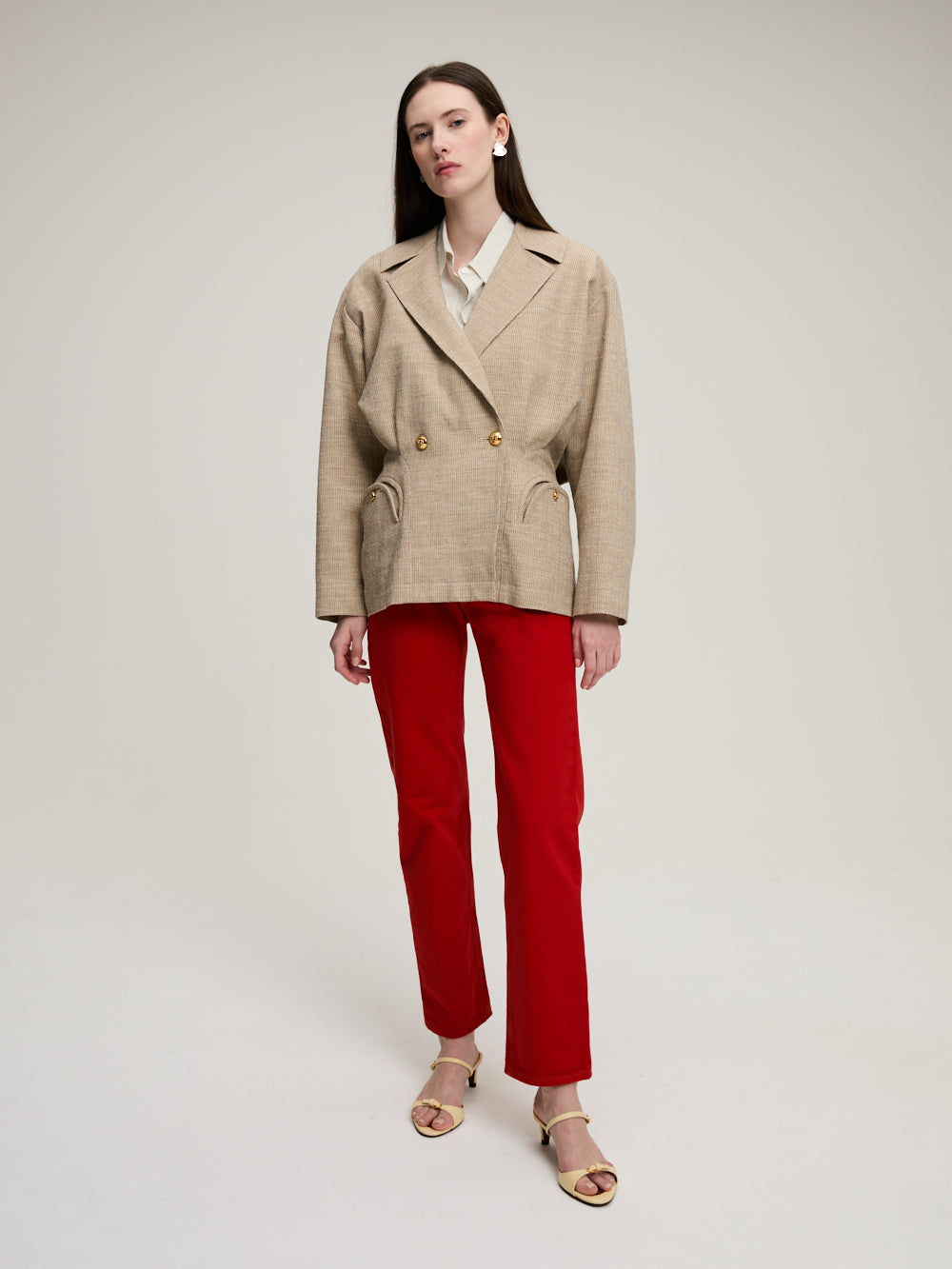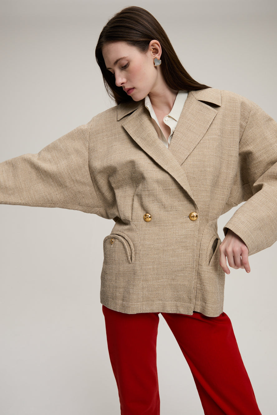 Blazer Ares Marisa signé Blazé Milano confectionné en laine de couleur beige. Un blazer à la coupe bombée et à la taille cintrée. Une veste classique avec un twist moderne.