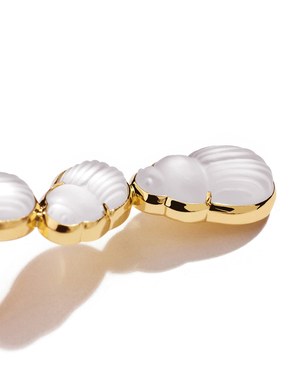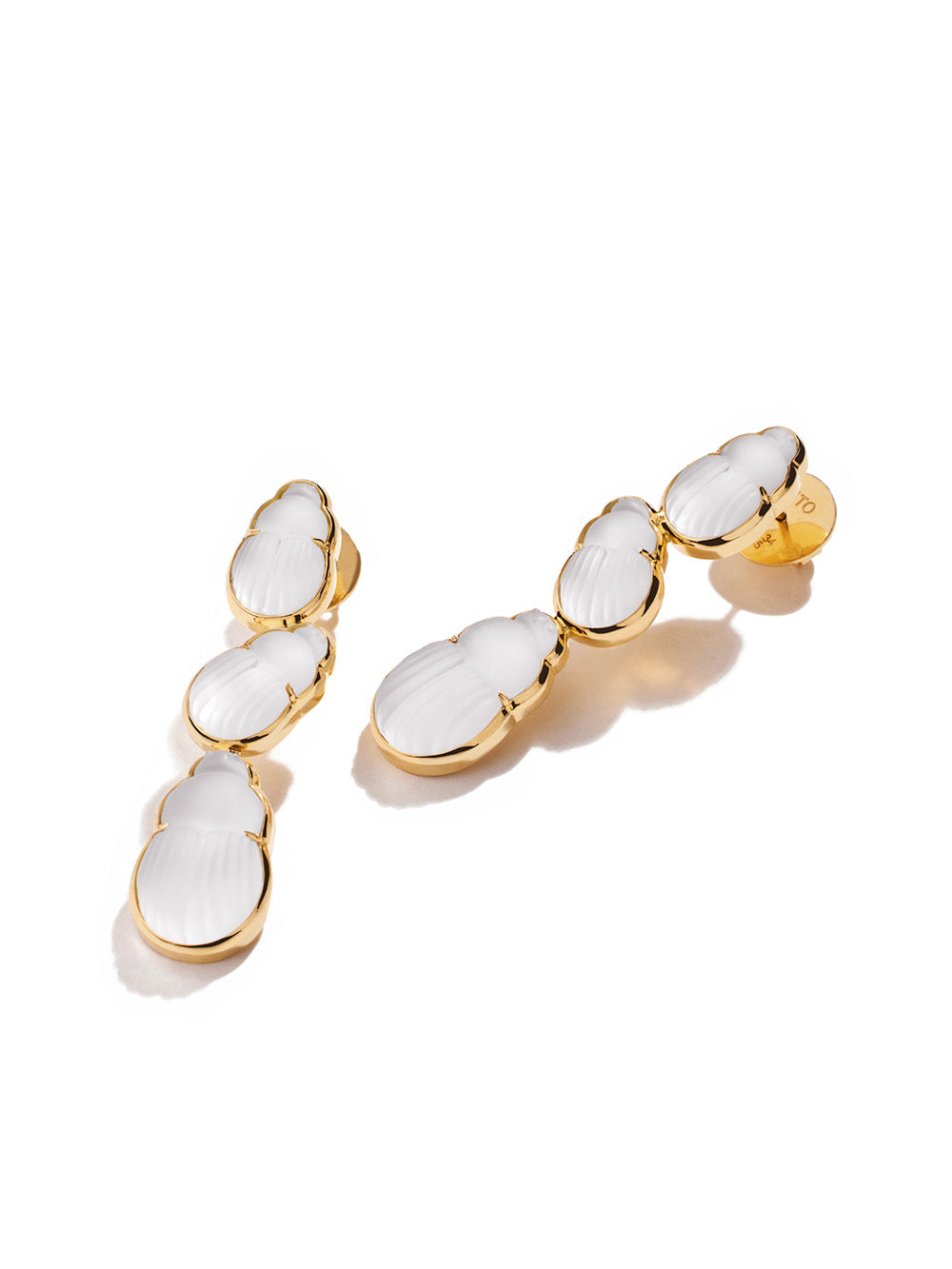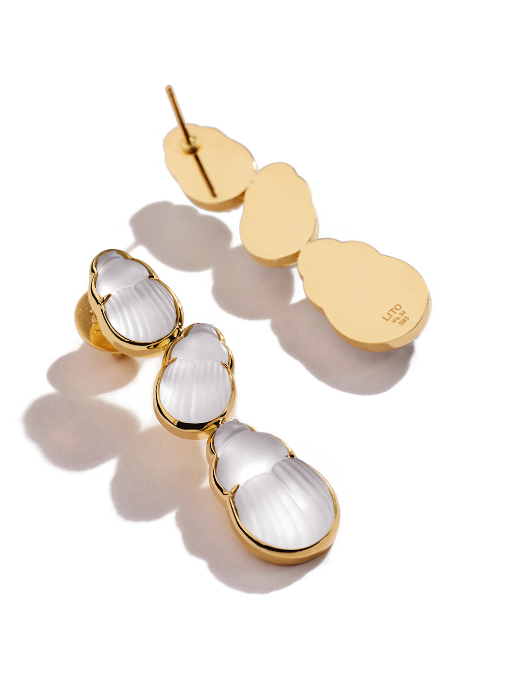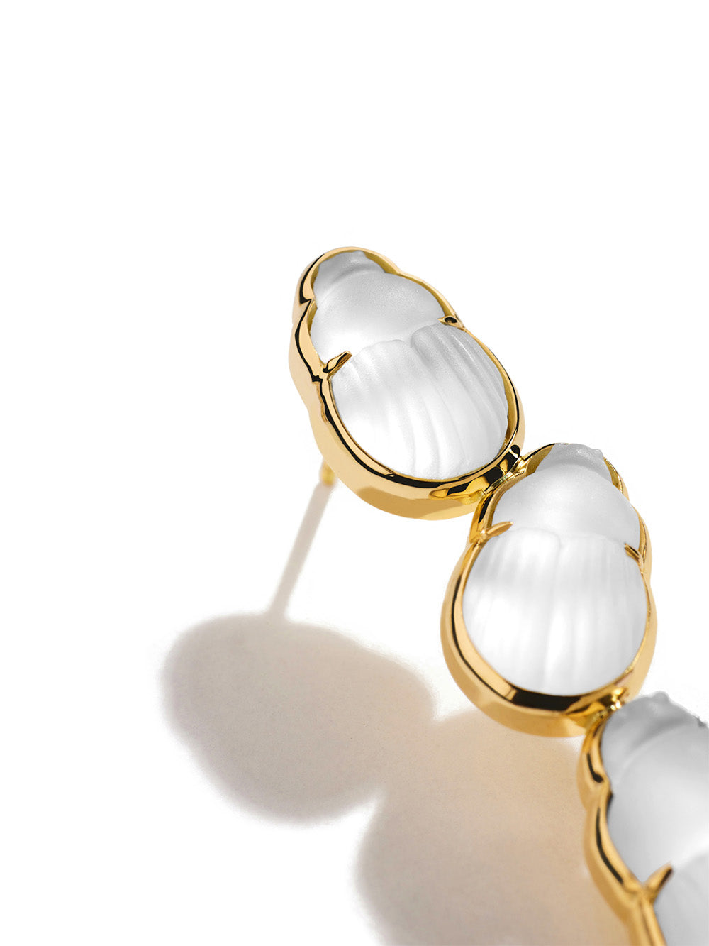 Boucles d'Oreilles Bianca signées Lito confectionnées en nacre taillée en forme de scarabées, le tout monté sur de l'or jaune 14 carats. Une paire de boucles d'oreilles délicate et originale.