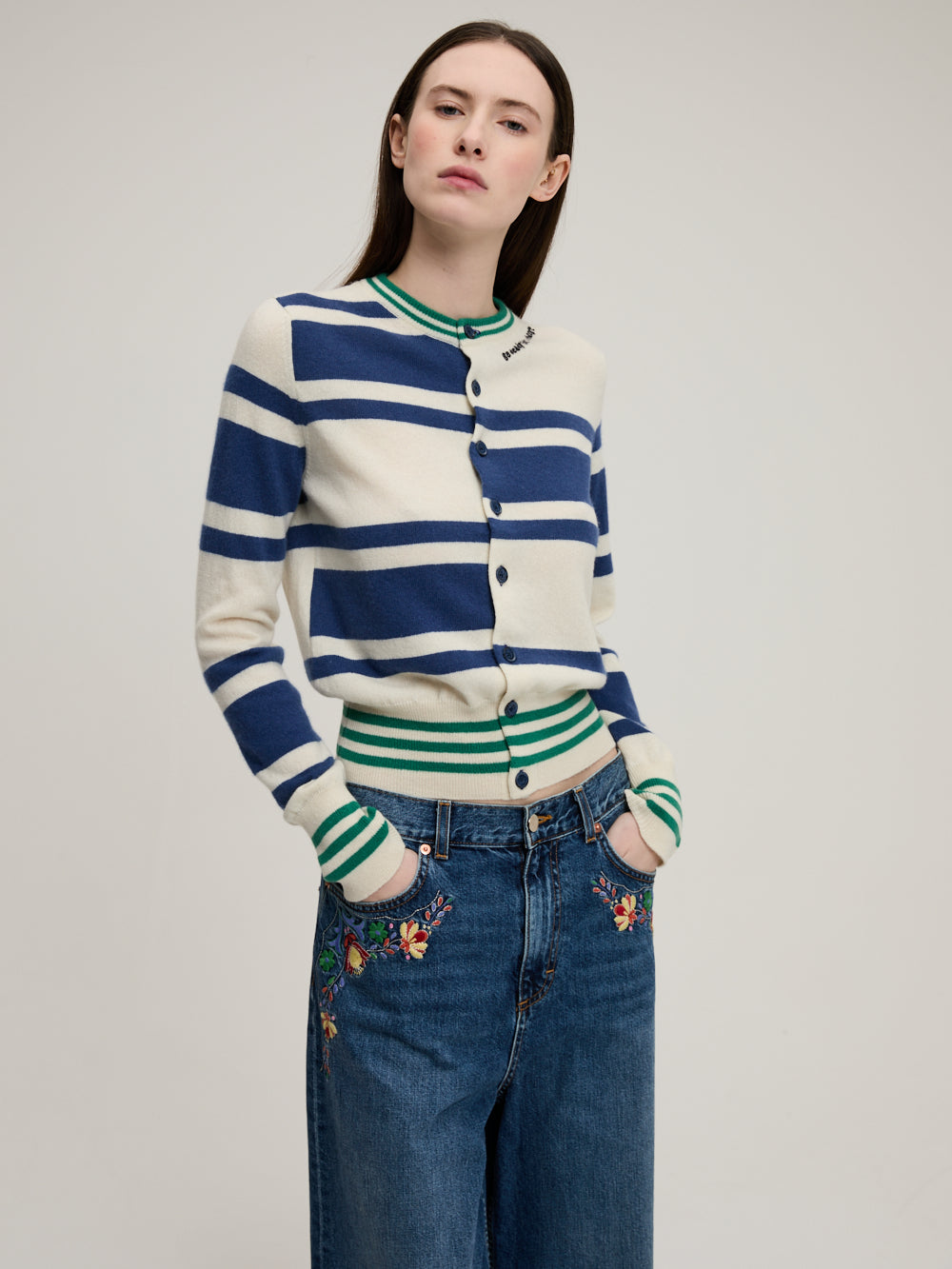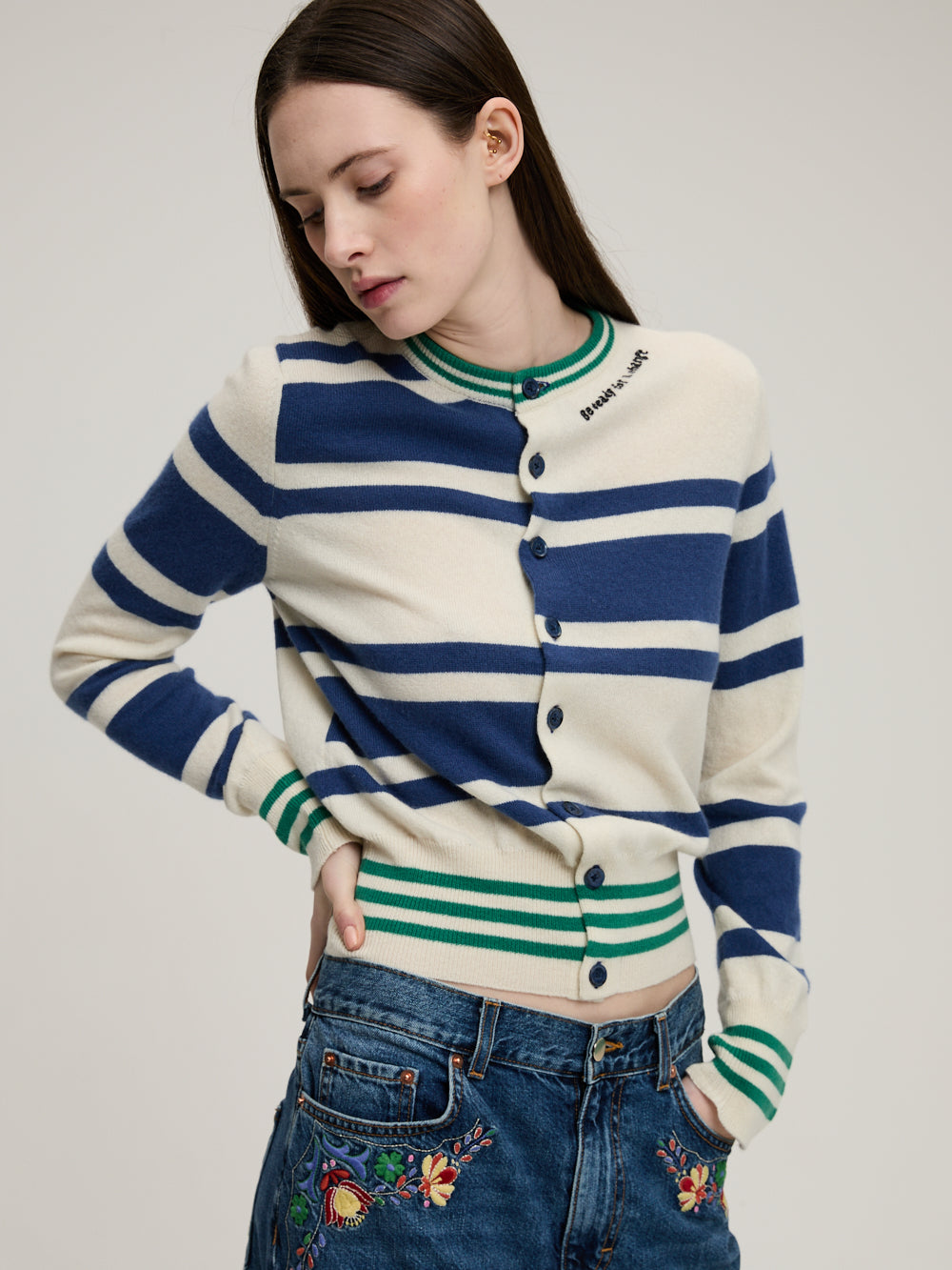 Cardigan Décalé signé Monoki confectionné en cachemire aux rayures blanc et bleu décalées ainsi que des rayures vertes. Un cardigan boutonné sur le devant au col rond brodé de l'inscription "Be ready for a change".