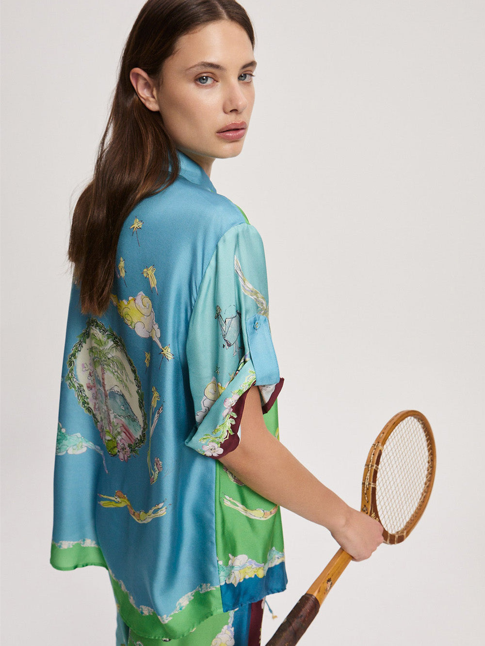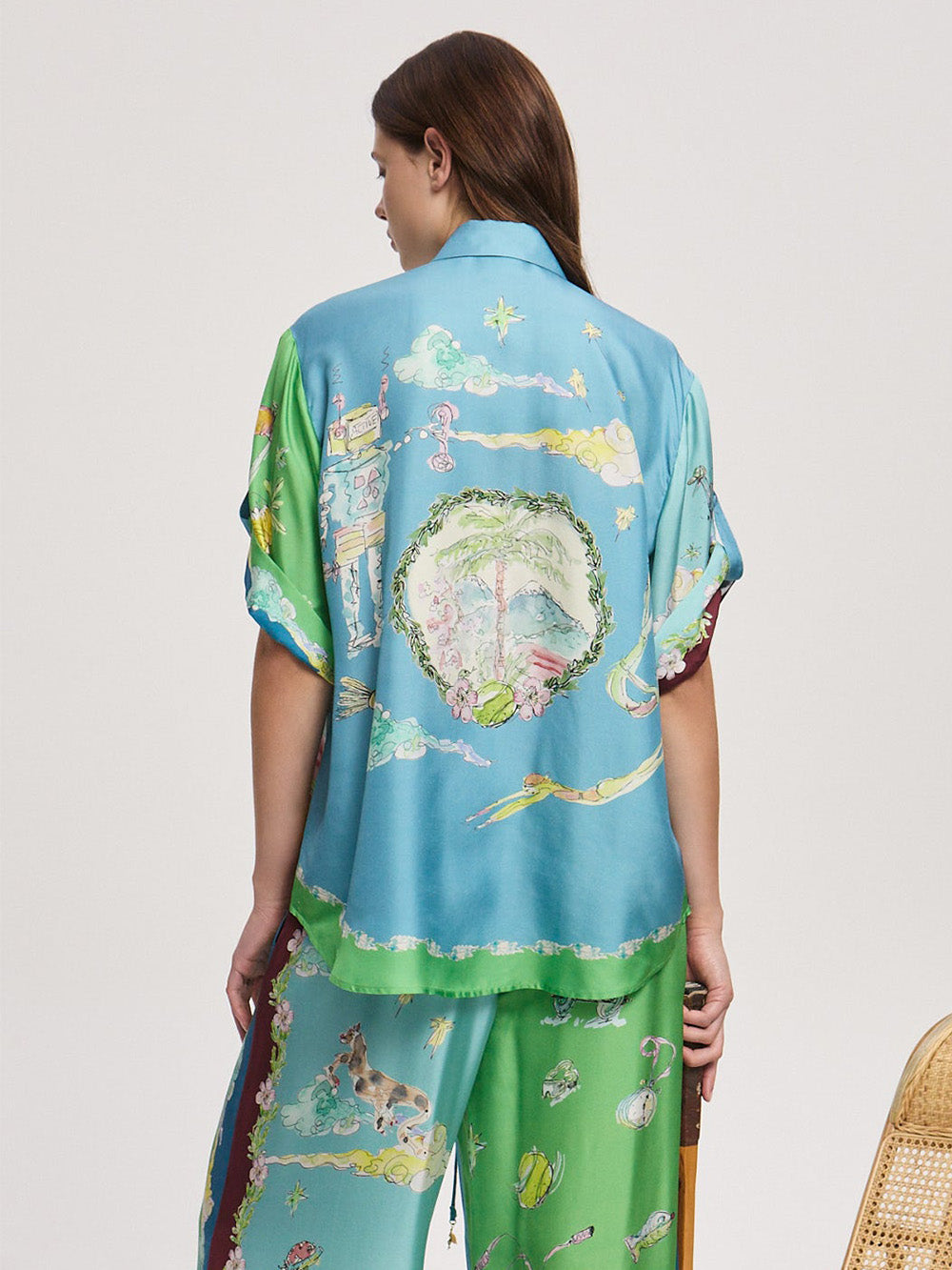 Chemise Daria signé Alémais confectionné en soie bleu et vert imprimé de motifs sur le thème du voyage. Imprimé dessiné par l'artiste Anouk Colantoni dans un style d'aquarelle aux couleurs douces.