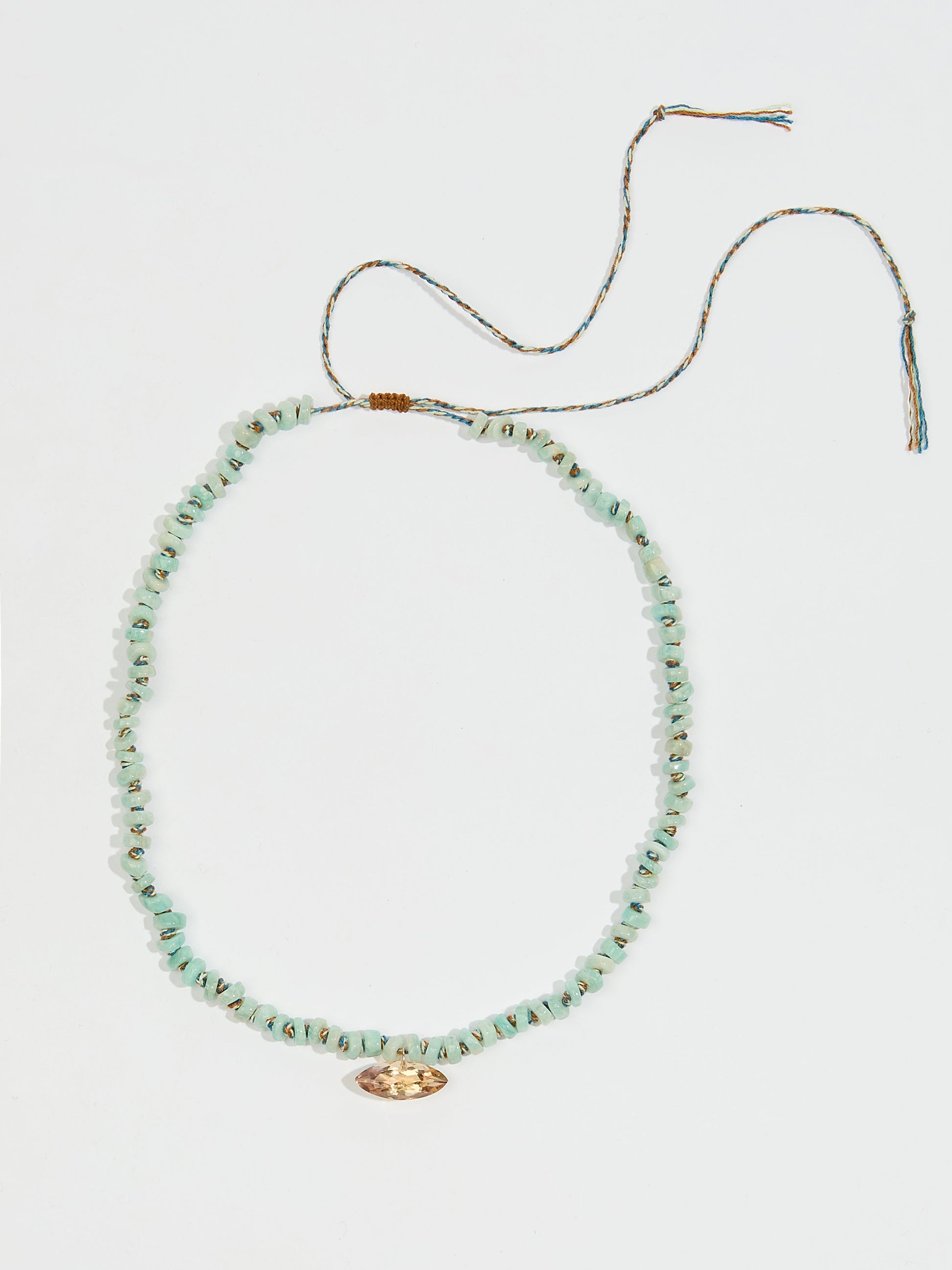 Collier Léa signé Tamara Taichman confectionné en perles d'amazonite agrémenté d'une amétrine dans les tons jaune, taillée de forme ovale, montées sur des petits anneaux en or 9 carats.