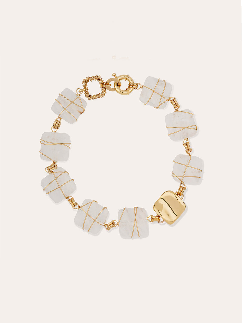 Collier Rainbow Square signé Gas Bijoux. La collection Rainbow se réinvente en mêlant ses lignes iconiques à d'autres créations emblématiques. Entre structure et fluidité, e collier ras-de-cou doré à l'or fin associe des pierres de cristal de roche aux lignes carrées, reliées par des anneaux finement gravés et une pièce dorée sculpturale évoquant le mouvement délicat d'une vague.