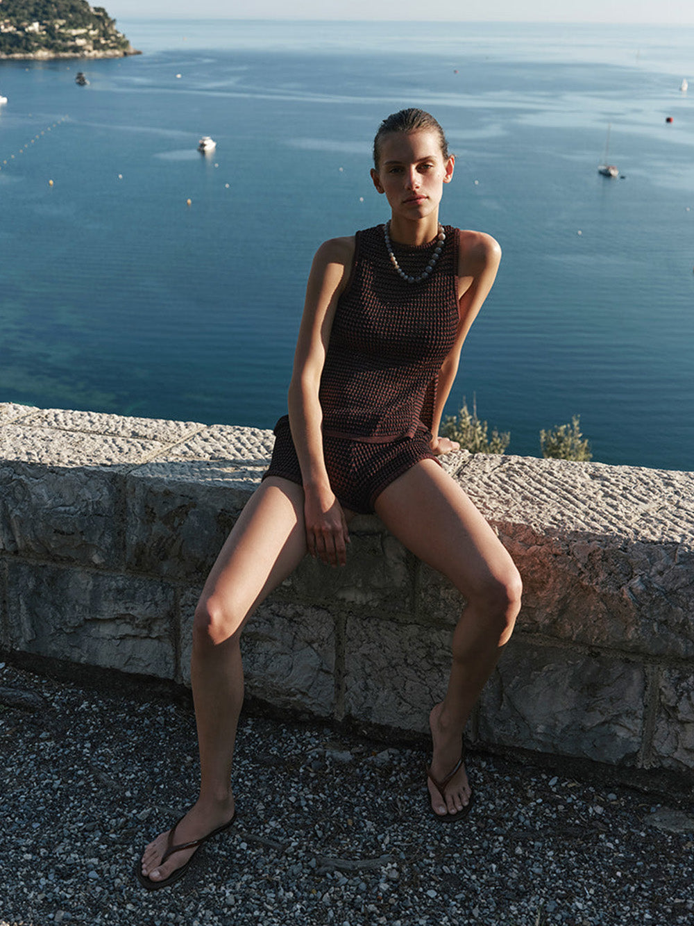 Top Asher signé Bond-eye confectionné dans une maille ajourée marron et noir. Un débardeur aux fentes sur les côtés, le vêtement parfait pour passer de la plage à la ville.